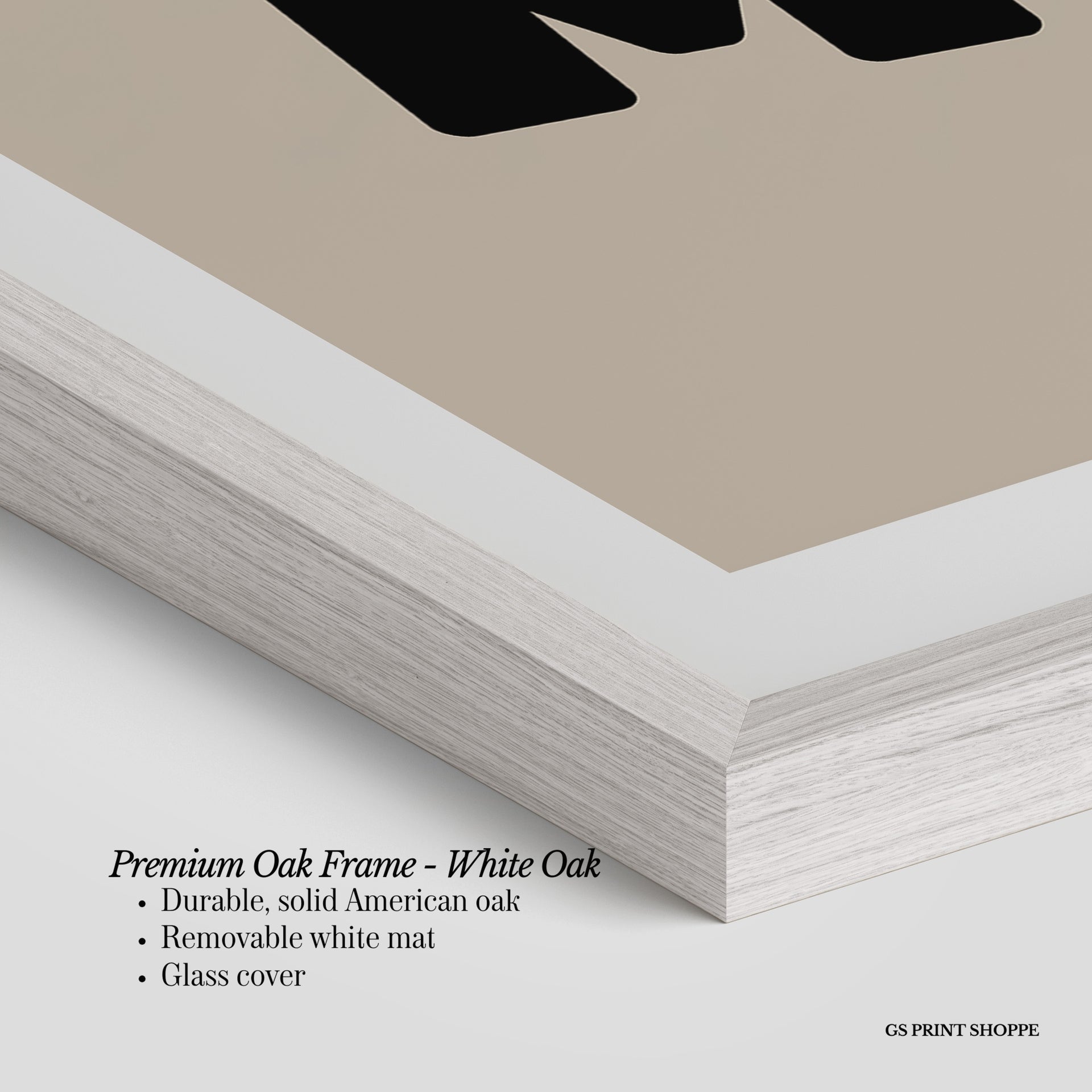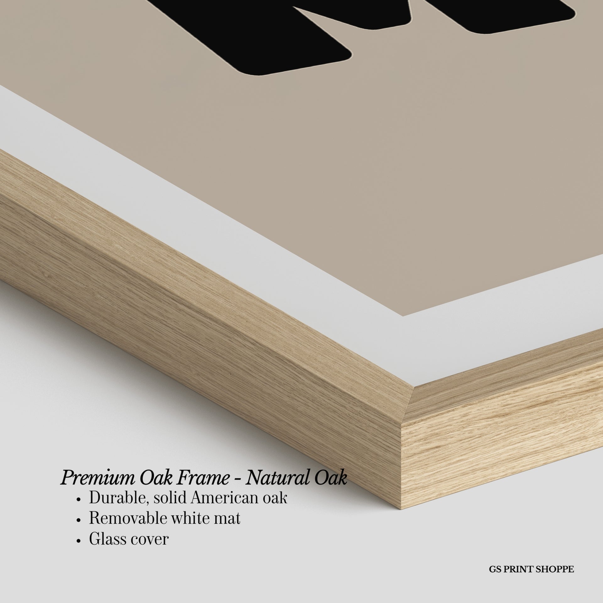 Premium Oak Frame: Our premium oak frame is crafted from solid American oak, offering a warm, natural feel with a high-end finish. We complete this elevated offering with a bright white removable mat and real glass for a versatile and polished look.