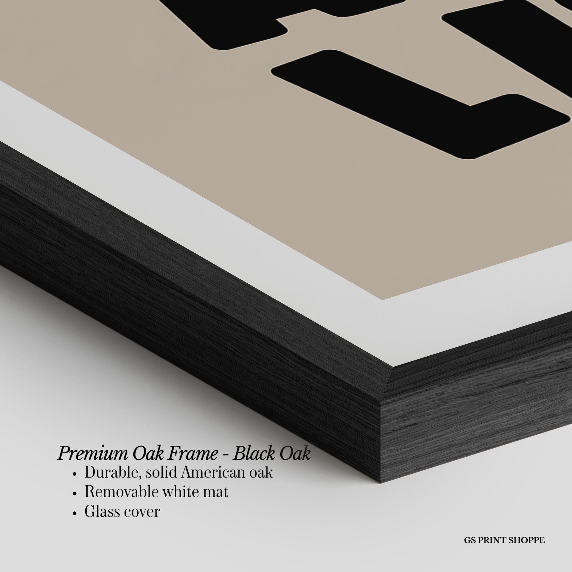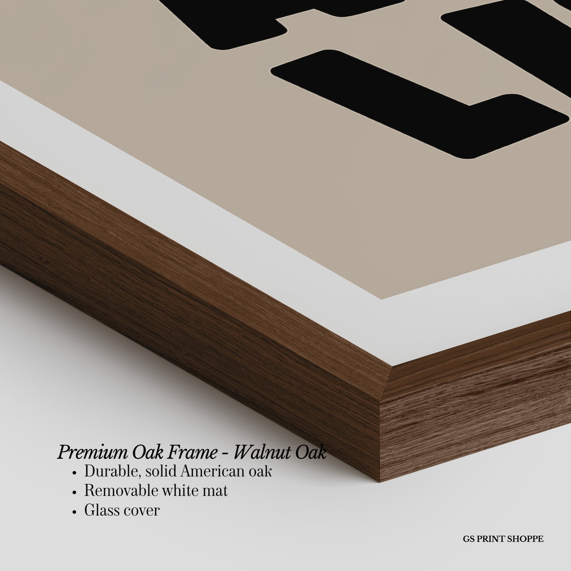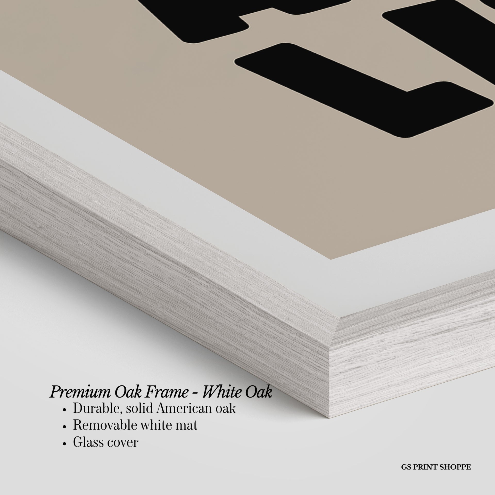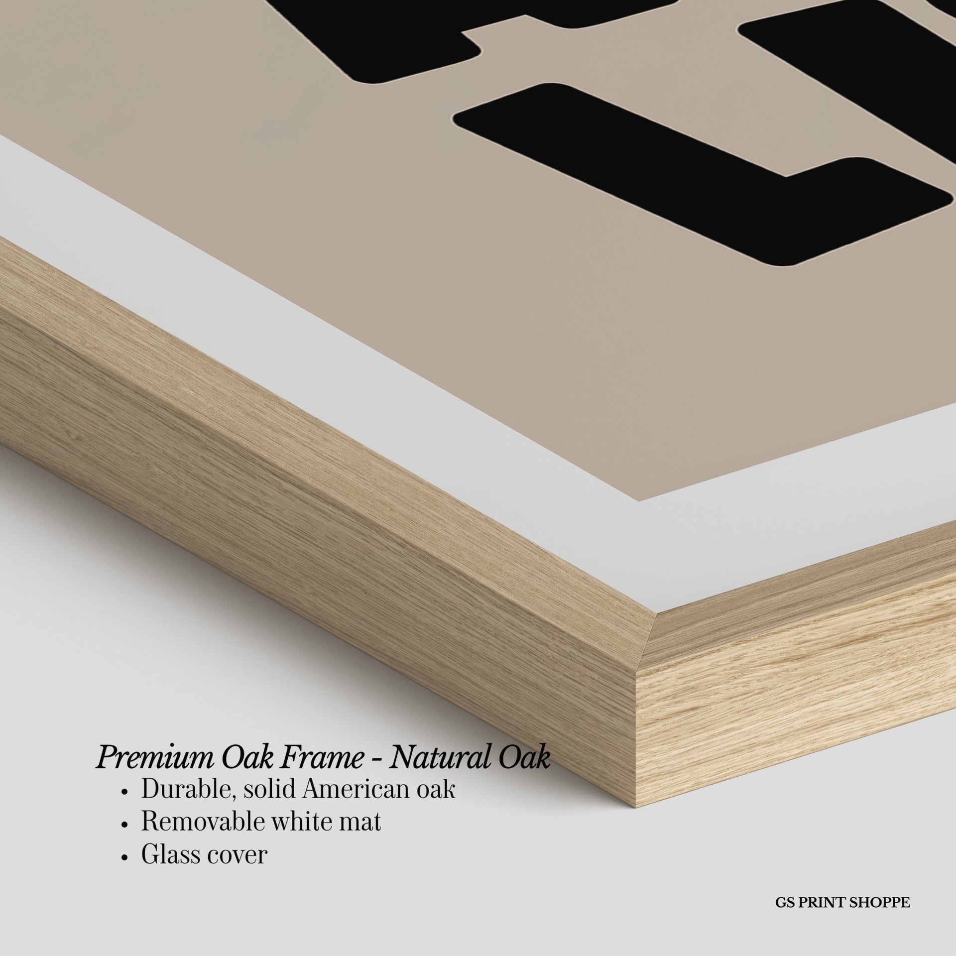 Premium Oak Frame: Our premium oak frame is crafted from solid American oak, offering a warm, natural feel with a high-end finish. We complete this elevated offering with a bright white removable mat and real glass for a versatile and polished look.