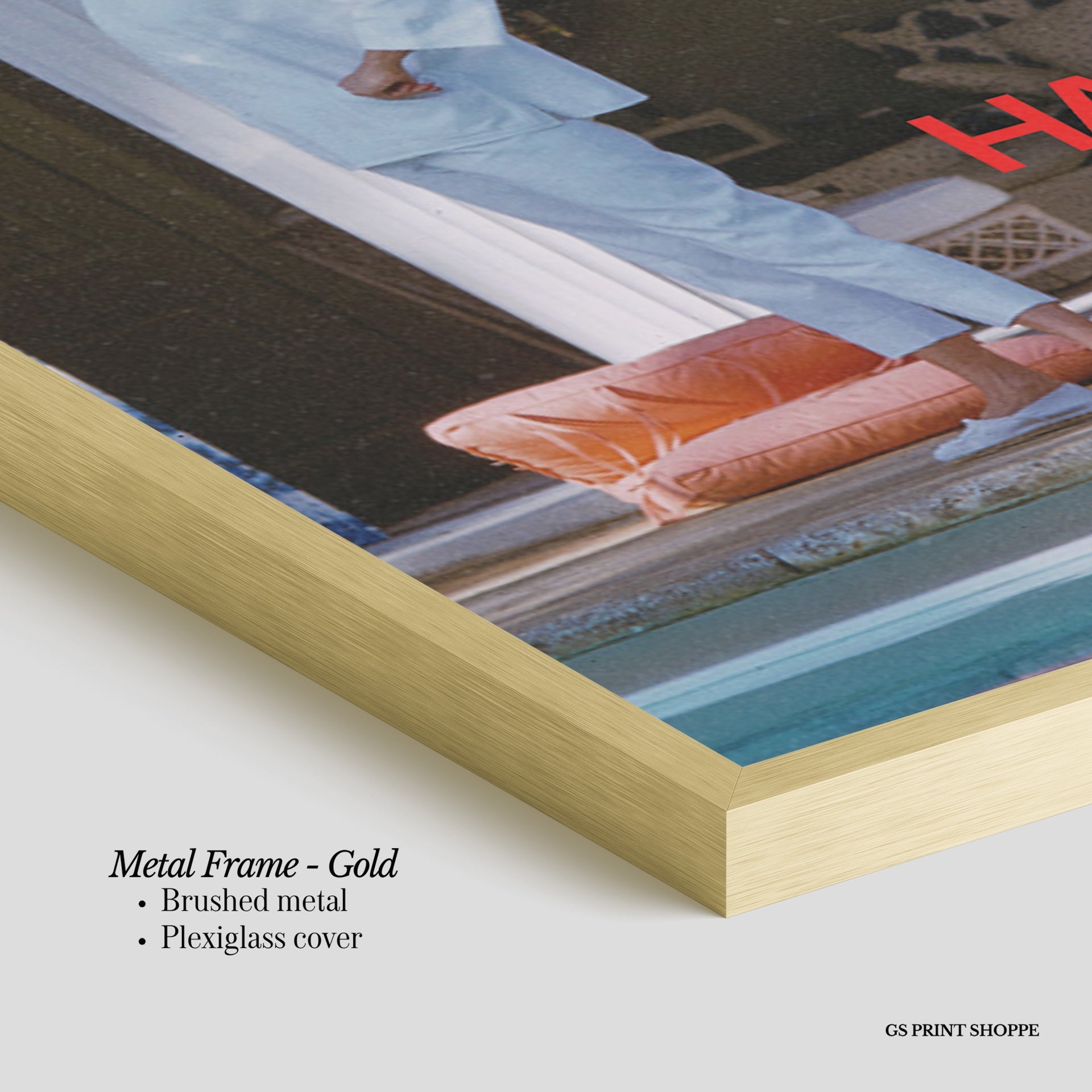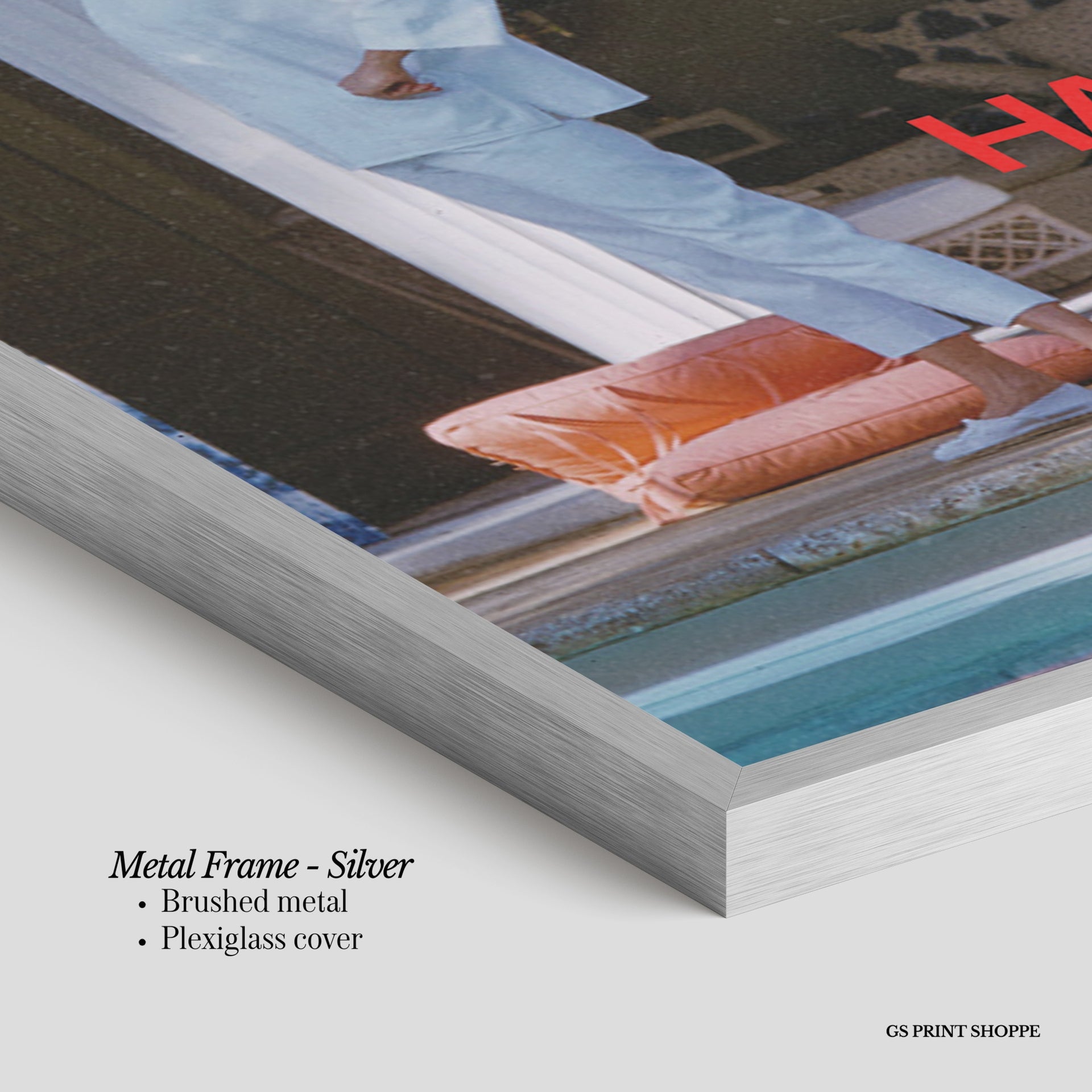 Metal Frame: Sleek and modern, our metal frame is crafted with brushed metal for a polished finish. It comes with durable plexiglass and sturdy metal hangers for horizontal or vertical display.