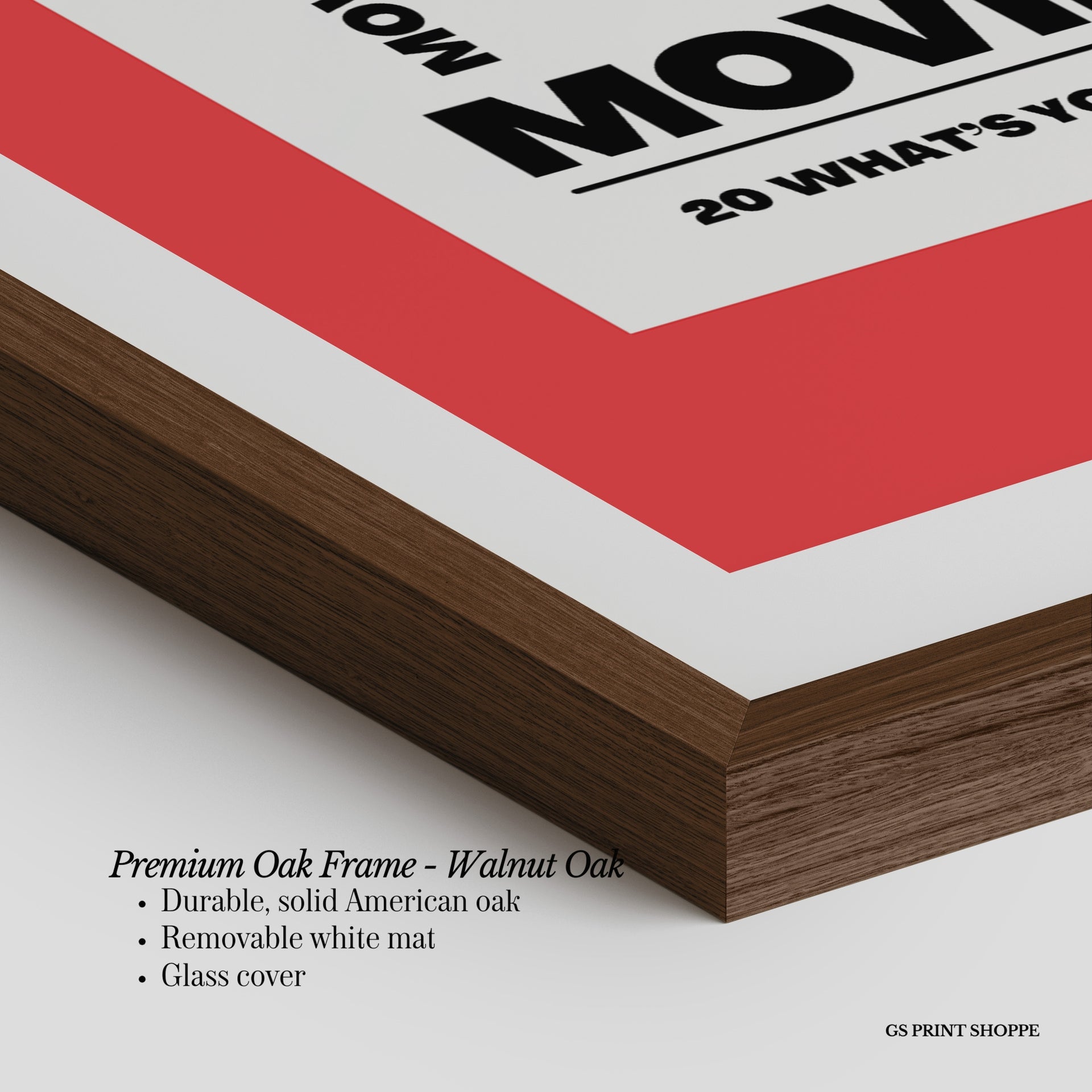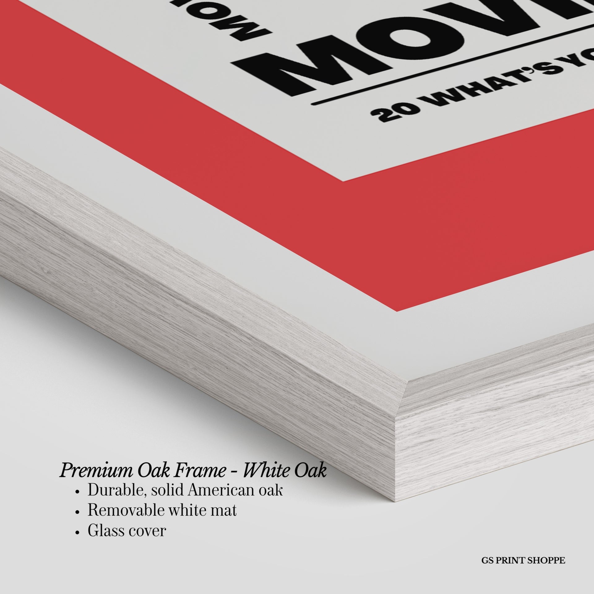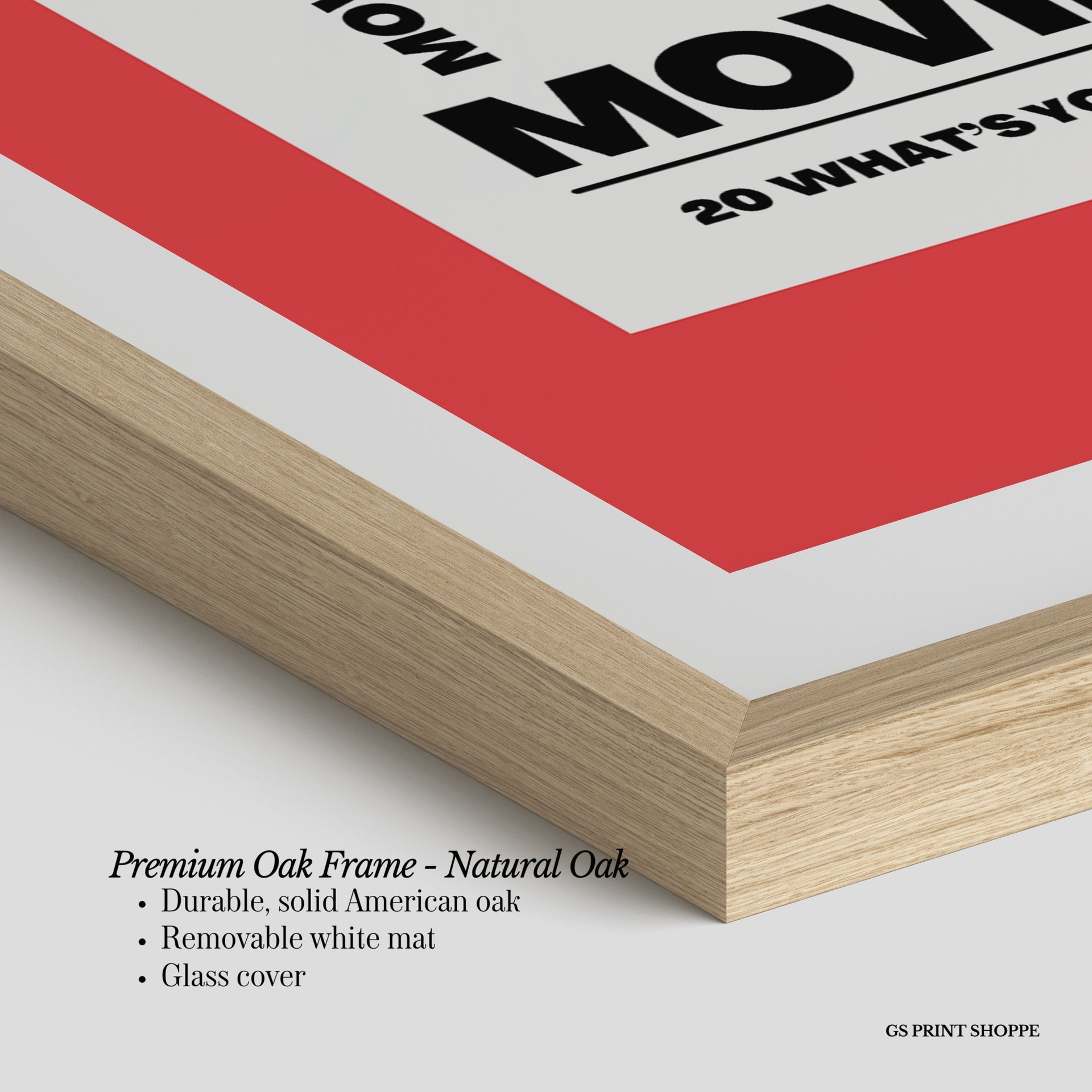 Premium Oak Frame: Our premium oak frame is crafted from solid American oak, offering a warm, natural feel with a high-end finish. We complete this elevated offering with a bright white removable mat and real glass for a versatile and polished look.