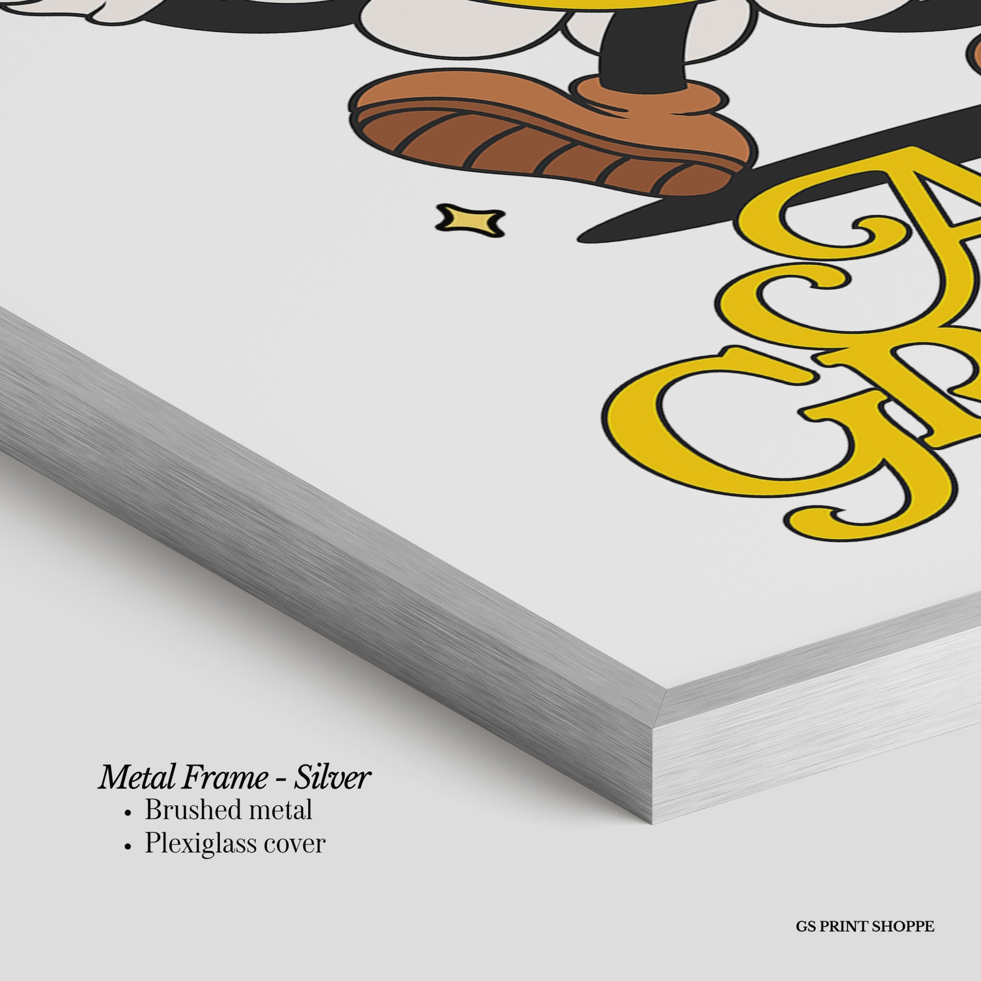 Metal Frame: Sleek and modern, our metal frame is crafted with brushed metal for a polished finish. It comes with durable plexiglass and sturdy metal hangers for horizontal or vertical display.