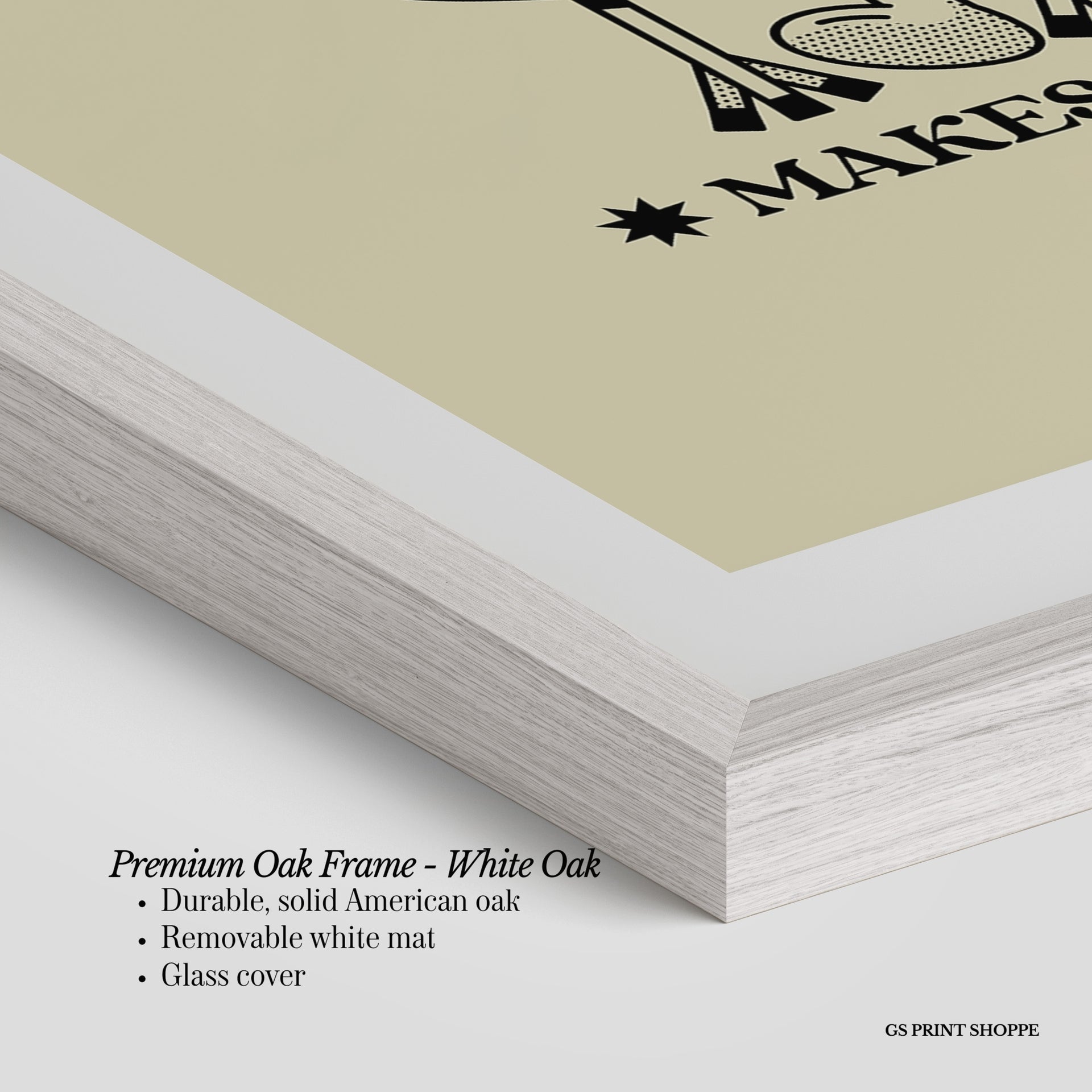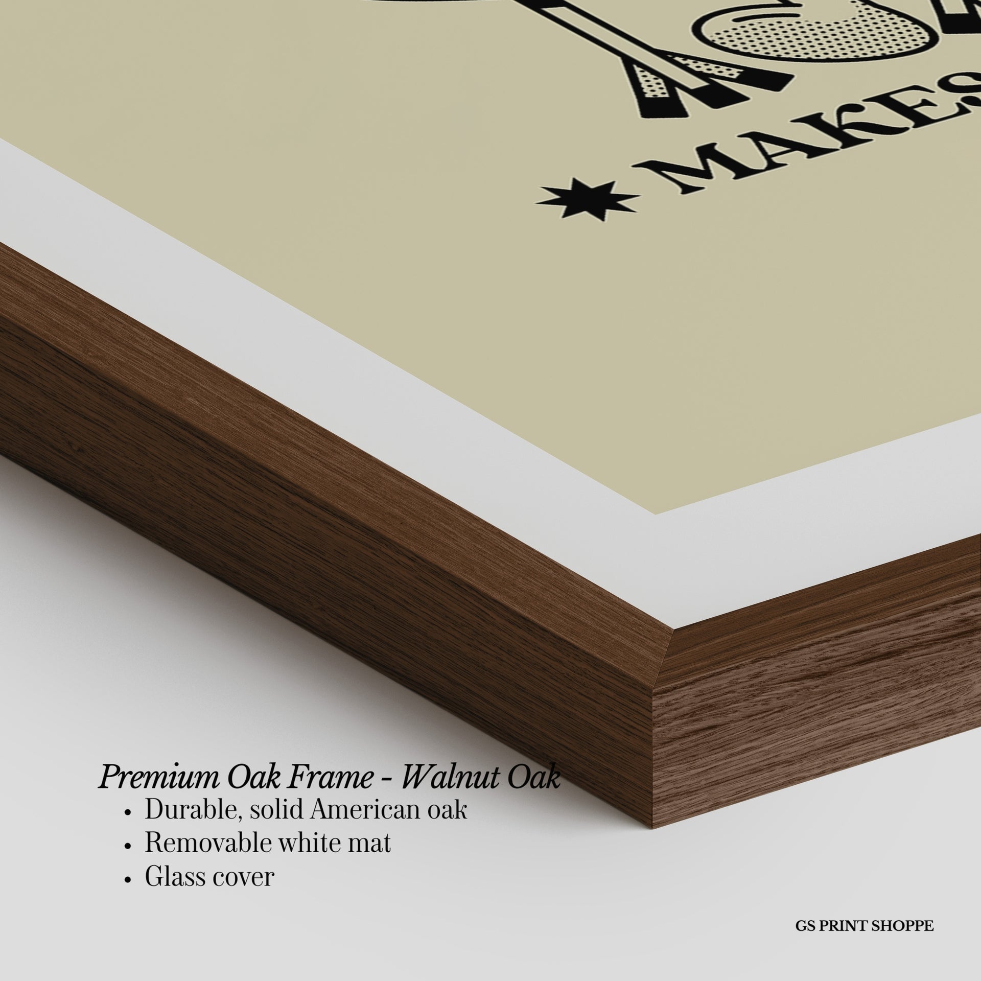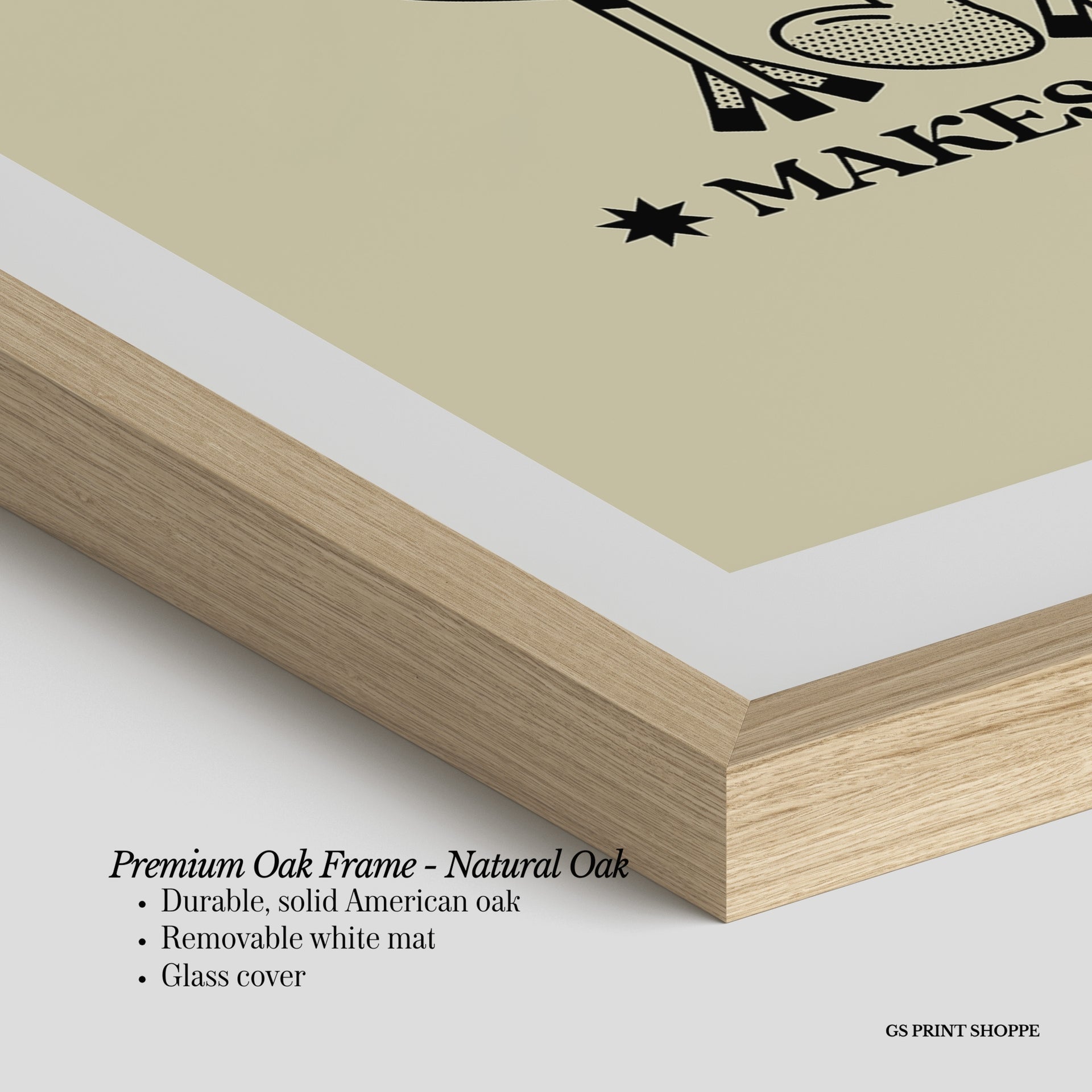 Premium Oak Frame: Our premium oak frame is crafted from solid American oak, offering a warm, natural feel with a high-end finish. We complete this elevated offering with a bright white removable mat and real glass for a versatile and polished look.