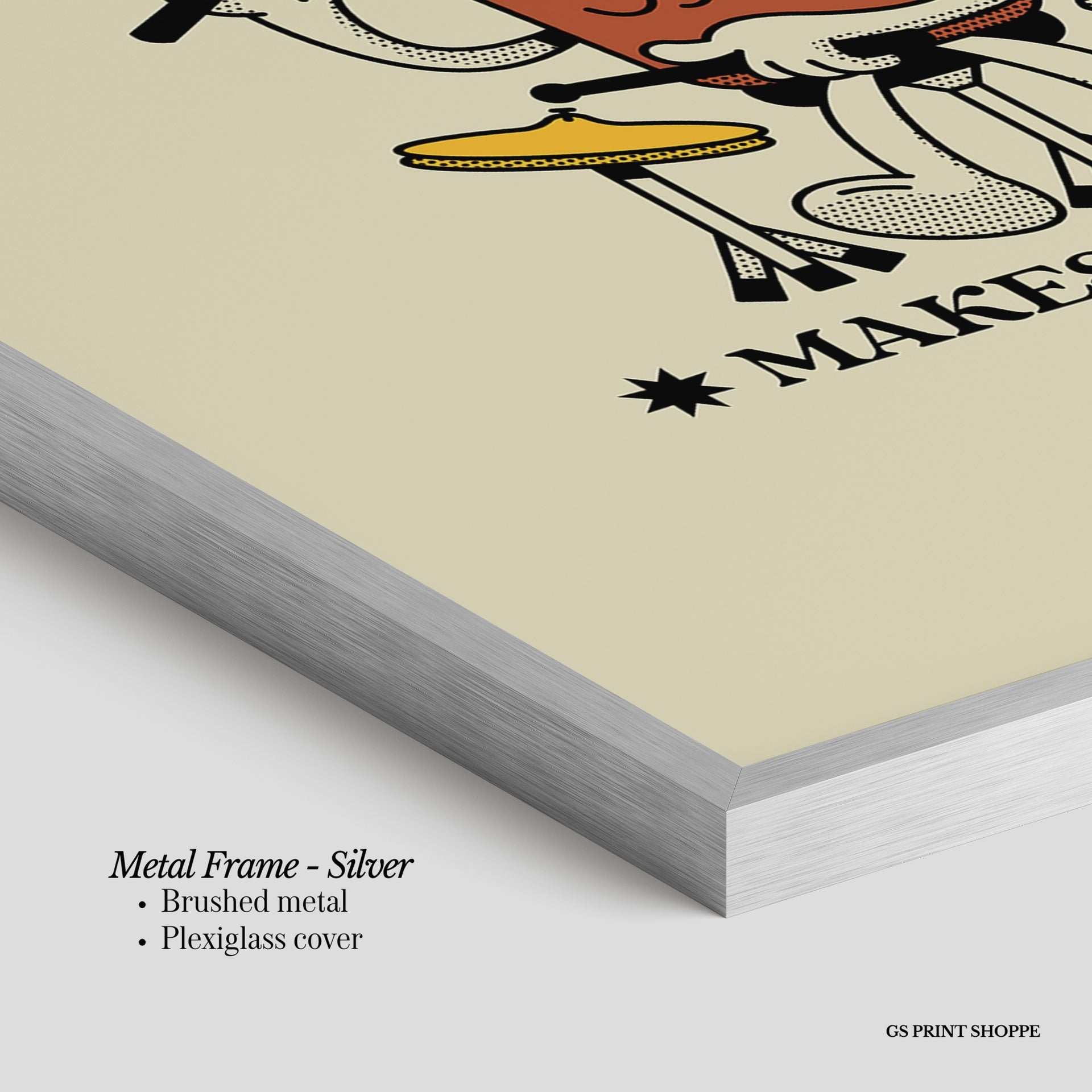 Metal Frame: Sleek and modern, our metal frame is crafted with brushed metal for a polished finish. It comes with durable plexiglass and sturdy metal hangers for horizontal or vertical display.