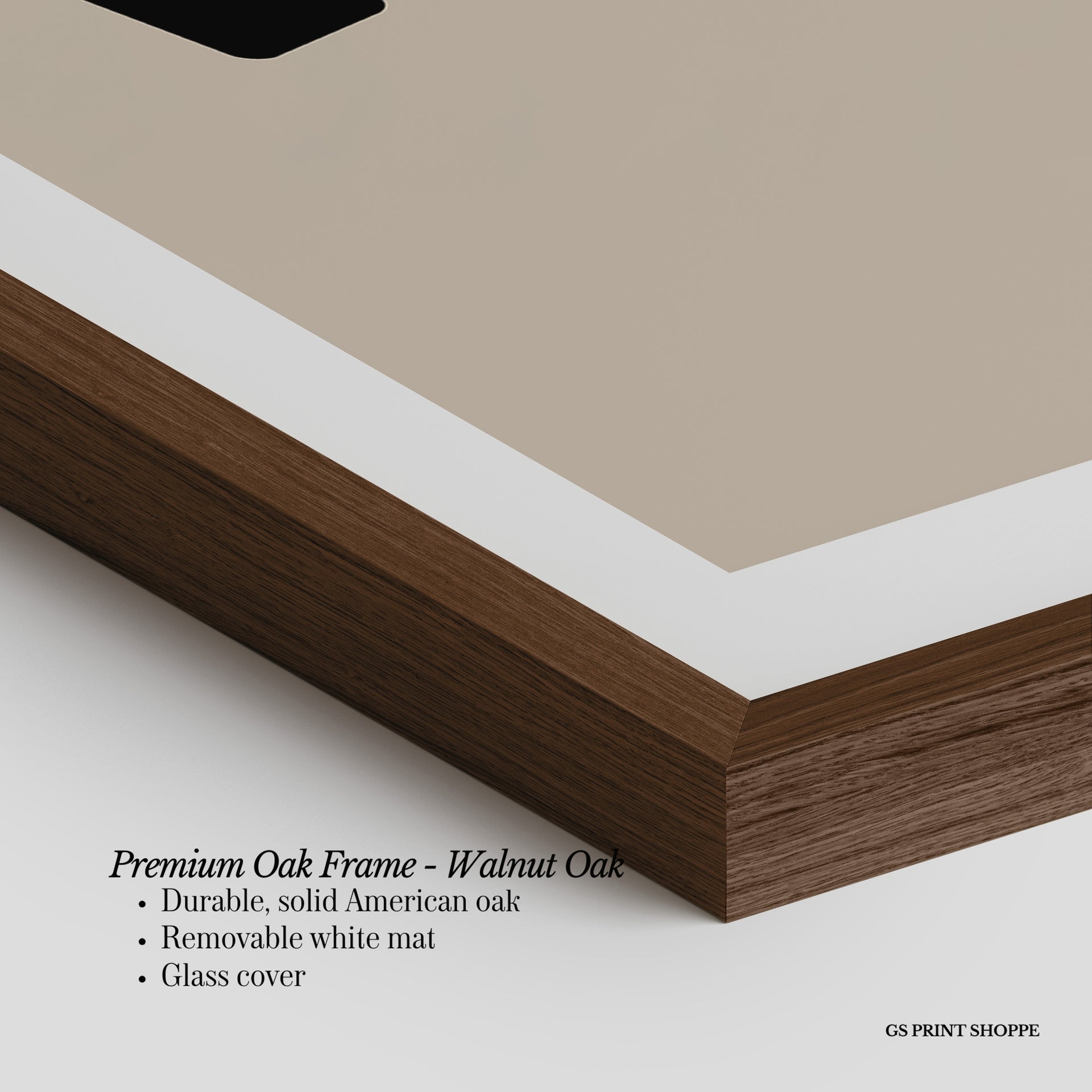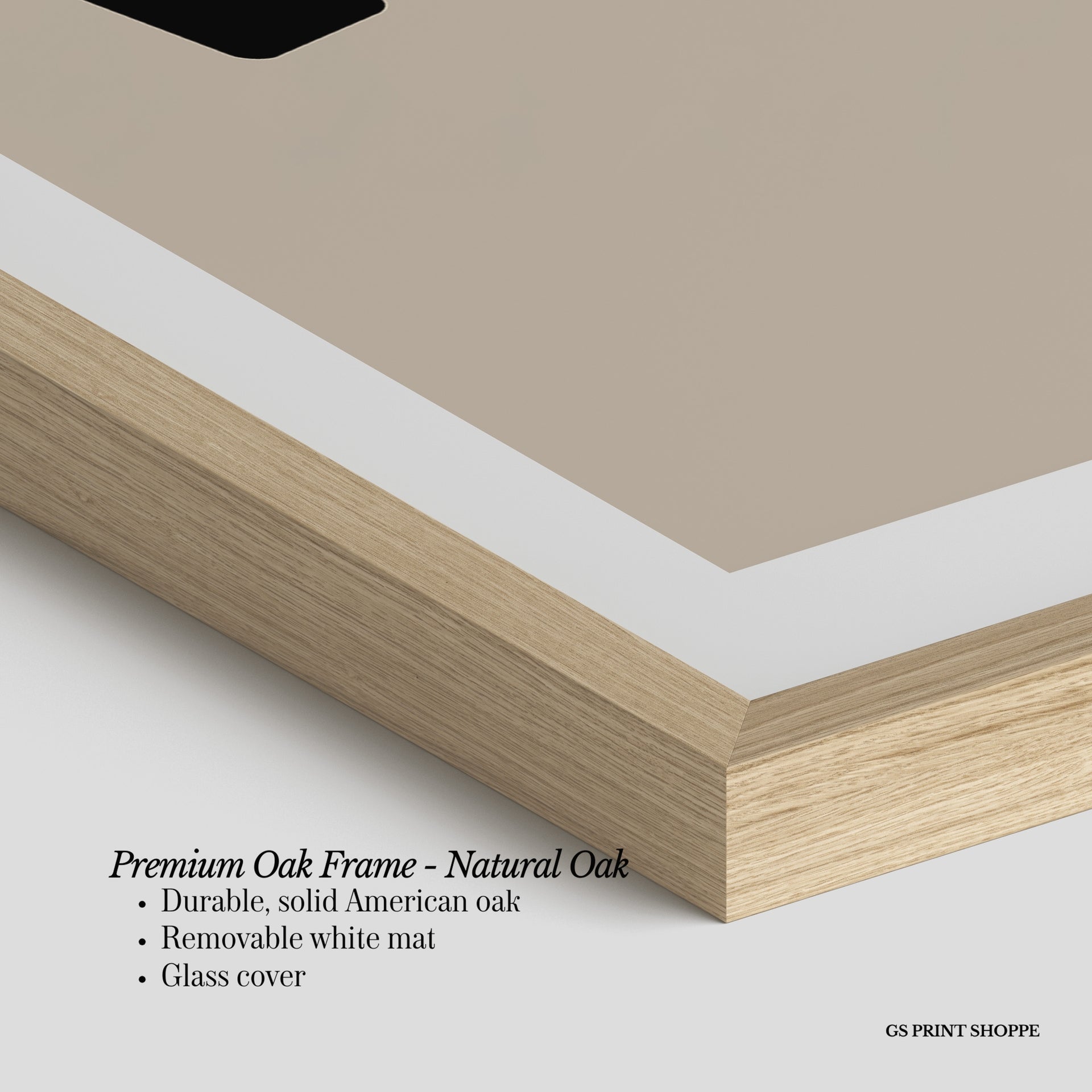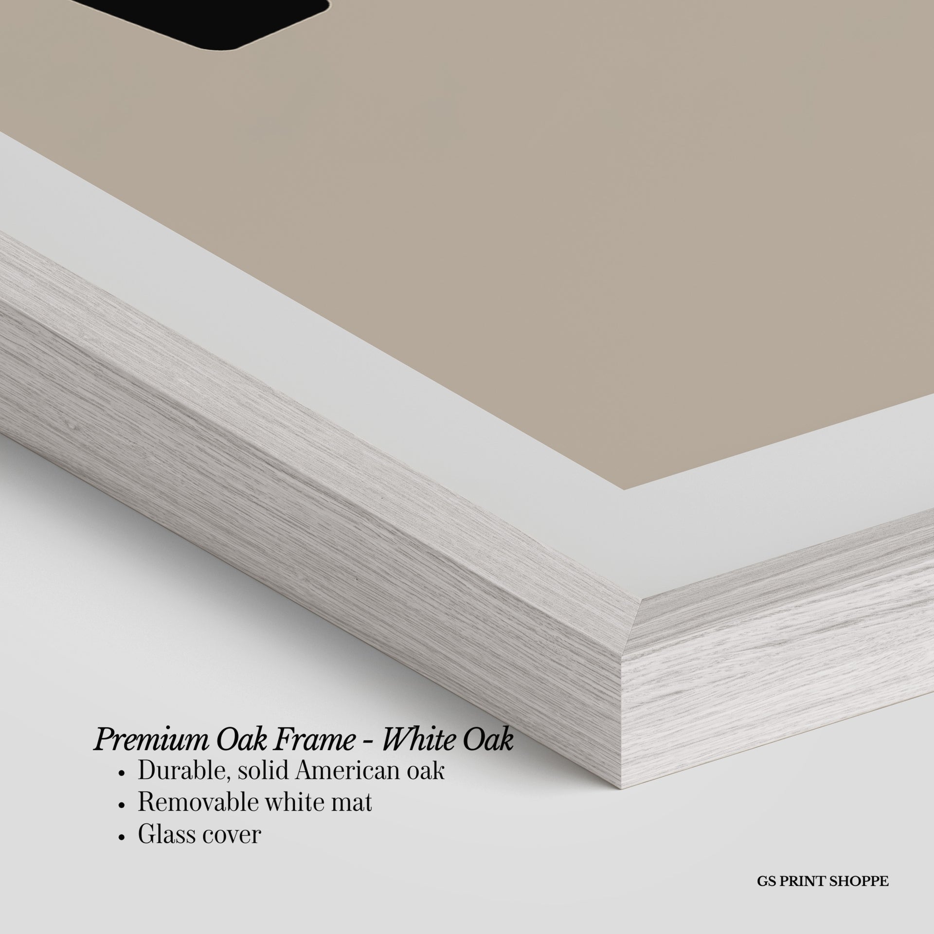Premium Oak Frame: Our premium oak frame is crafted from solid American oak, offering a warm, natural feel with a high-end finish. We complete this elevated offering with a bright white removable mat and real glass for a versatile and polished look.