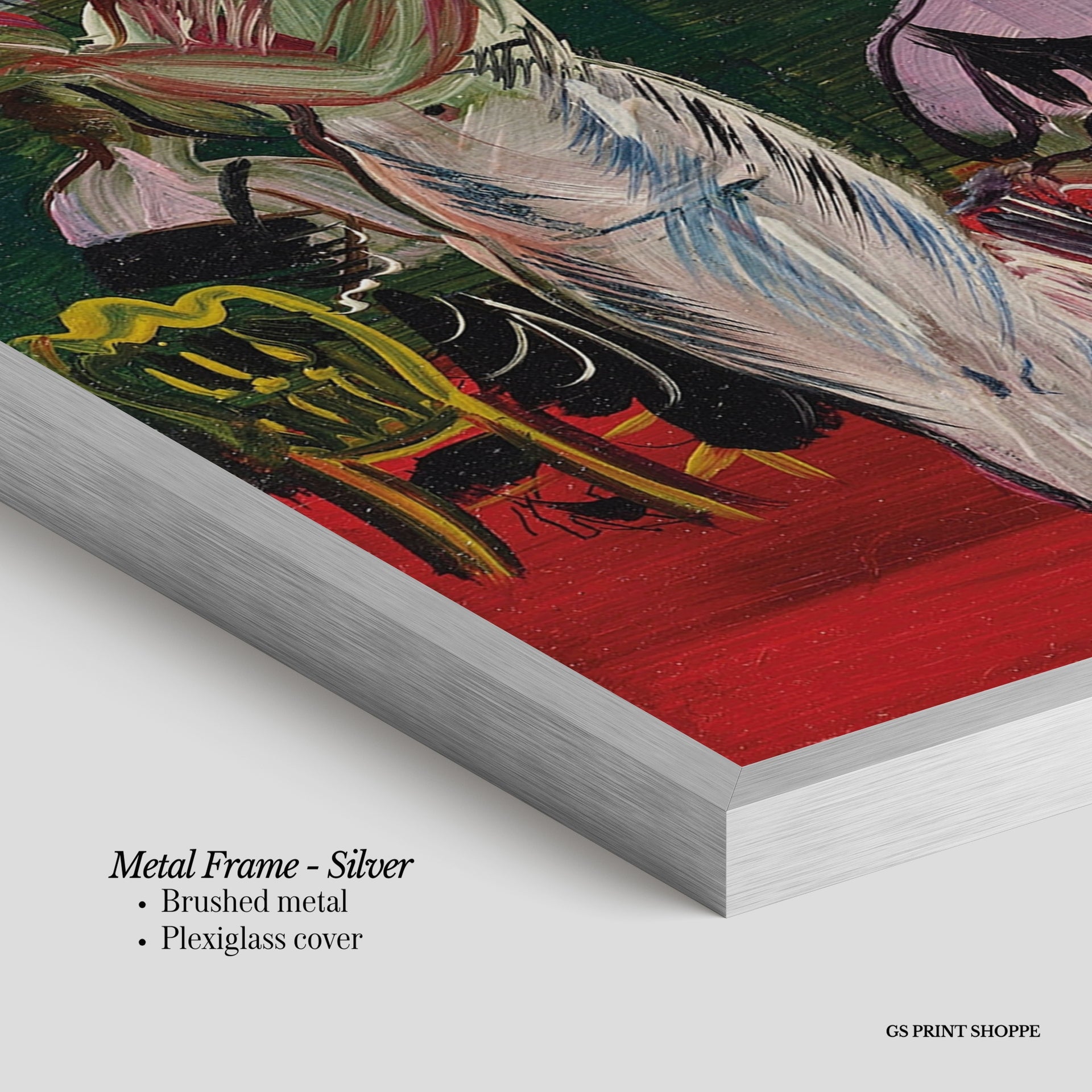 Metal Frame: Sleek and modern, our metal frame is crafted with brushed metal for a polished finish. It comes with durable plexiglass and sturdy metal hangers for horizontal or vertical display.