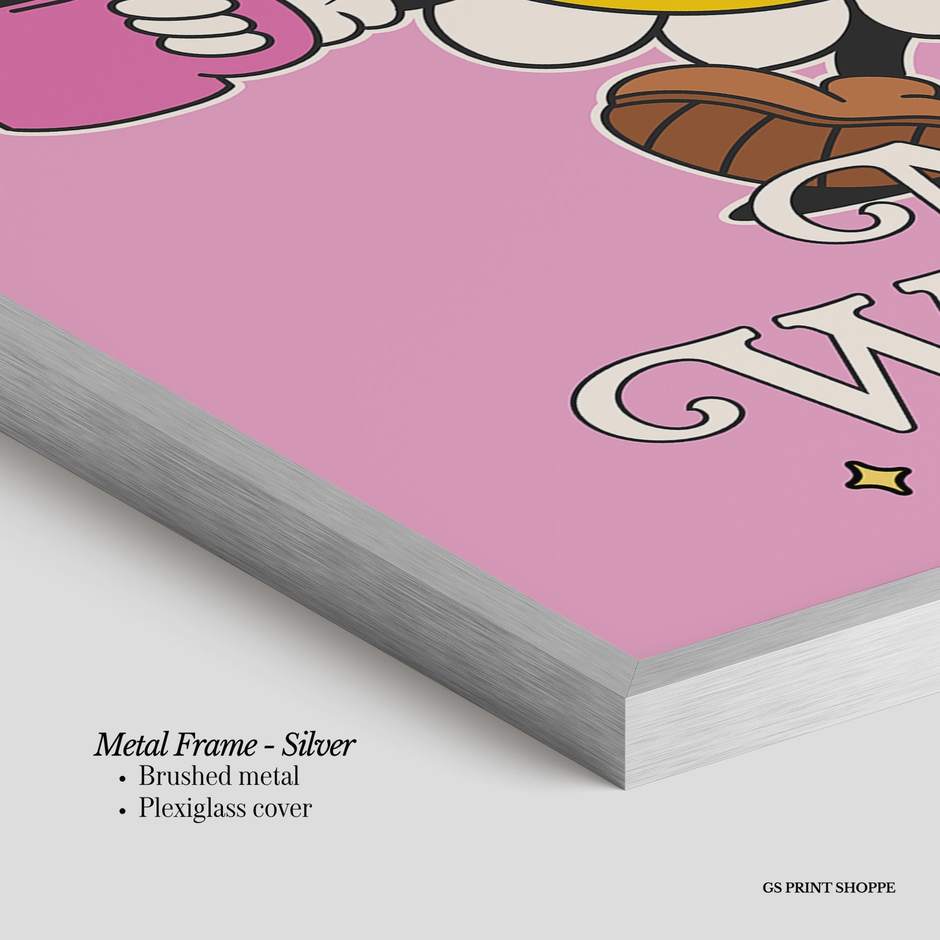 Metal Frame: Sleek and modern, our metal frame is crafted with brushed metal for a polished finish. It comes with durable plexiglass and sturdy metal hangers for horizontal or vertical display.