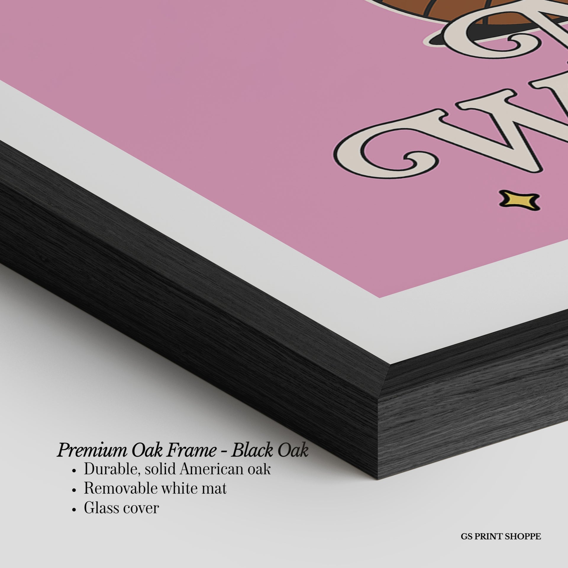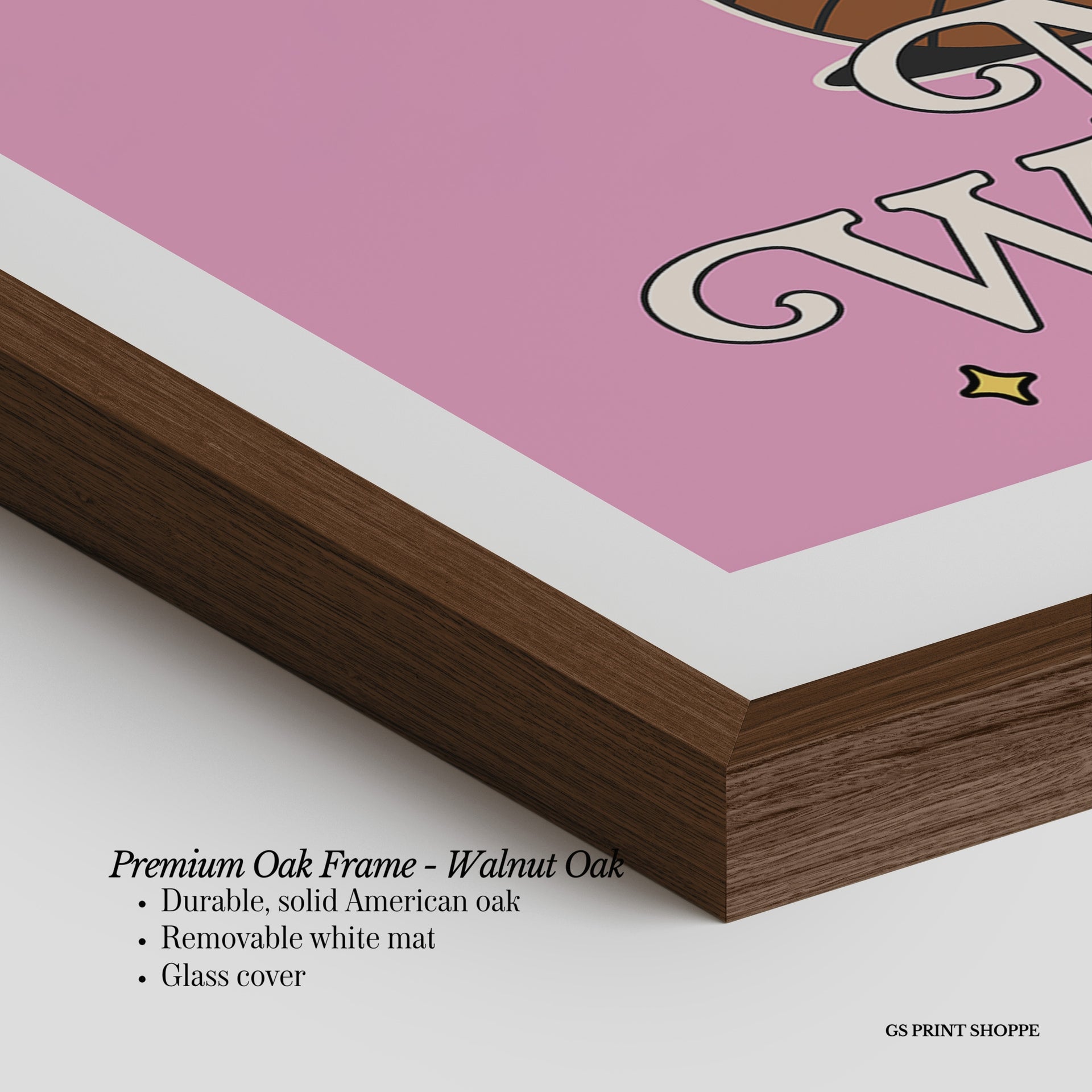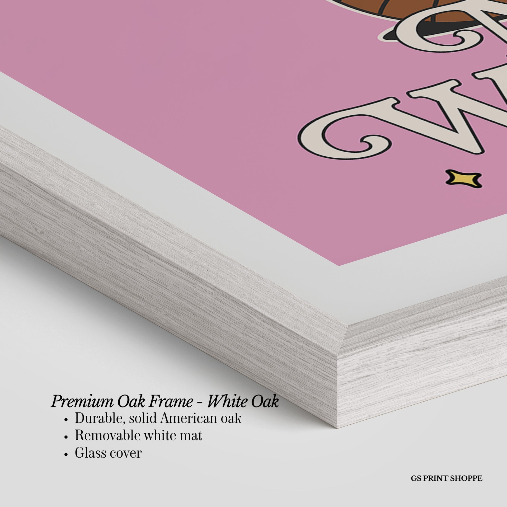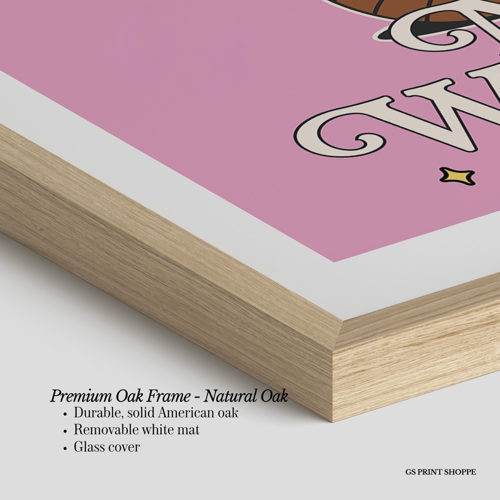 Premium Oak Frame: Our premium oak frame is crafted from solid American oak, offering a warm, natural feel with a high-end finish. We complete this elevated offering with a bright white removable mat and real glass for a versatile and polished look.