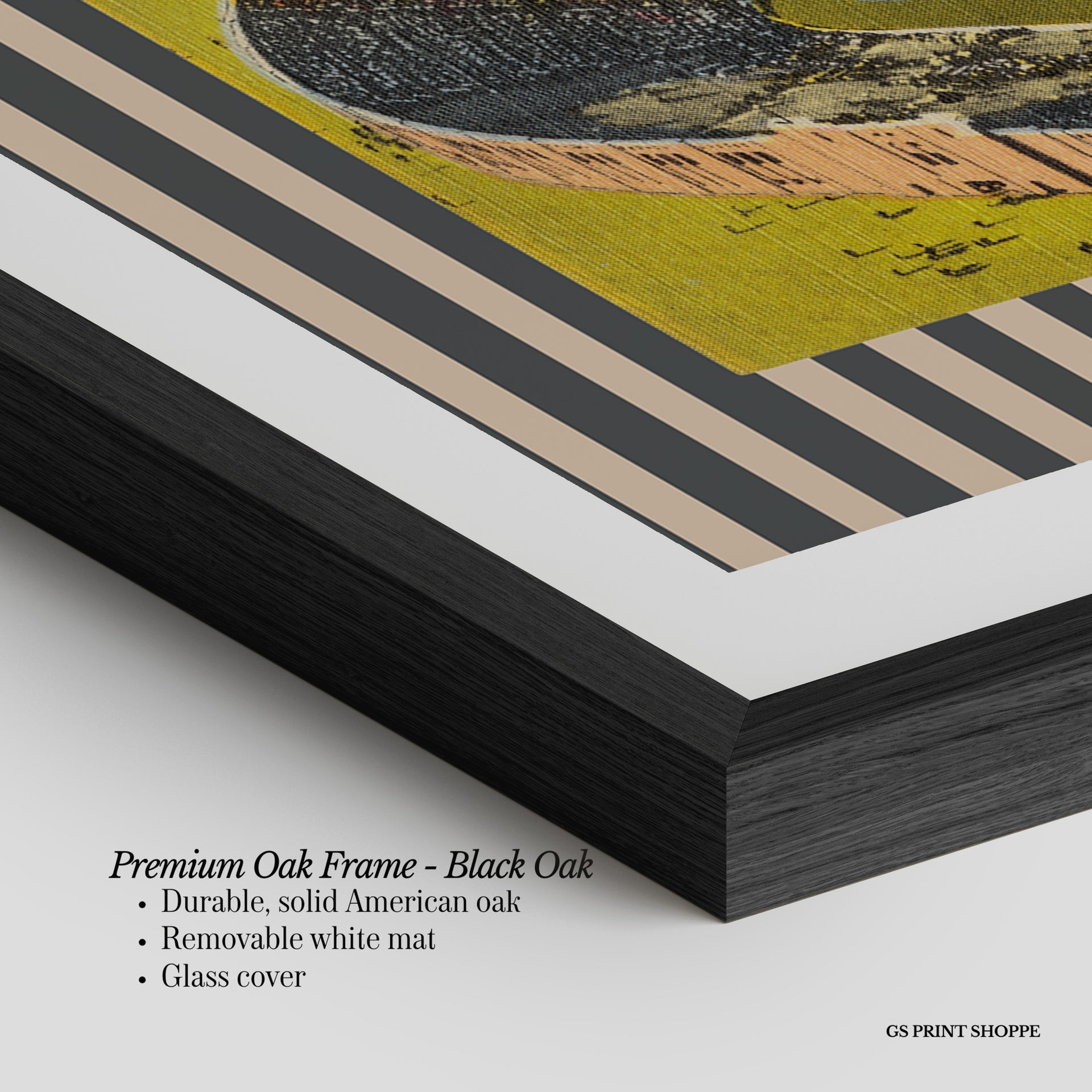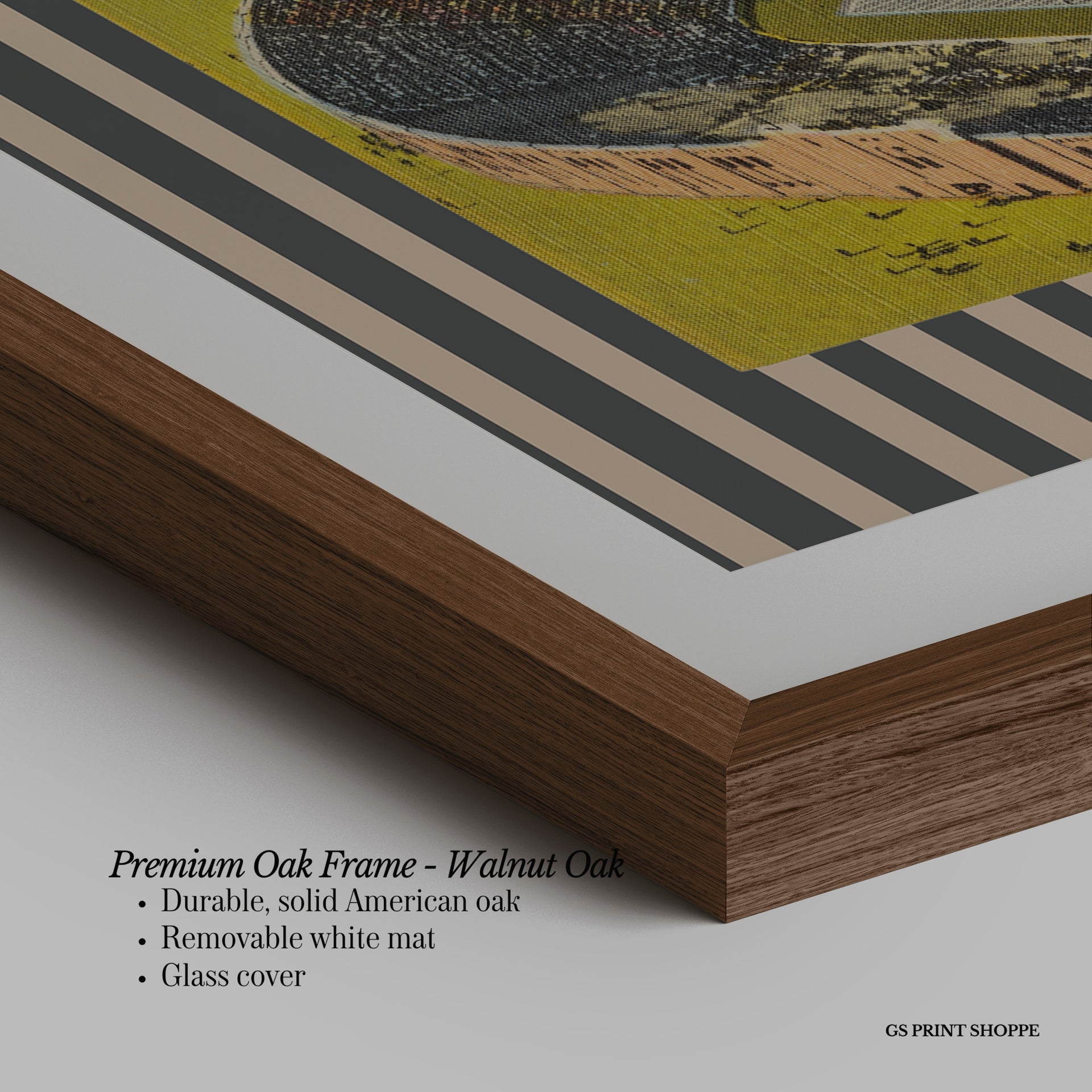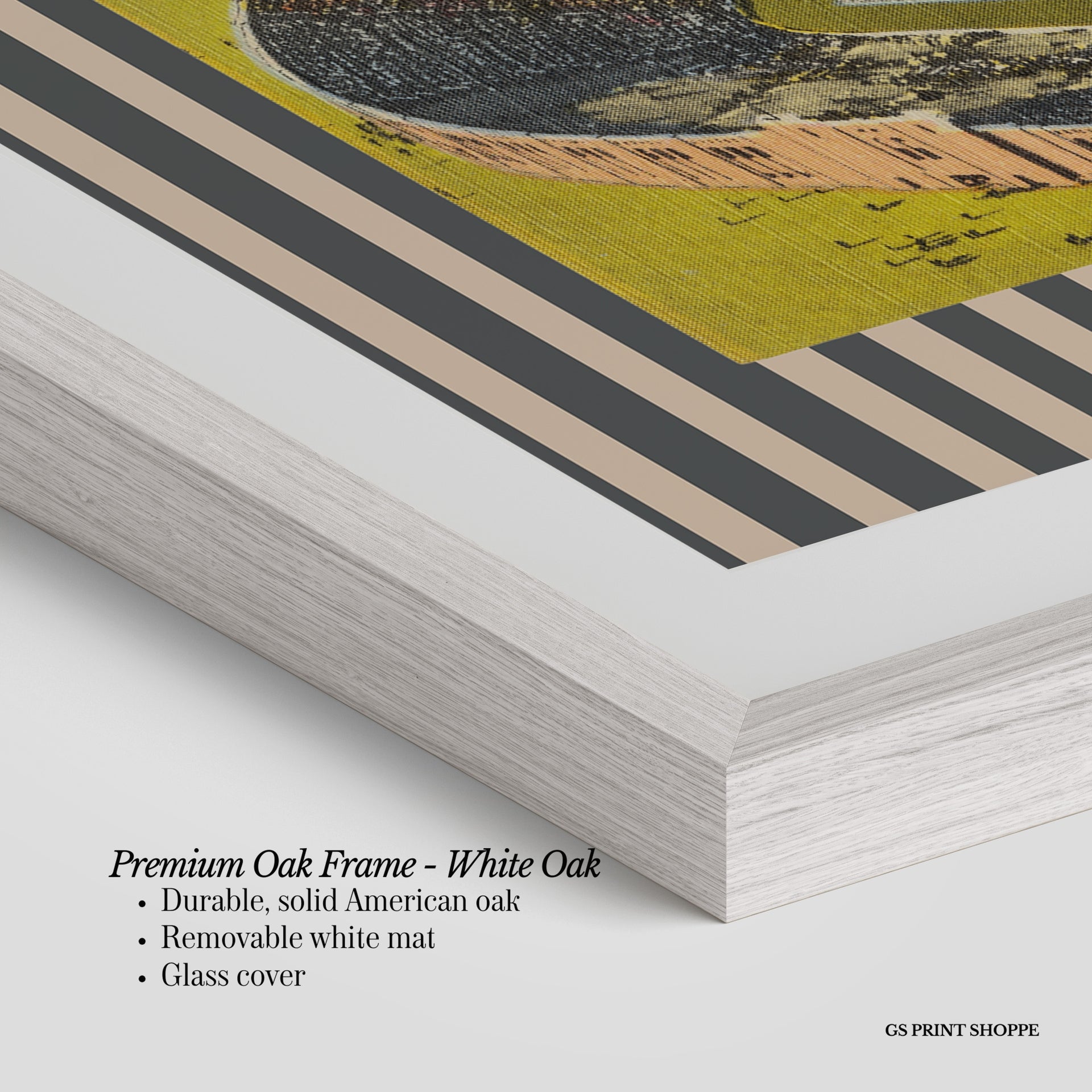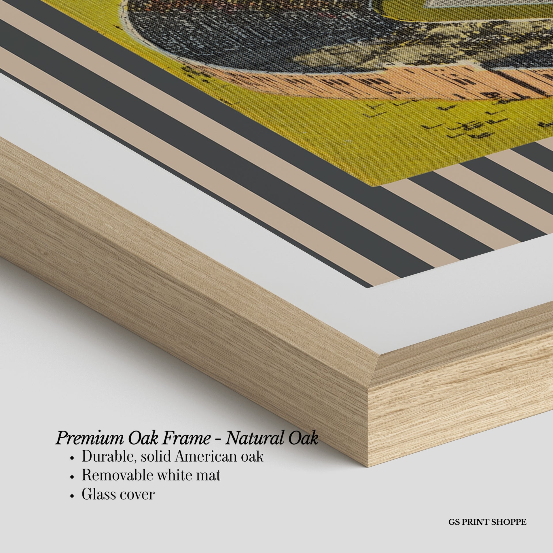 Premium Oak Frame: Our premium oak frame is crafted from solid American oak, offering a warm, natural feel with a high-end finish. We complete this elevated offering with a bright white removable mat and real glass for a versatile and polished look.