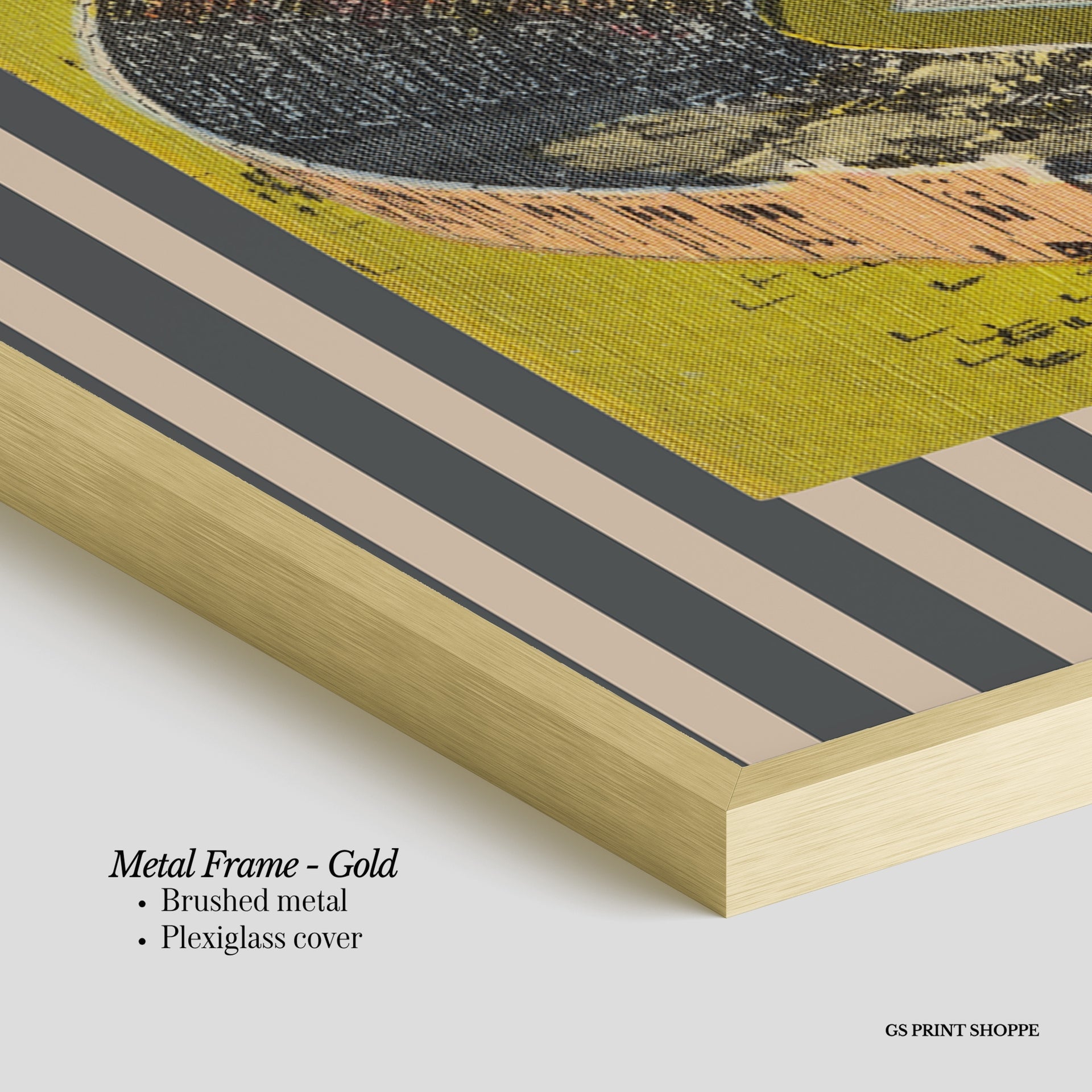 Metal Frame: Sleek and modern, our metal frame is crafted with brushed metal for a polished finish. It comes with durable plexiglass and sturdy metal hangers for horizontal or vertical display.