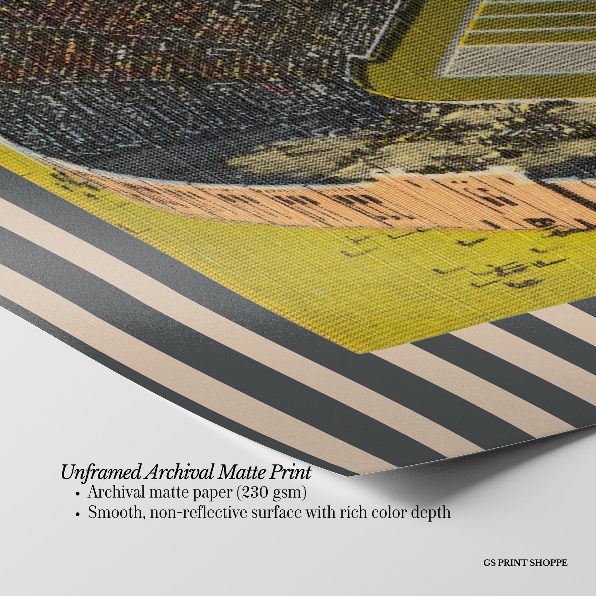 Unframed: This print is professionally printed on archival matte paper (230 gsm), a smooth, acid-free paper with a non-reflective finish. It will be carefully packaged to arrive safely at your door.