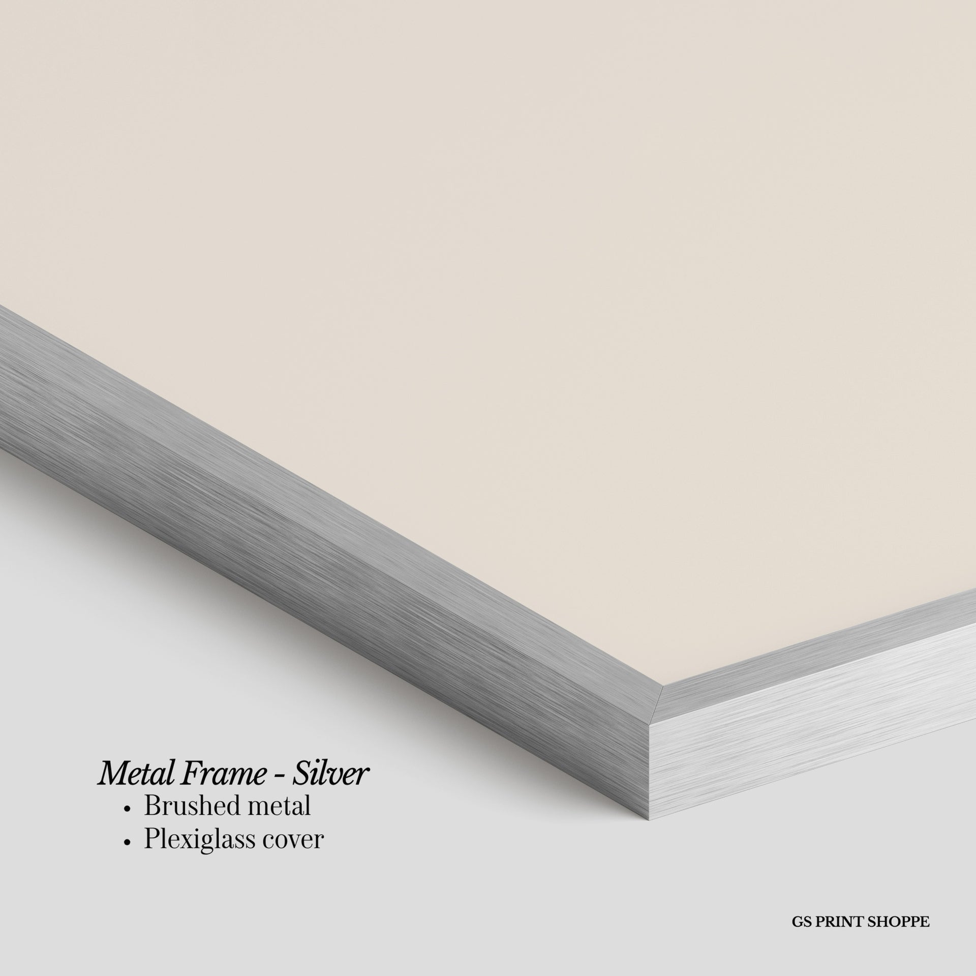 Metal Frame: Sleek and modern, our metal frame is crafted with brushed metal for a polished finish. It comes with durable plexiglass and sturdy metal hangers for horizontal or vertical display.