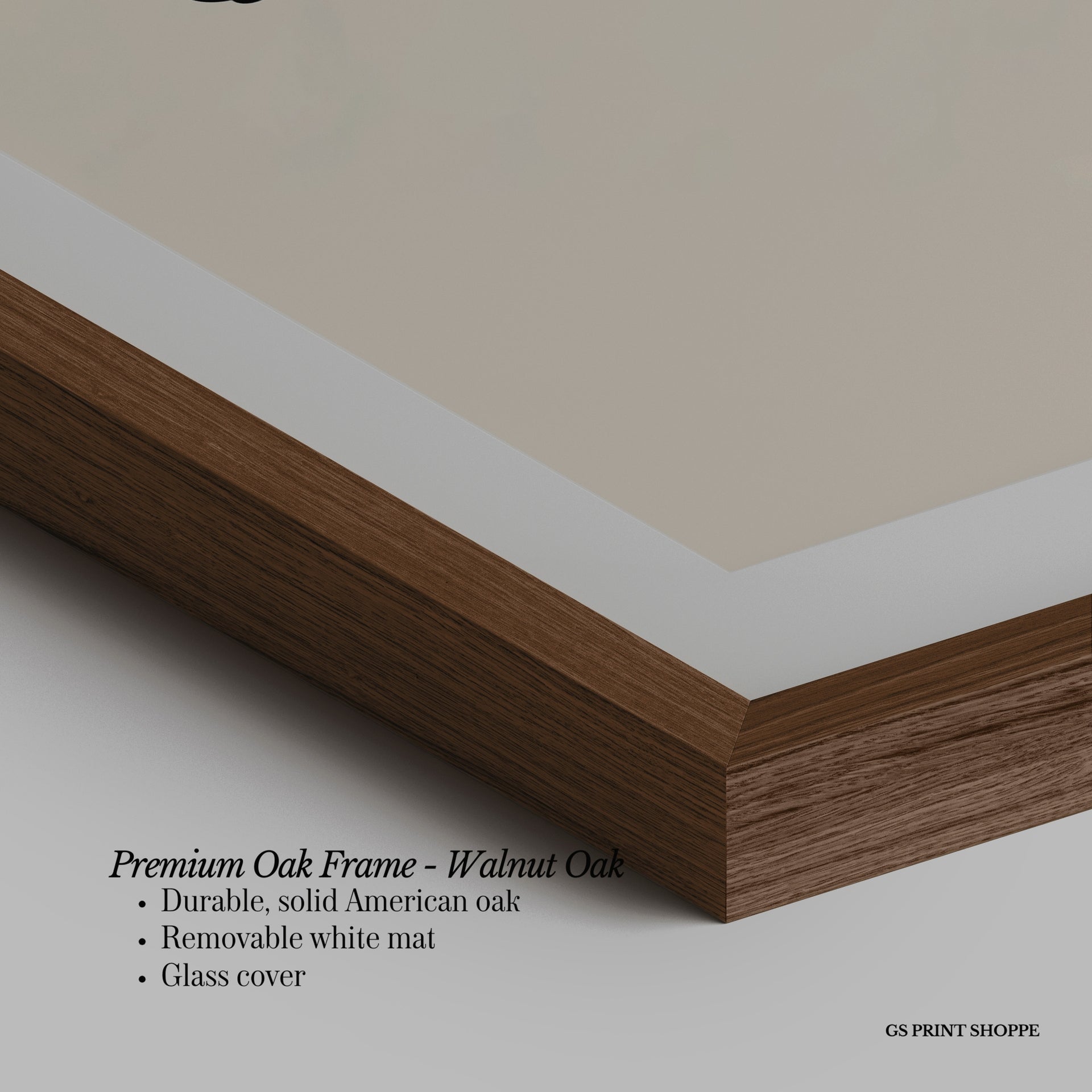 Premium Oak Frame: Our premium oak frame is crafted from solid American oak, offering a warm, natural feel with a high-end finish. We complete this elevated offering with a bright white removable mat and real glass for a versatile and polished look.
