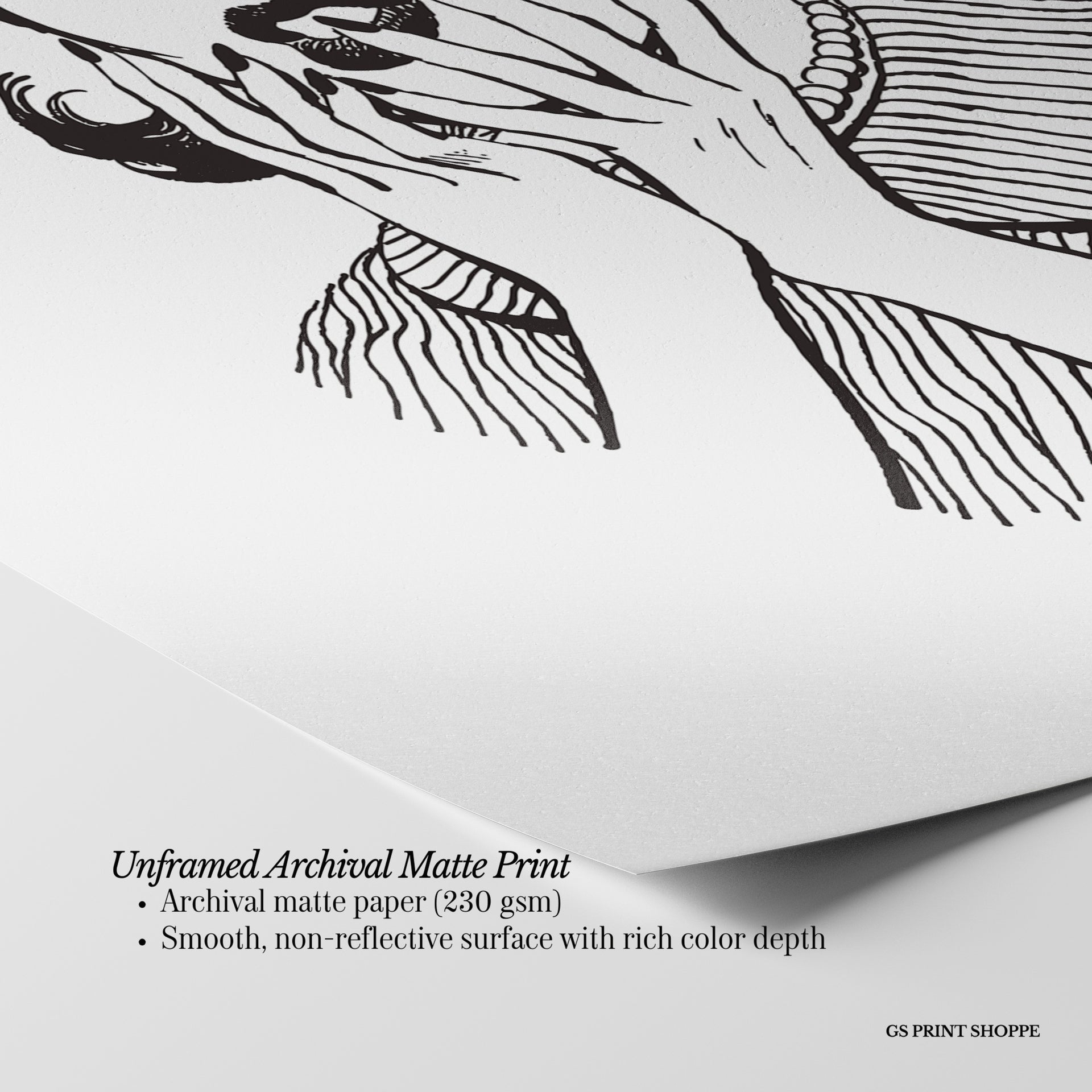 Unframed: This print is professionally printed on archival matte paper (230 gsm), a smooth, acid-free paper with a non-reflective finish. It will be carefully packaged to arrive safely at your door.