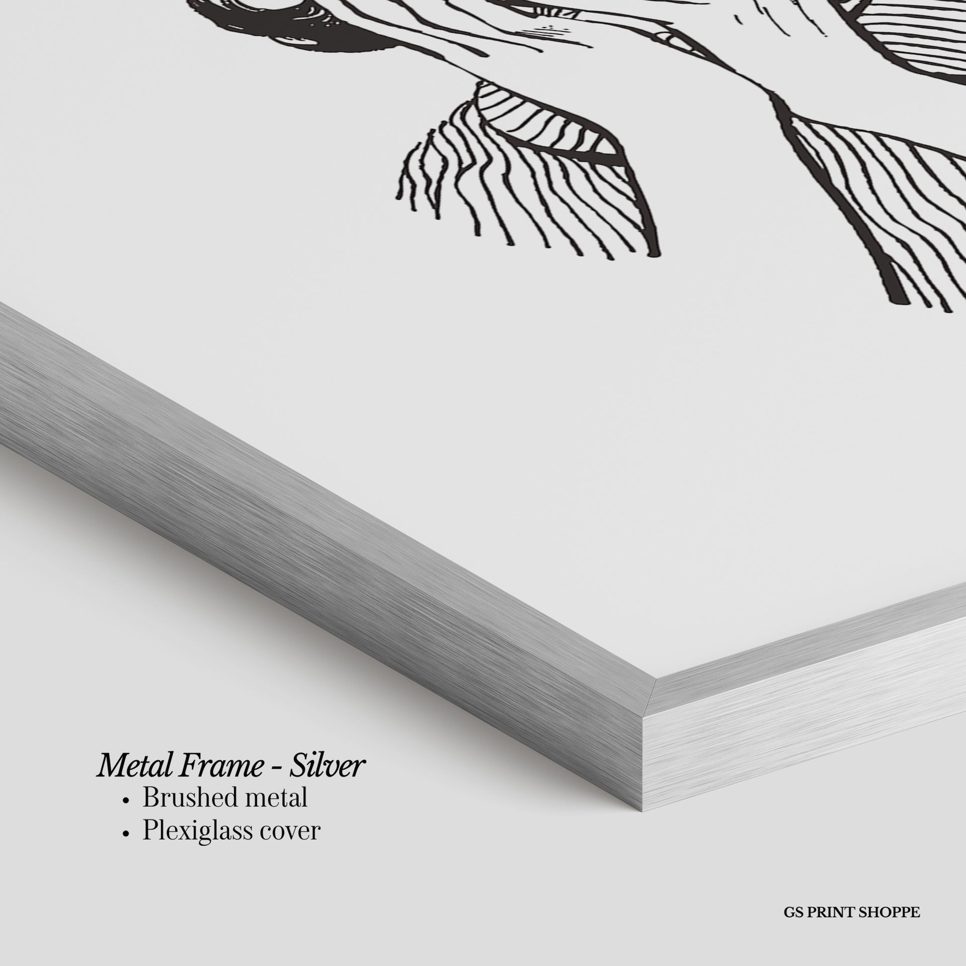 Metal Frame: Sleek and modern, our metal frame is crafted with brushed metal for a polished finish. It comes with durable plexiglass and sturdy metal hangers for horizontal or vertical display.