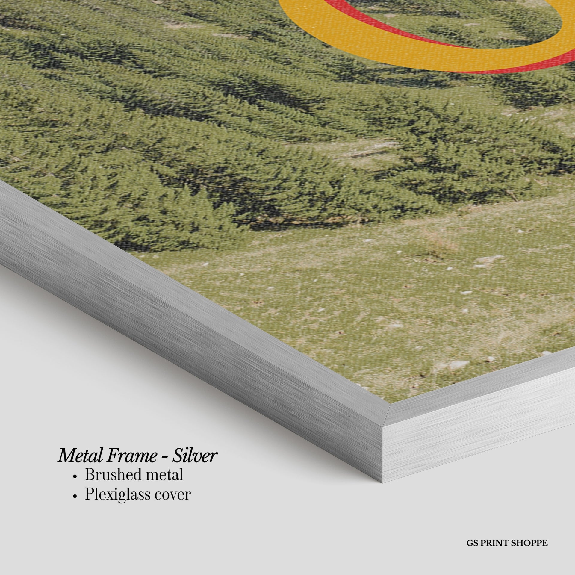 Metal Frame: Sleek and modern, our metal frame is crafted with brushed metal for a polished finish. It comes with durable plexiglass and sturdy metal hangers for horizontal or vertical display.