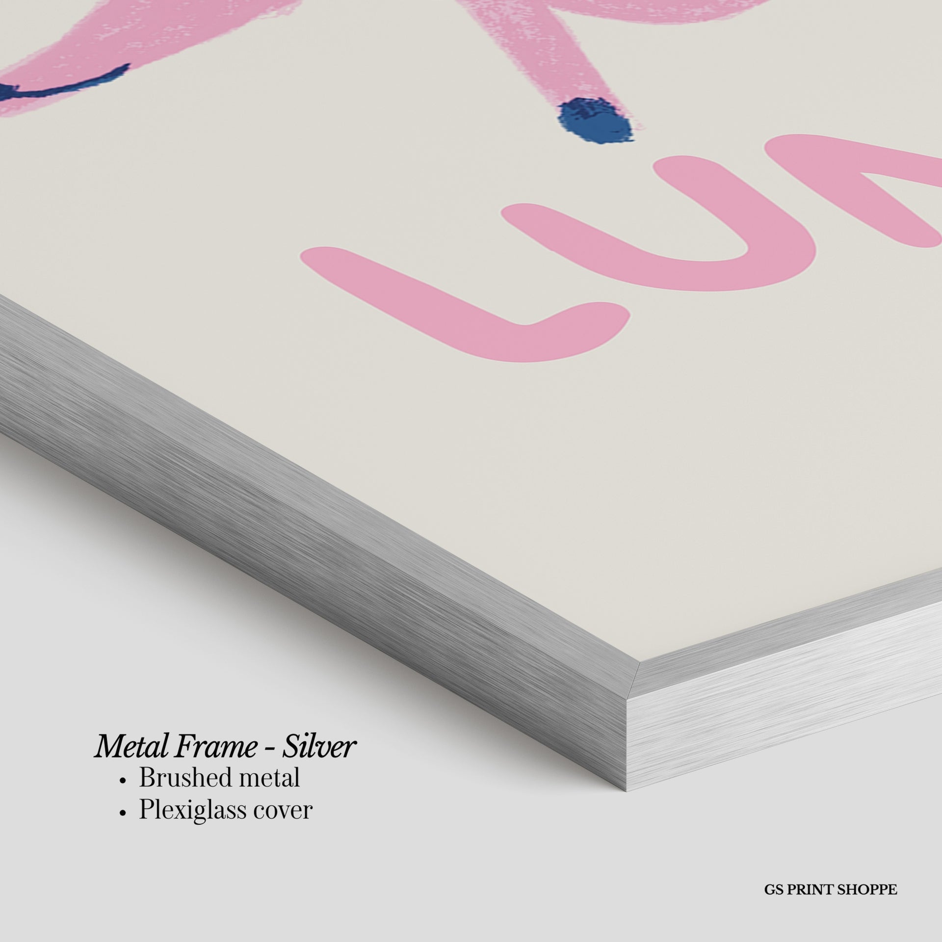 Metal Frame: Sleek and modern, our metal frame is crafted with brushed metal for a polished finish. It comes with durable plexiglass and sturdy metal hangers for horizontal or vertical display.