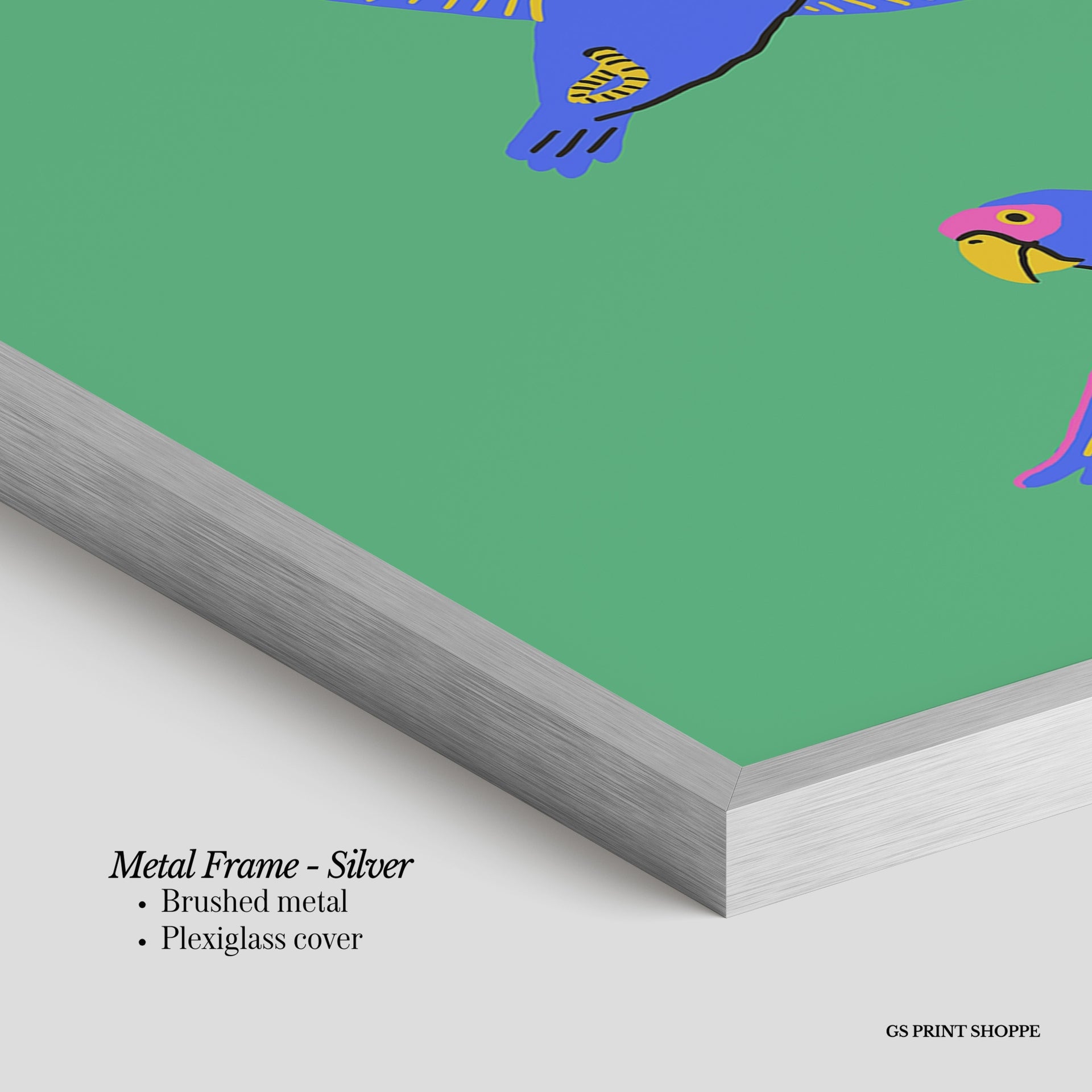 Metal Frame: Sleek and modern, our metal frame is crafted with brushed metal for a polished finish. It comes with durable plexiglass and sturdy metal hangers for horizontal or vertical display.