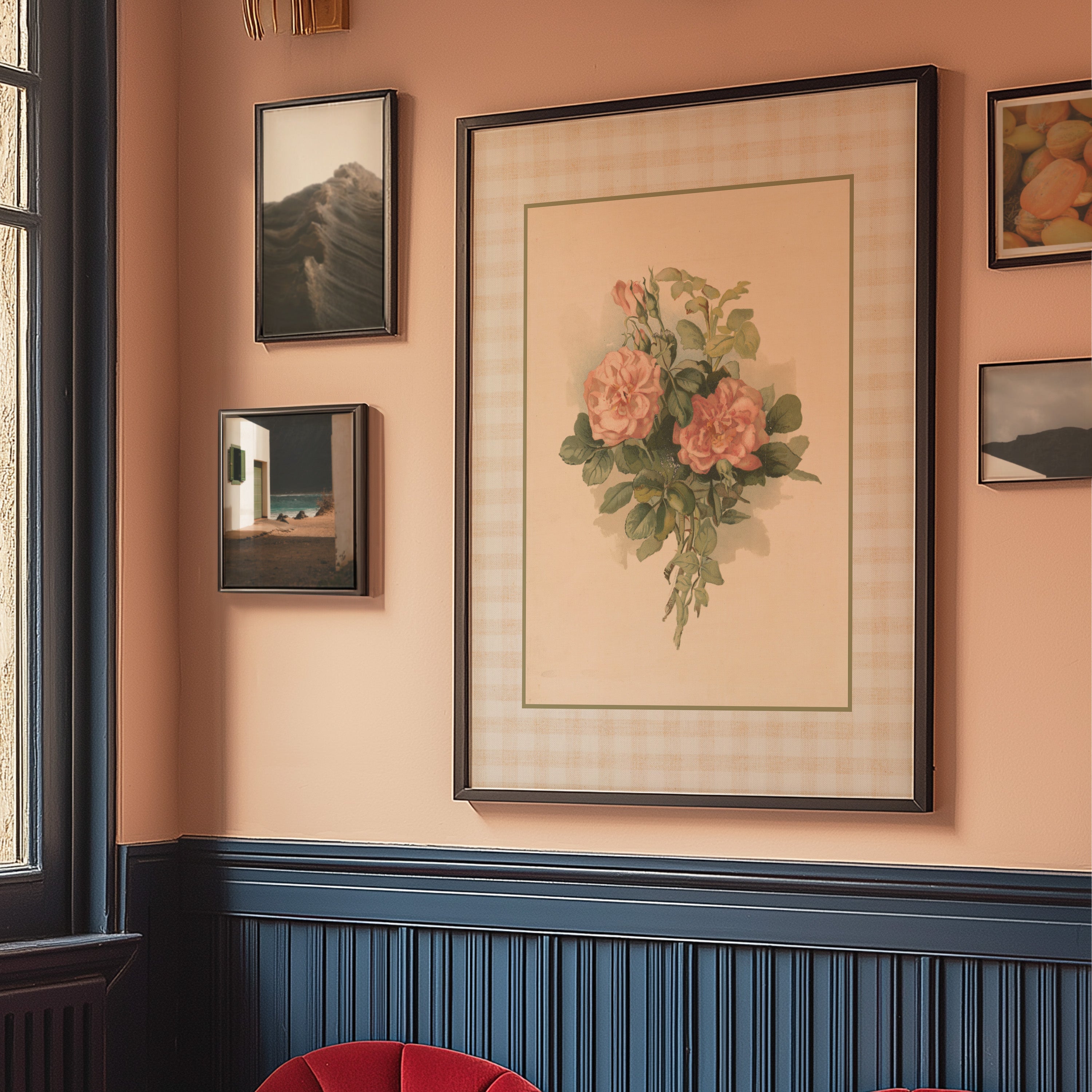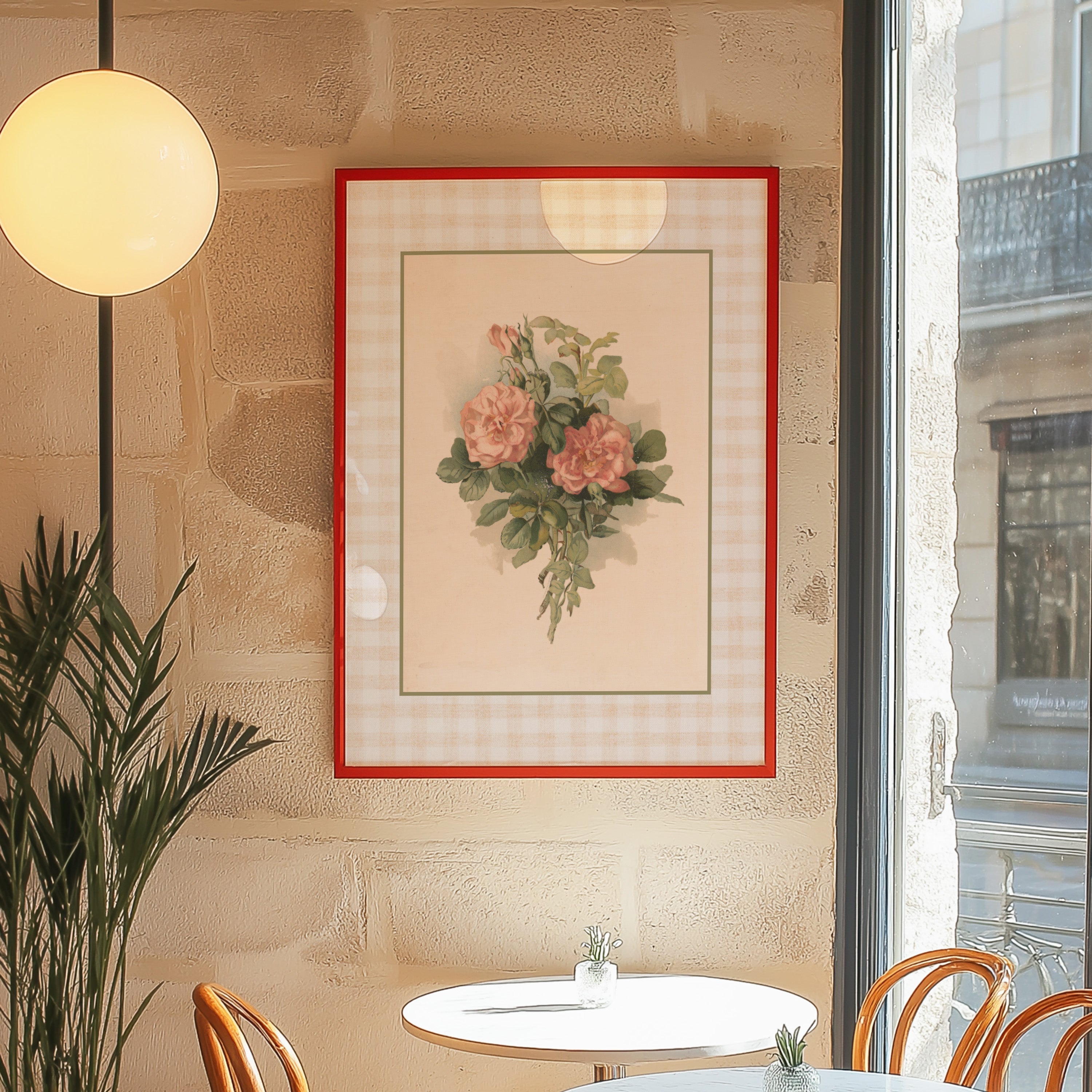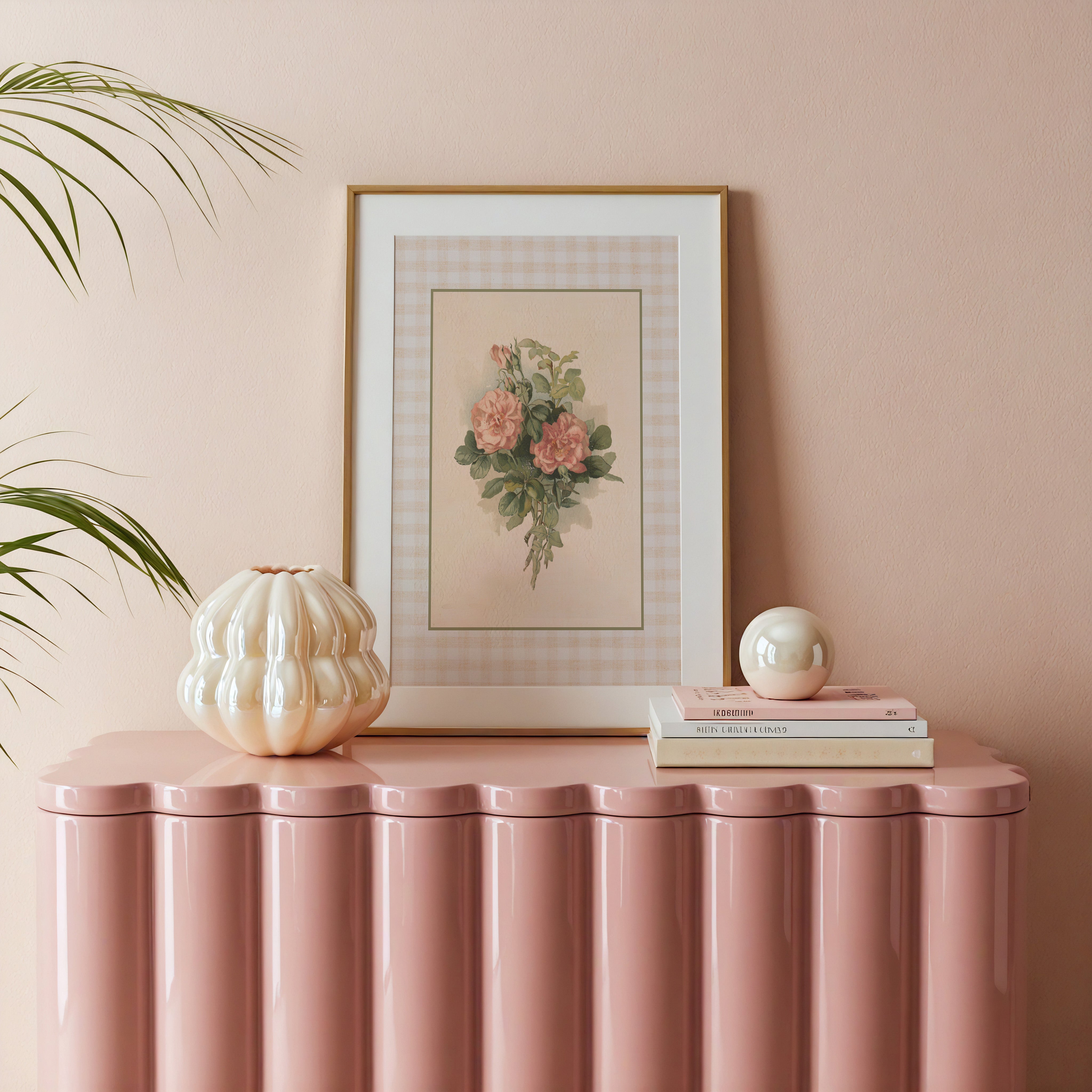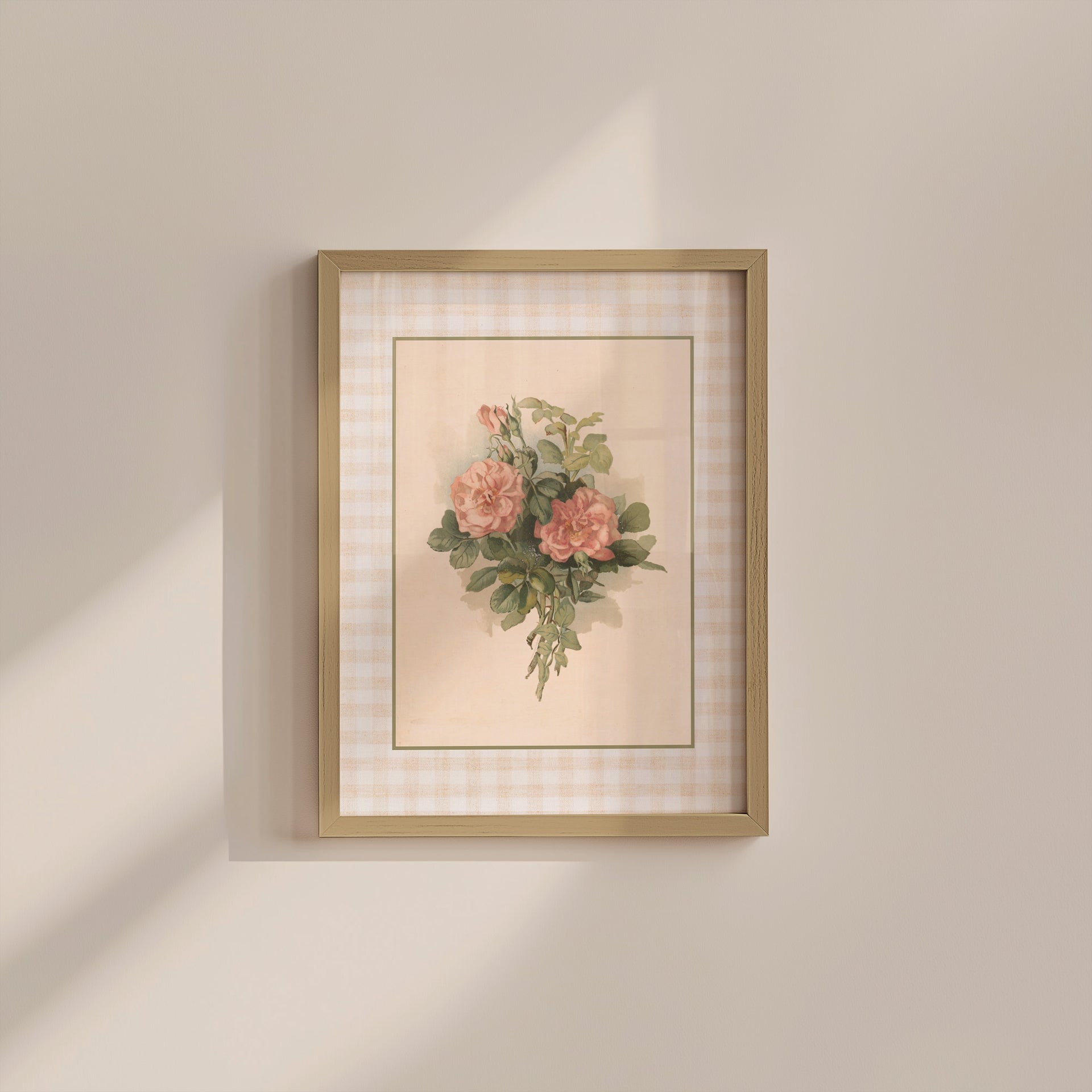 Peach Gingham Vertical Art Print - Roses