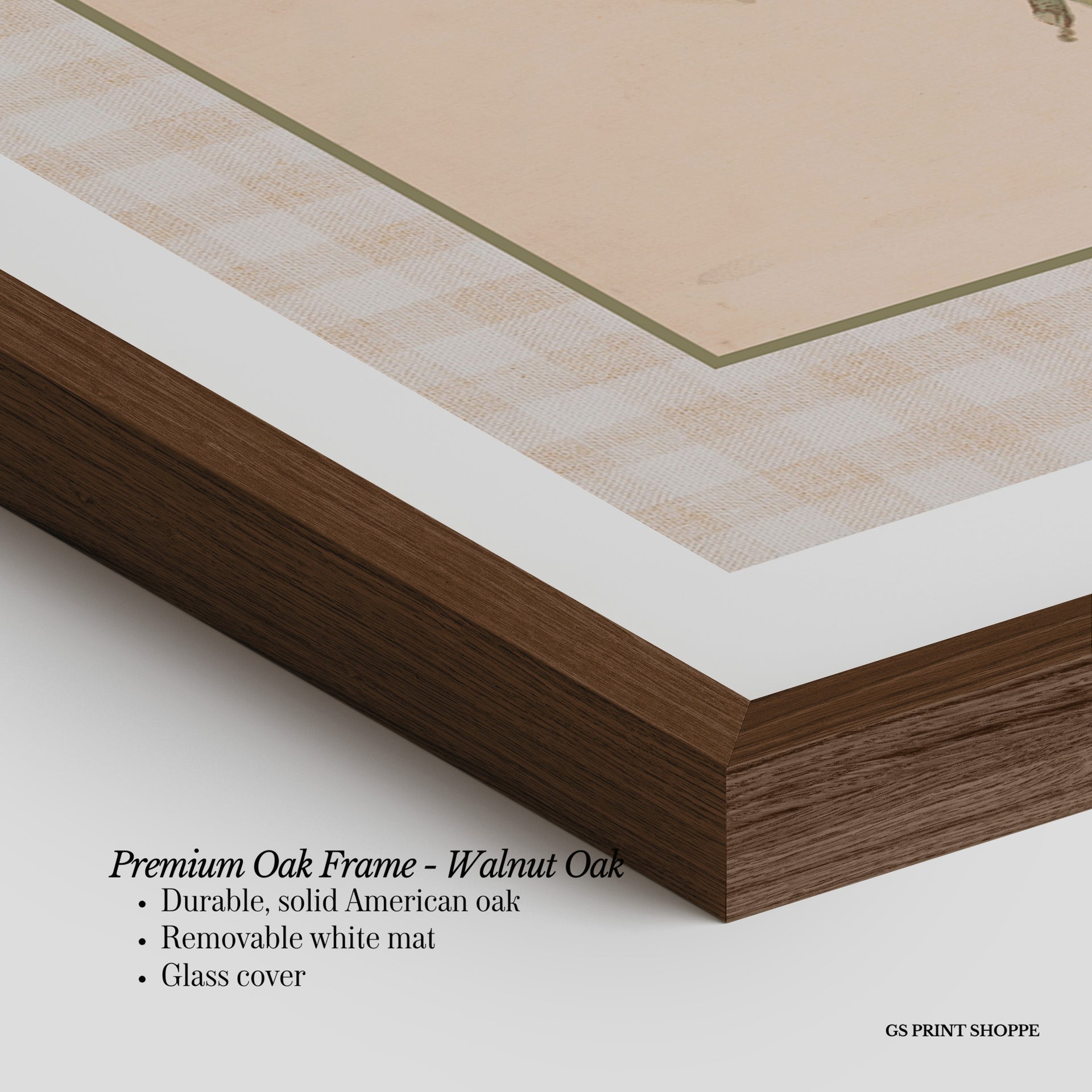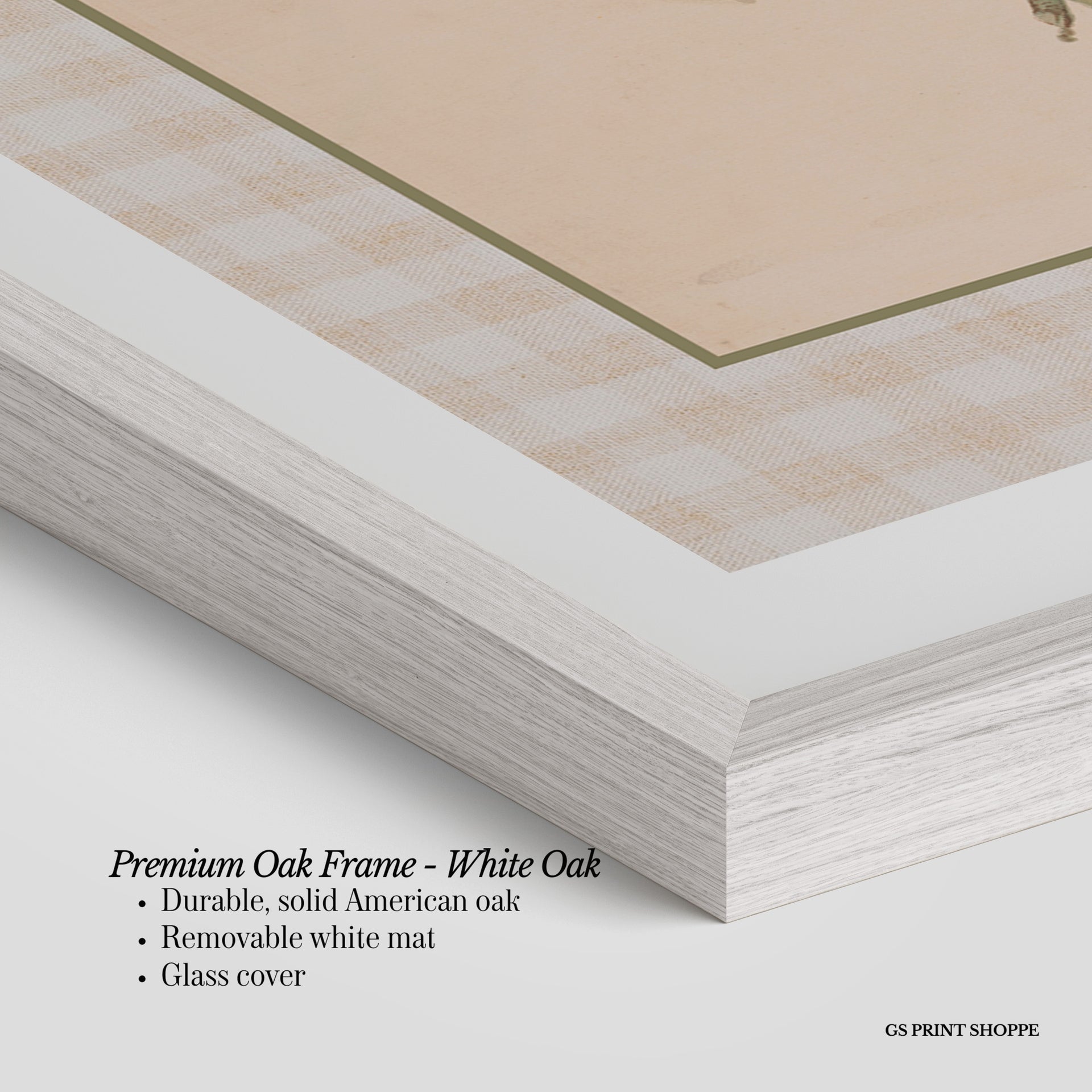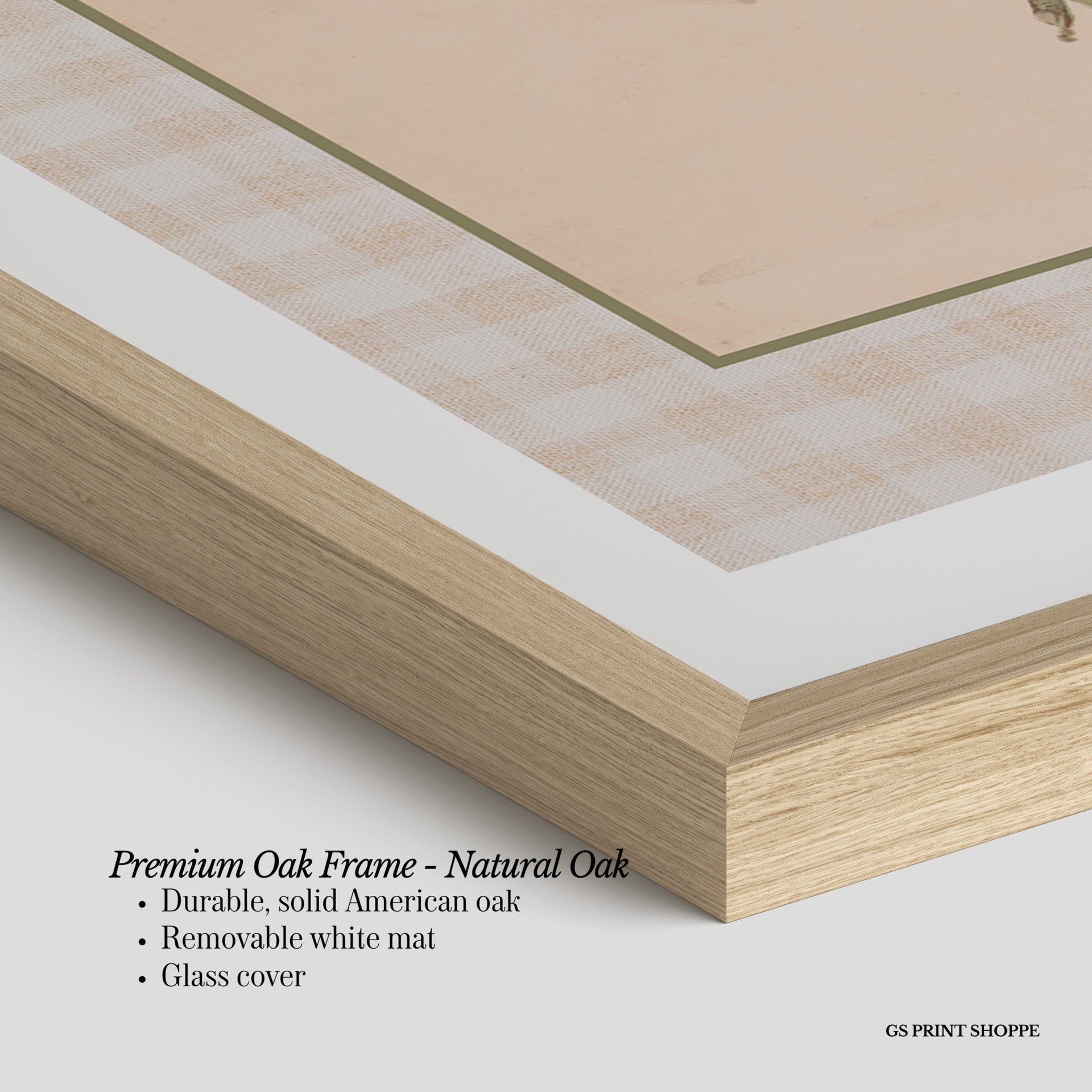 Premium Oak Frame: Our premium oak frame is crafted from solid American oak, offering a warm, natural feel with a high-end finish. We complete this elevated offering with a bright white removable mat and real glass for a versatile and polished look.