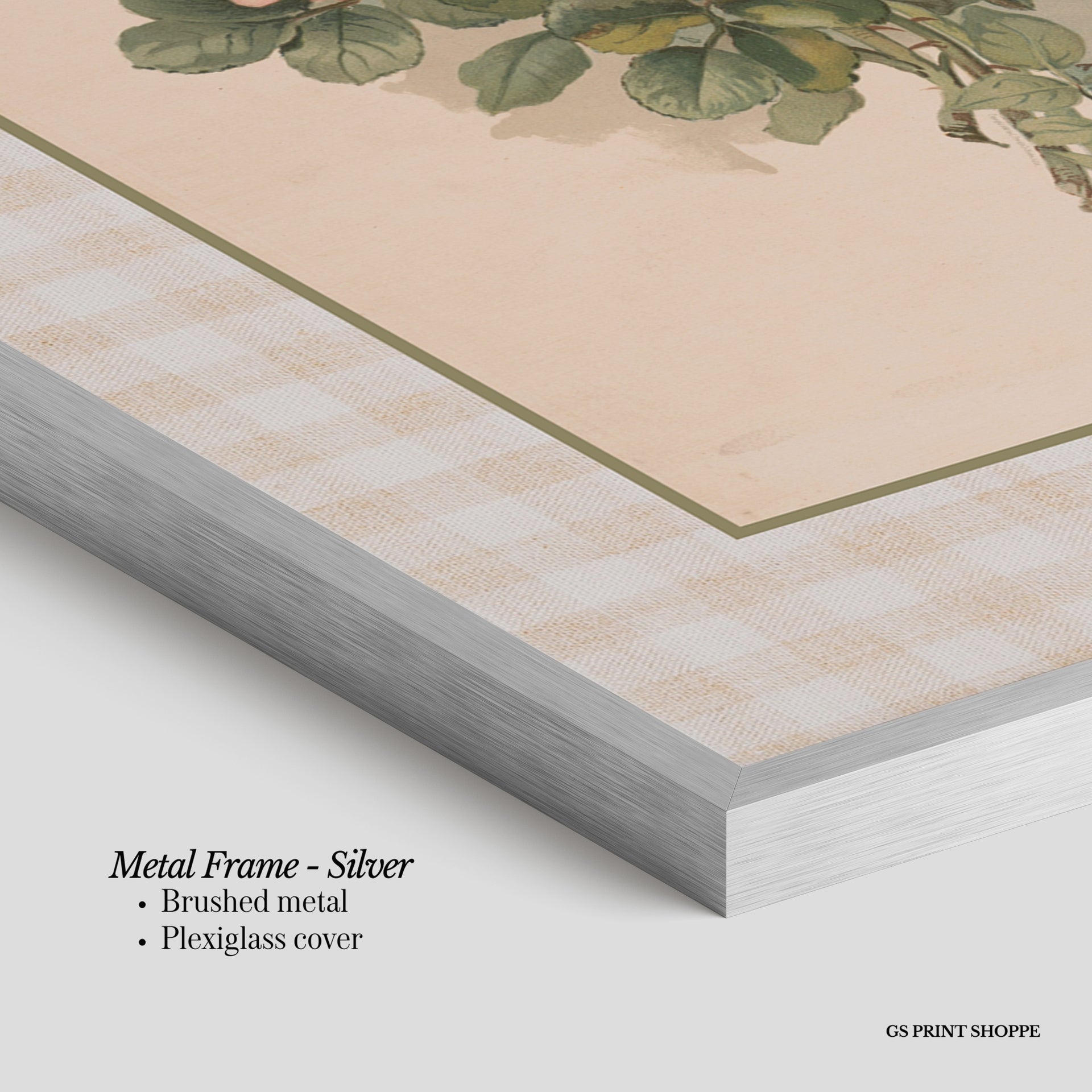 Metal Frame: Sleek and modern, our metal frame is crafted with brushed metal for a polished finish. It comes with durable plexiglass and sturdy metal hangers for horizontal or vertical display.