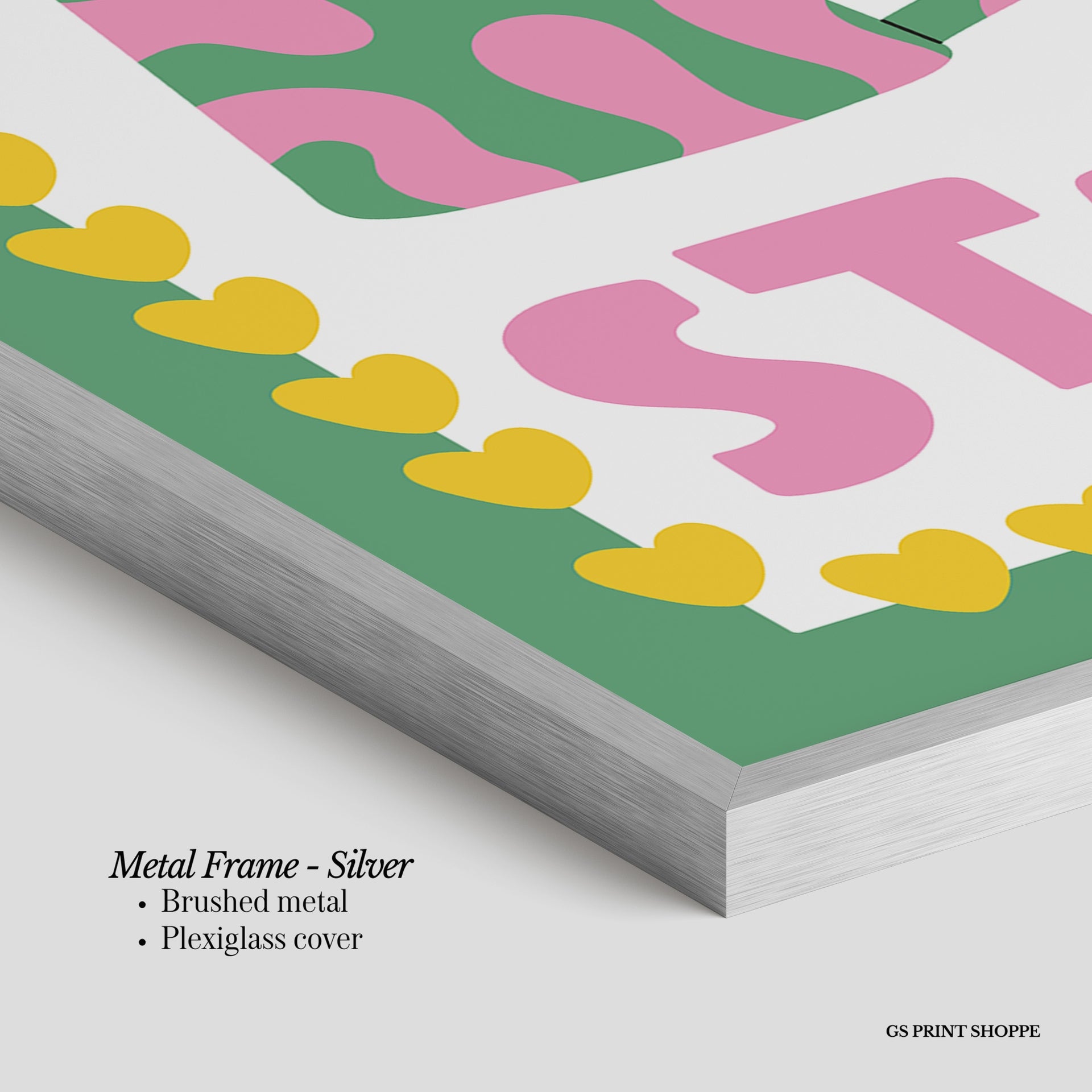 Metal Frame: Sleek and modern, our metal frame is crafted with brushed metal for a polished finish. It comes with durable plexiglass and sturdy metal hangers for horizontal or vertical display.