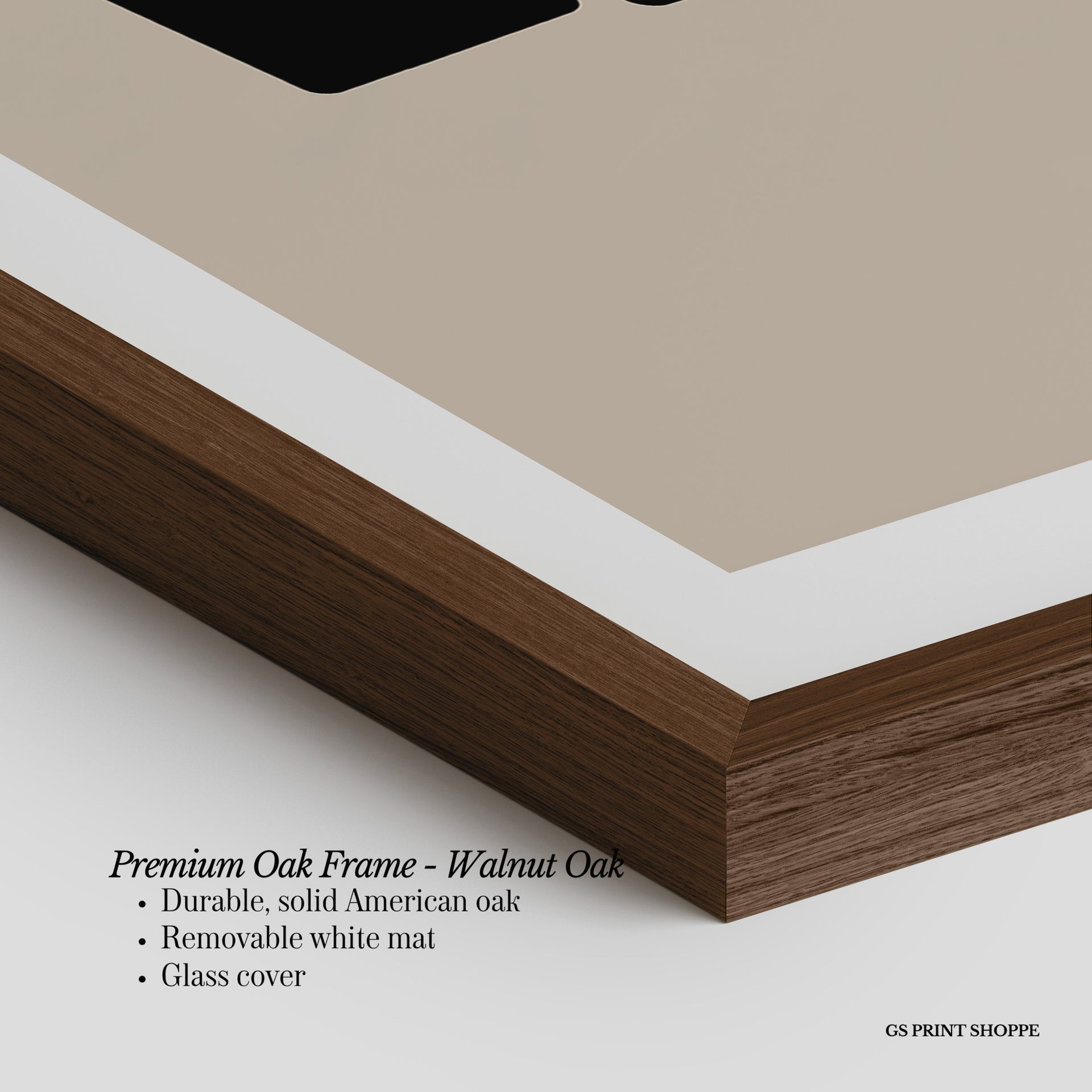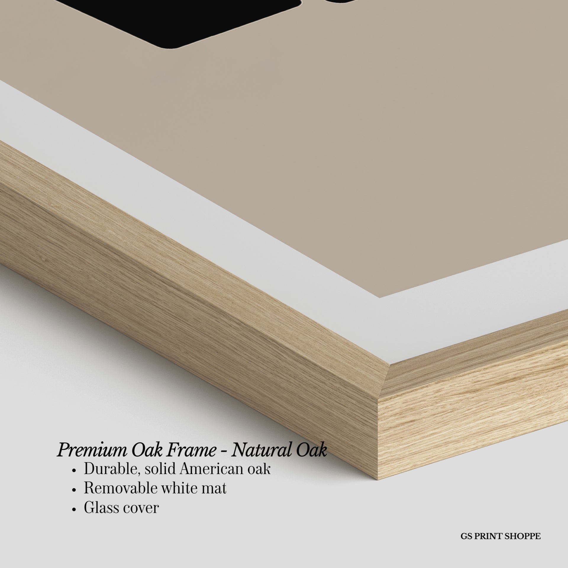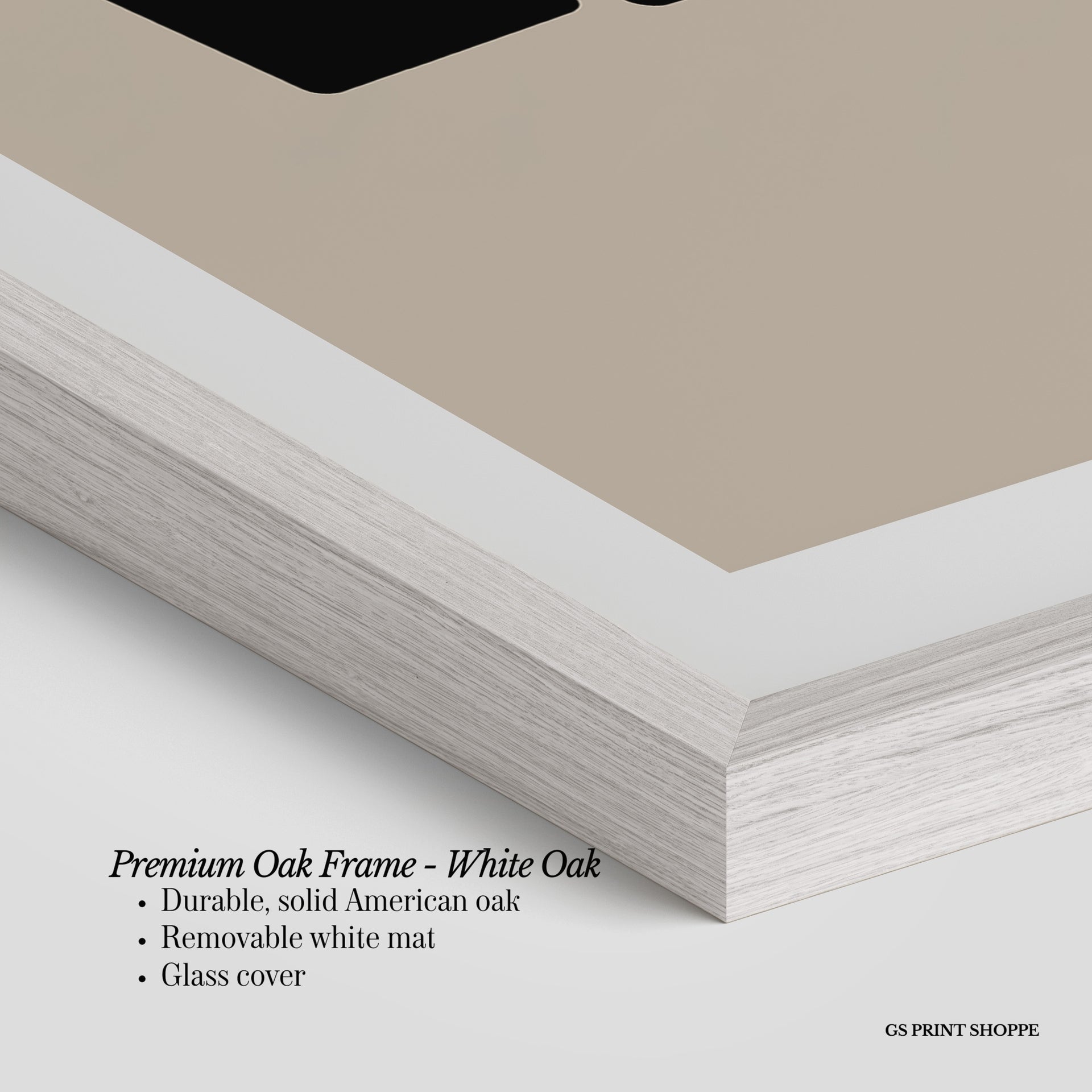 Premium Oak Frame: Our premium oak frame is crafted from solid American oak, offering a warm, natural feel with a high-end finish. We complete this elevated offering with a bright white removable mat and real glass for a versatile and polished look.