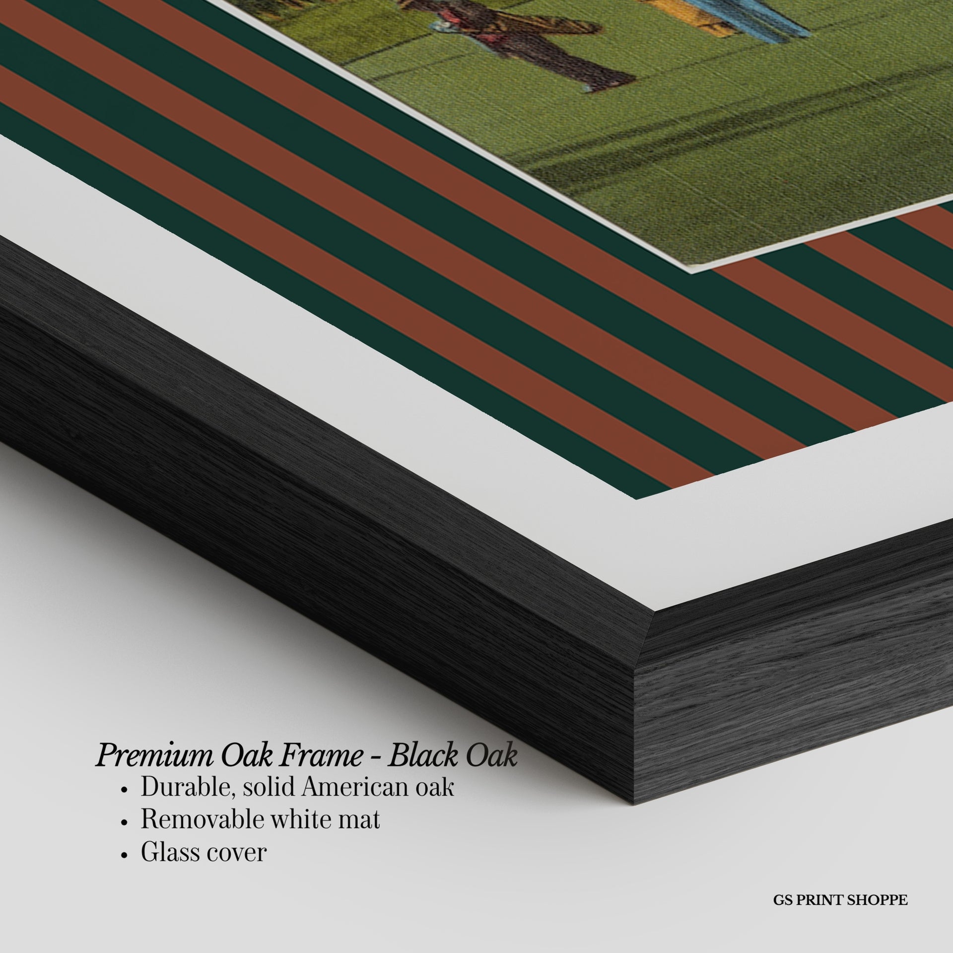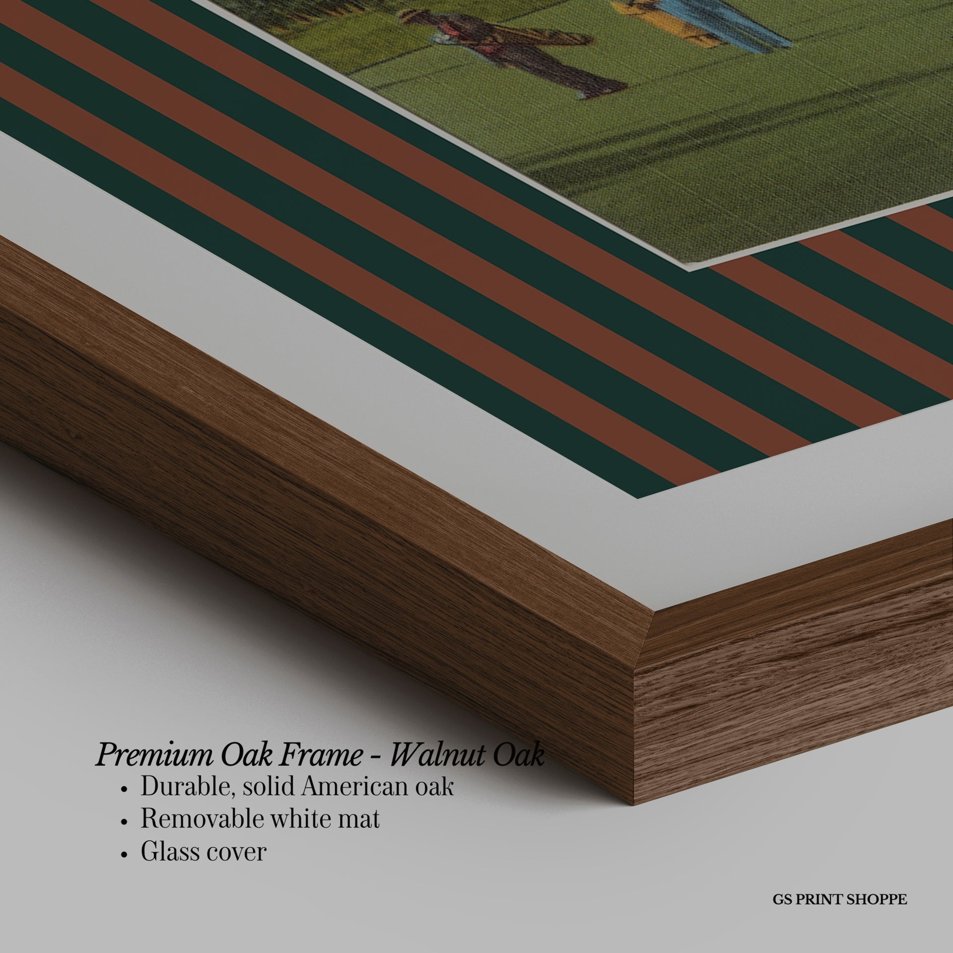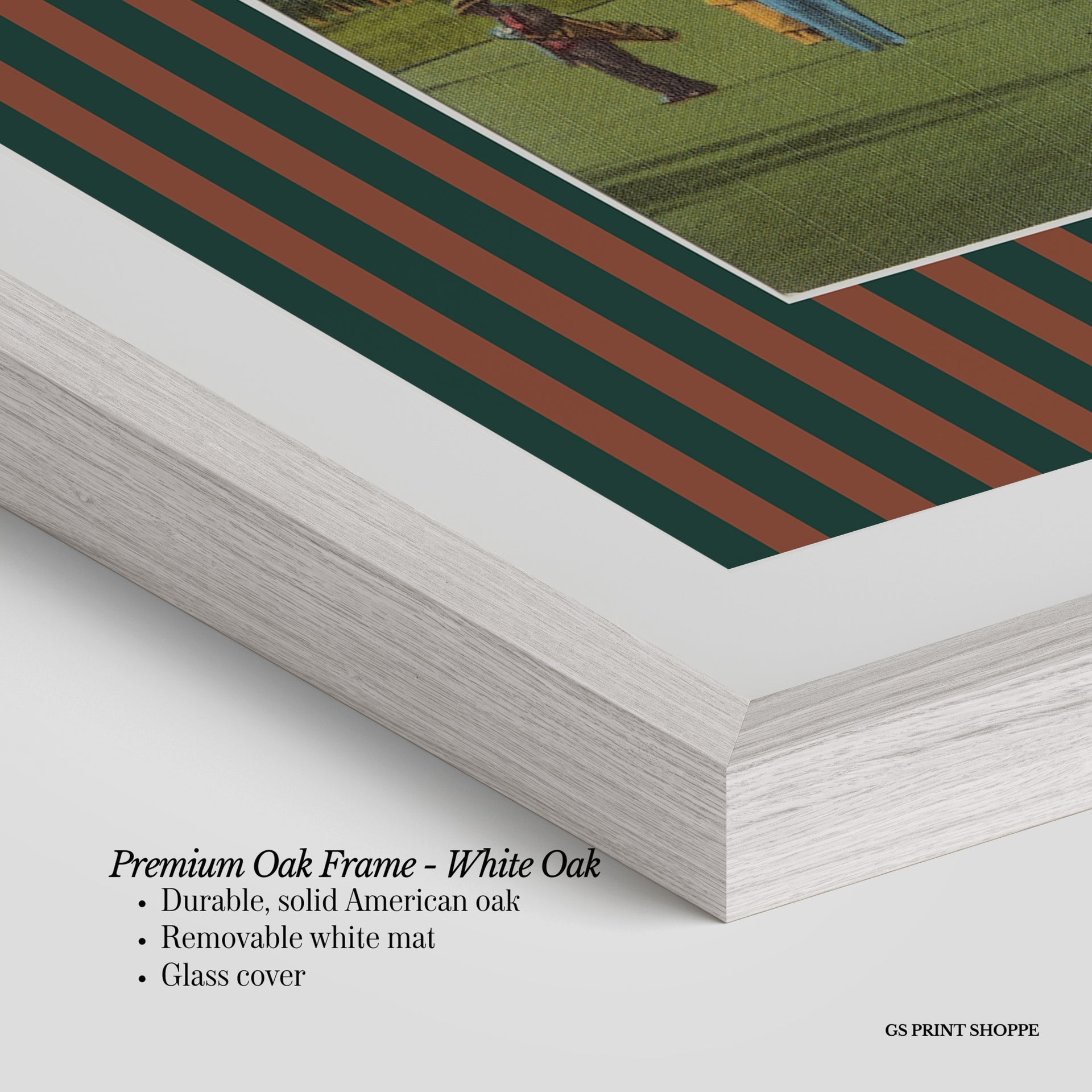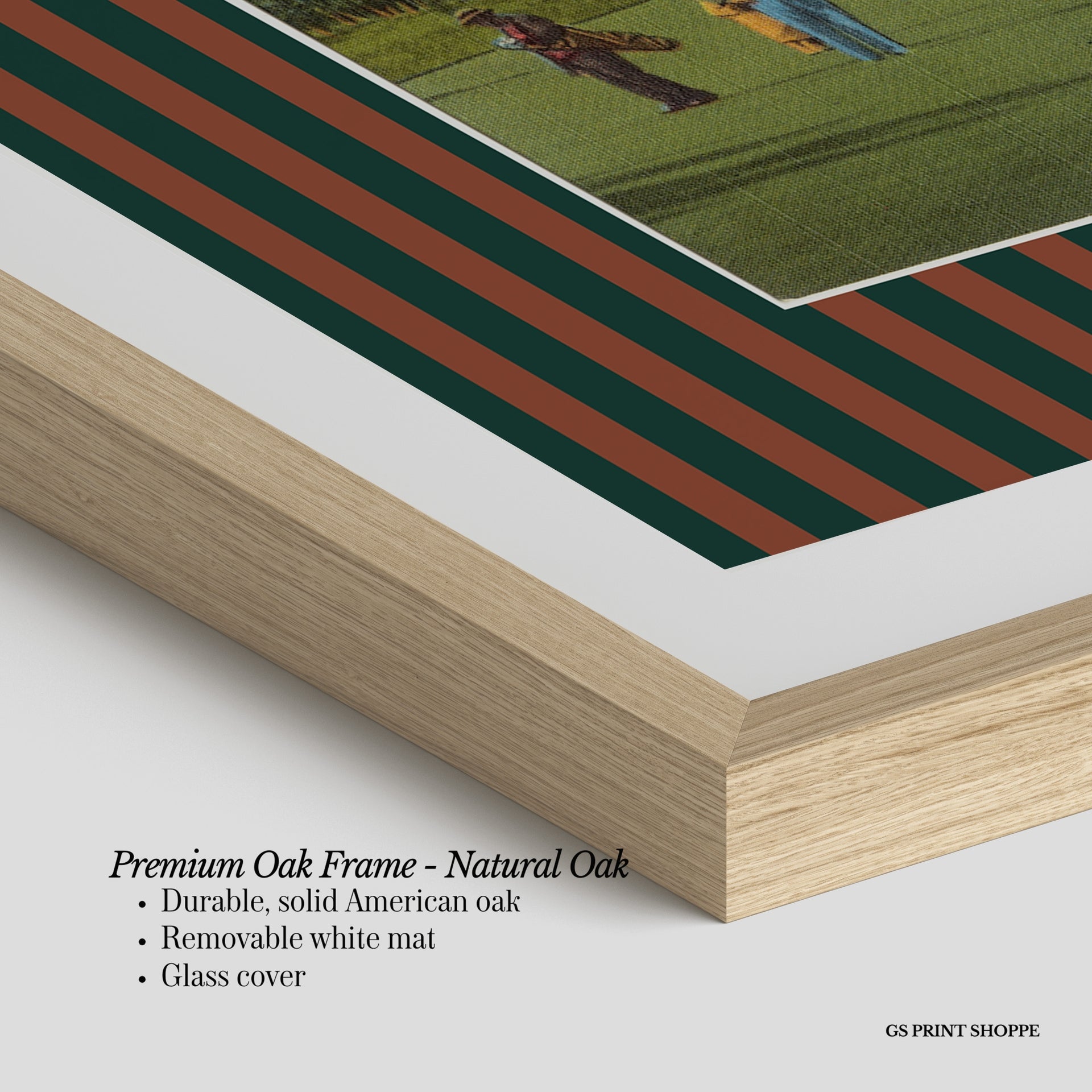 Premium Oak Frame: Our premium oak frame is crafted from solid American oak, offering a warm, natural feel with a high-end finish. We complete this elevated offering with a bright white removable mat and real glass for a versatile and polished look.