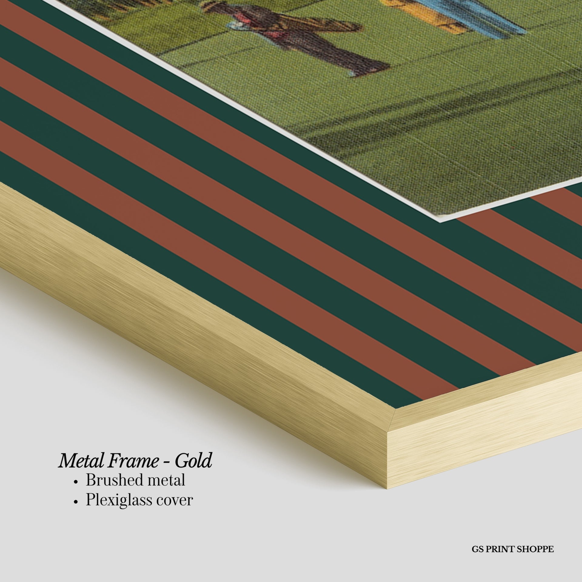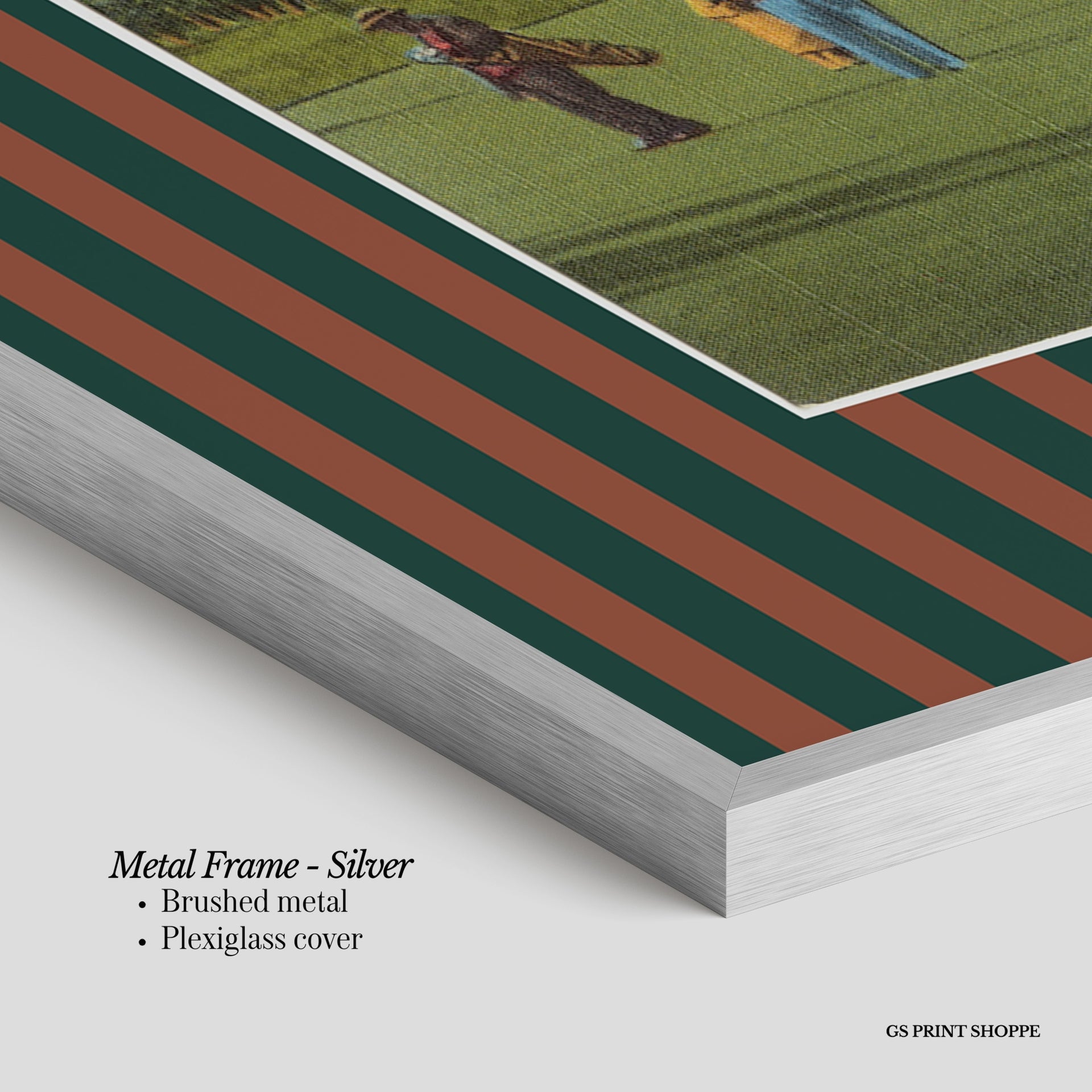 Metal Frame: Sleek and modern, our metal frame is crafted with brushed metal for a polished finish. It comes with durable plexiglass and sturdy metal hangers for horizontal or vertical display.