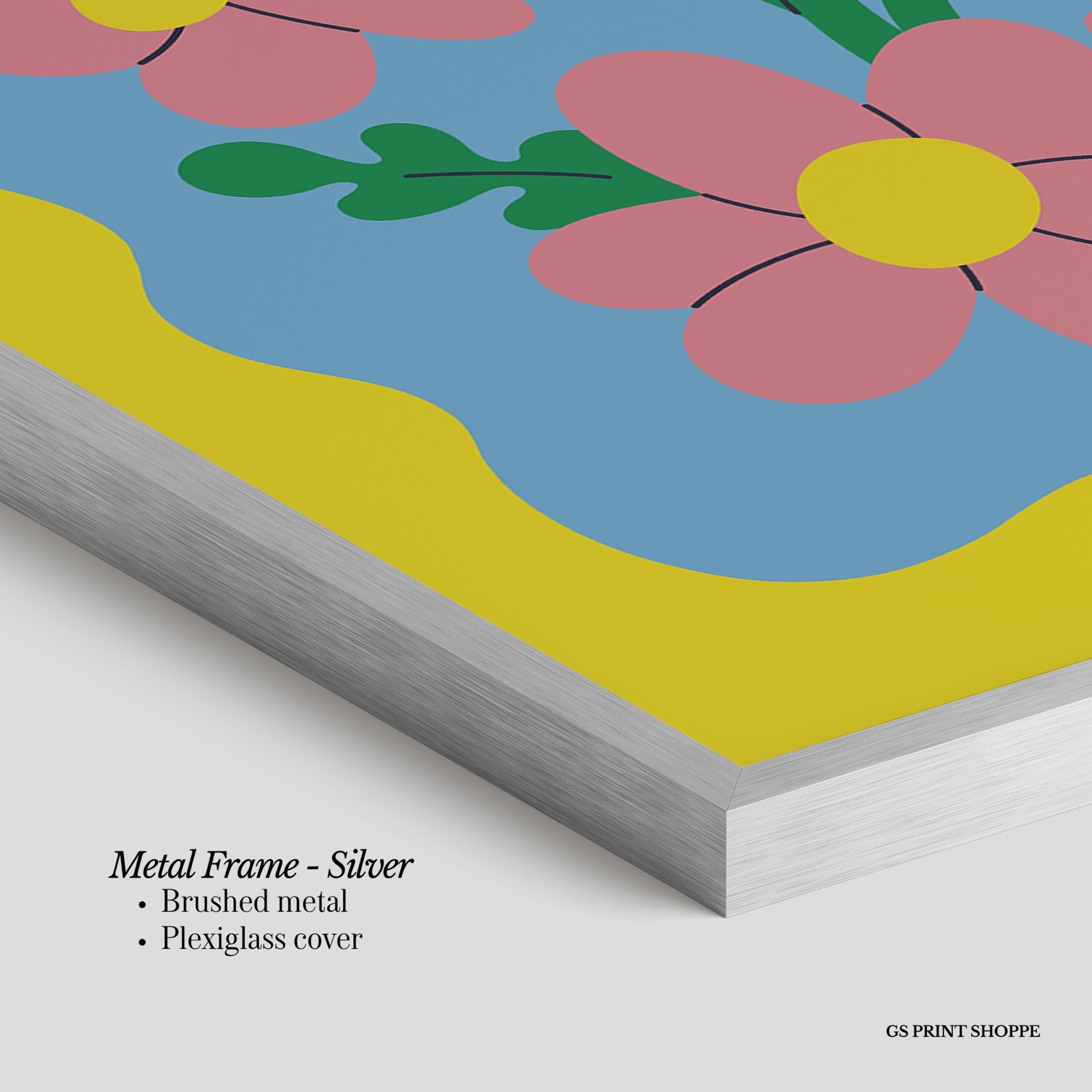 Metal Frame: Sleek and modern, our metal frame is crafted with brushed metal for a polished finish. It comes with durable plexiglass and sturdy metal hangers for horizontal or vertical display.