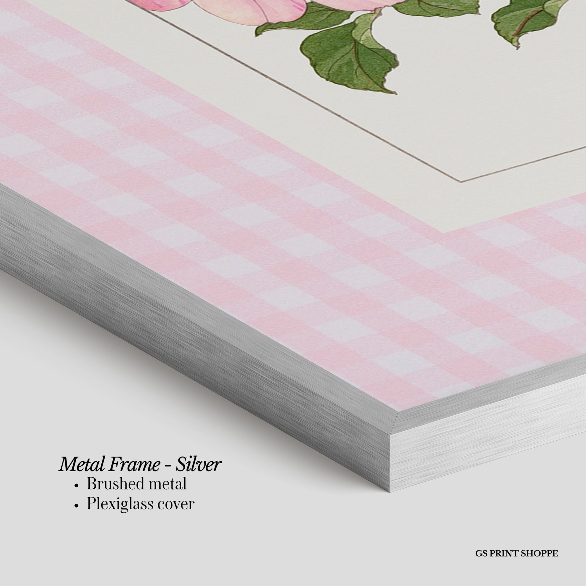Metal Frame: Sleek and modern, our metal frame is crafted with brushed metal for a polished finish. It comes with durable plexiglass and sturdy metal hangers for horizontal or vertical display.