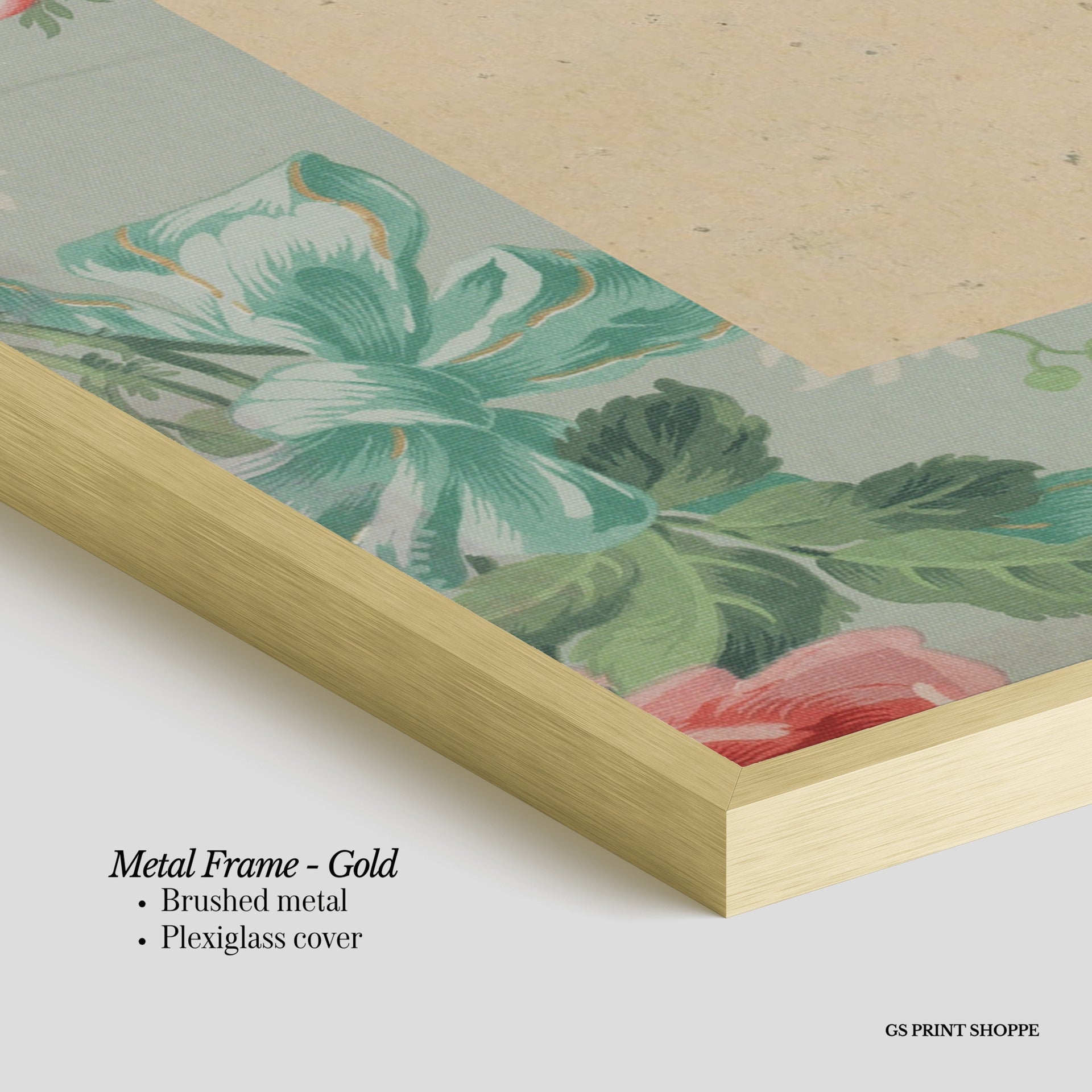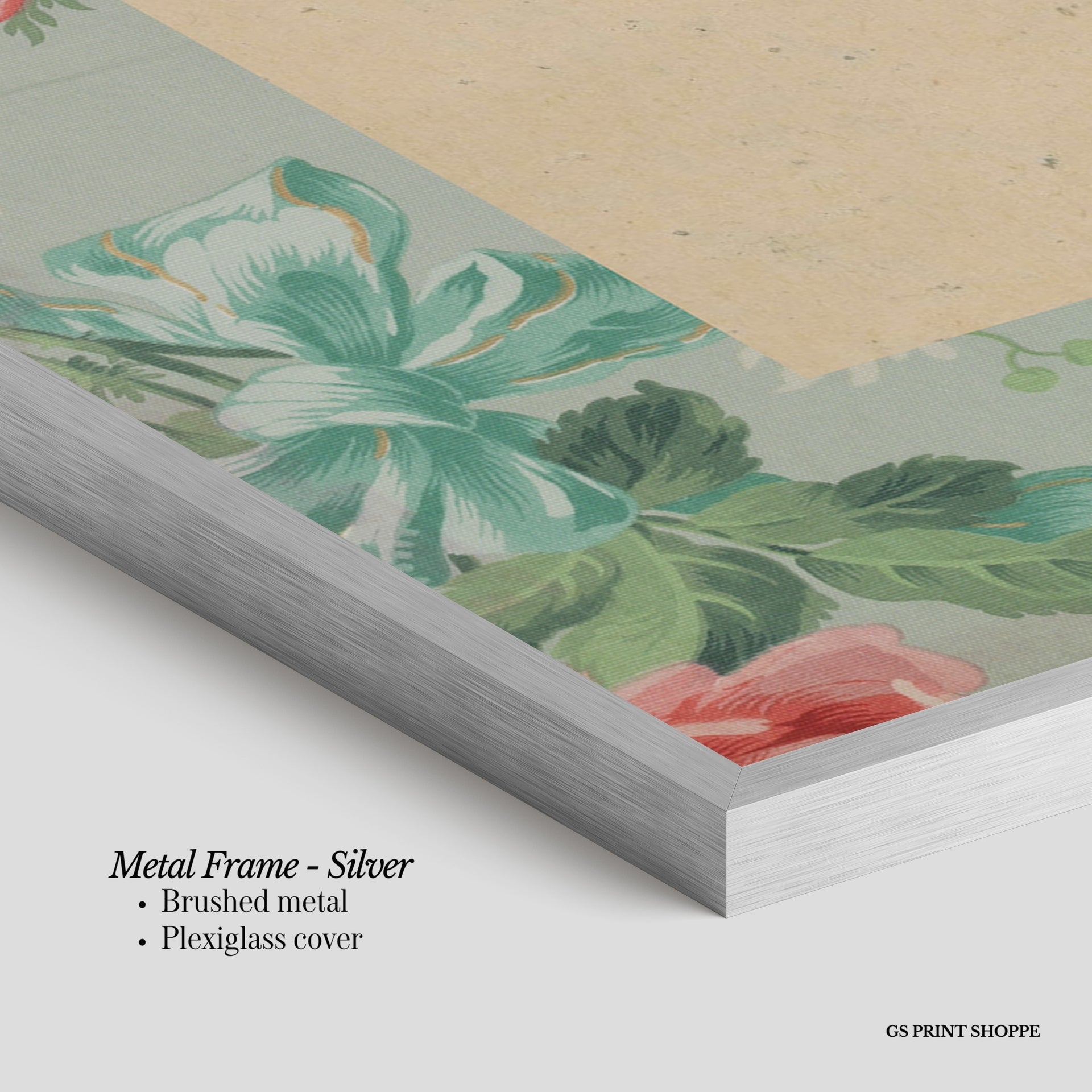 Metal Frame: Sleek and modern, our metal frame is crafted with brushed metal for a polished finish. It comes with durable plexiglass and sturdy metal hangers for horizontal or vertical display.