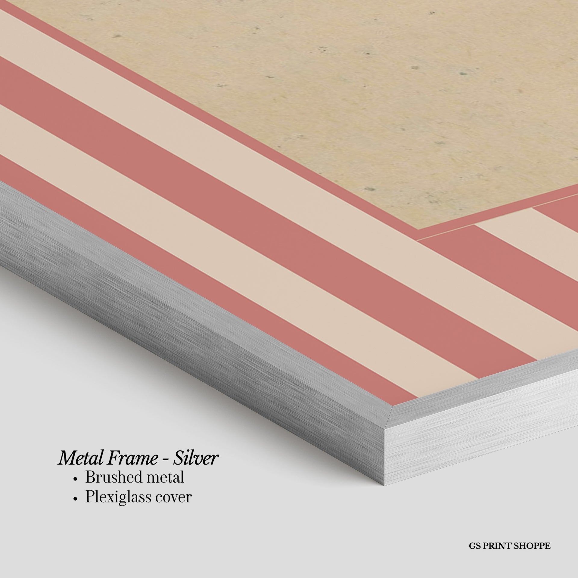 Metal Frame: Sleek and modern, our metal frame is crafted with brushed metal for a polished finish. It comes with durable plexiglass and sturdy metal hangers for horizontal or vertical display.