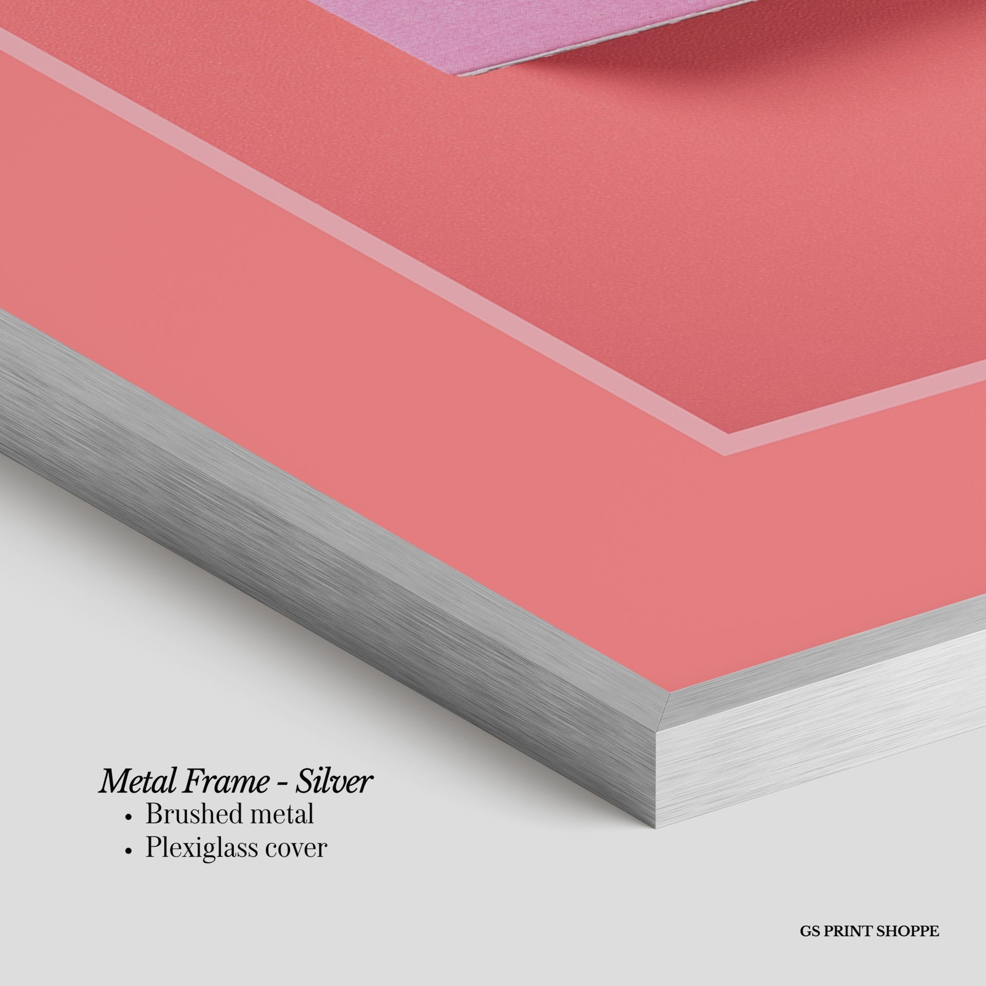 Metal Frame: Sleek and modern, our metal frame is crafted with brushed metal for a polished finish. It comes with durable plexiglass and sturdy metal hangers for horizontal or vertical display.