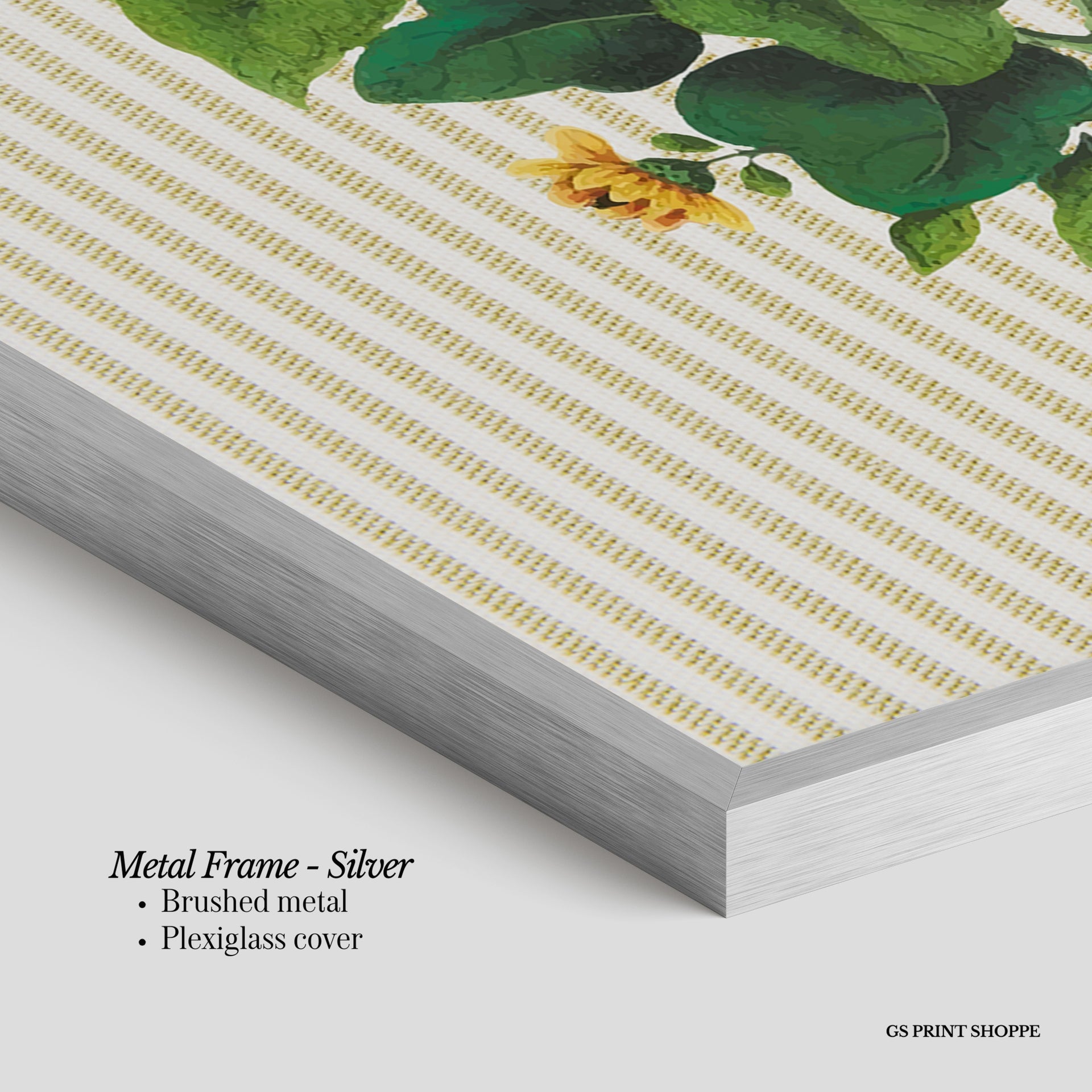 Metal Frame: Sleek and modern, our metal frame is crafted with brushed metal for a polished finish. It comes with durable plexiglass and sturdy metal hangers for horizontal or vertical display.