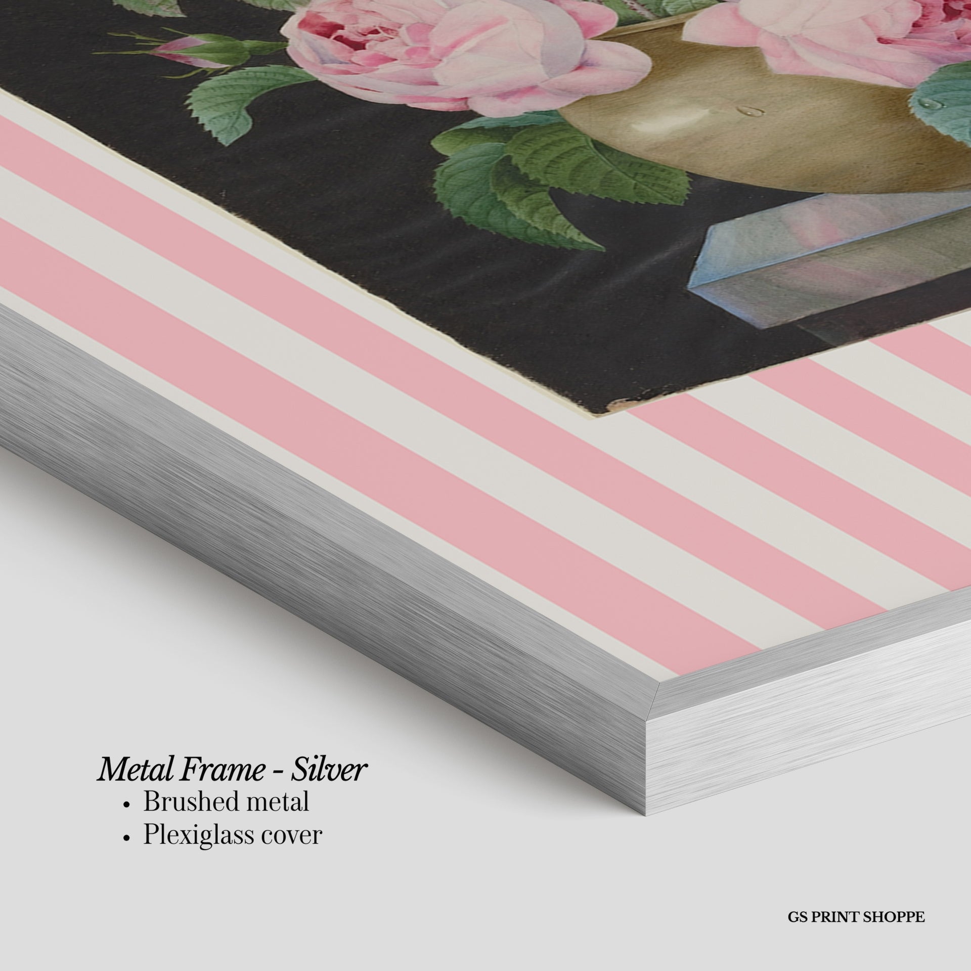 Metal Frame: Sleek and modern, our metal frame is crafted with brushed metal for a polished finish. It comes with durable plexiglass and sturdy metal hangers for horizontal or vertical display.
