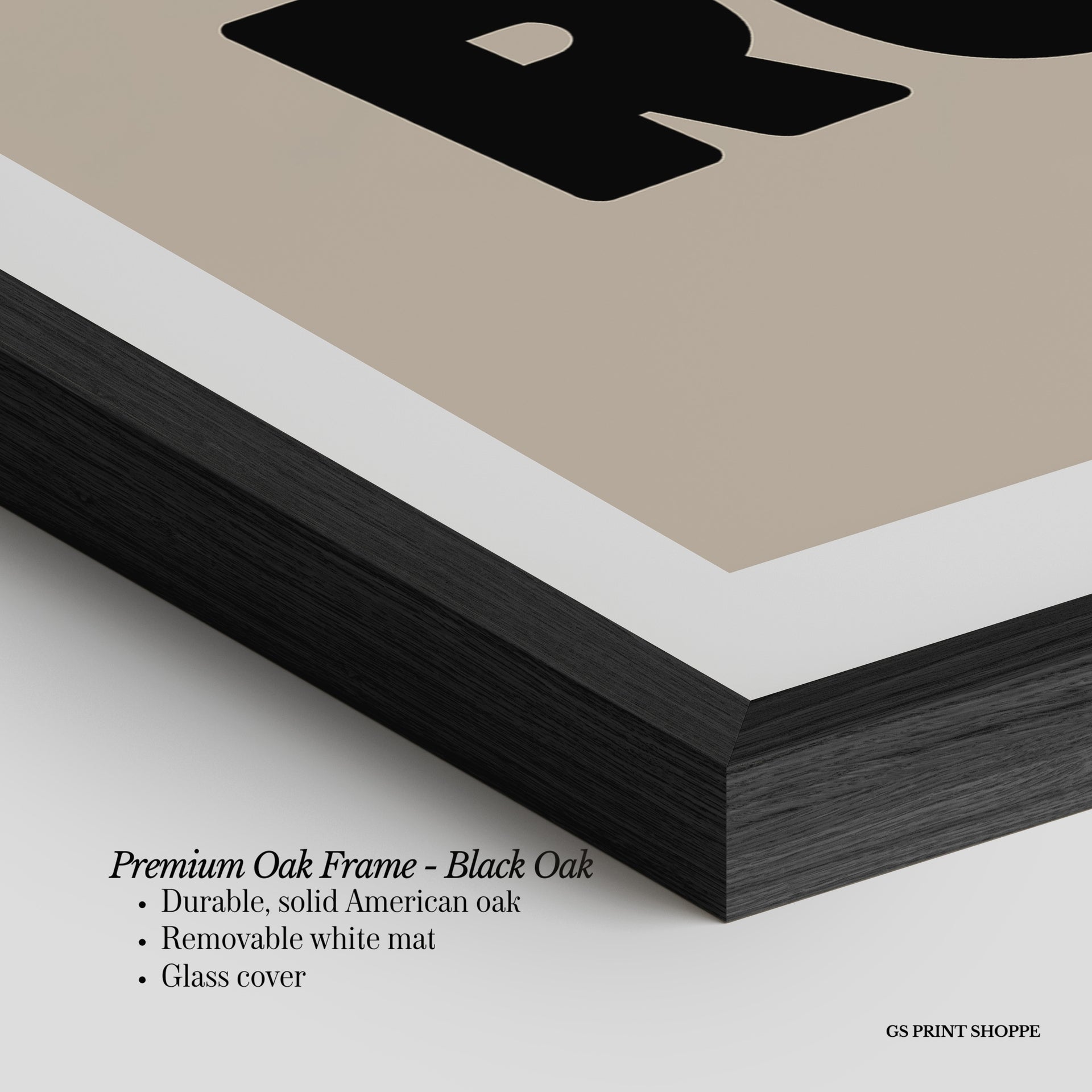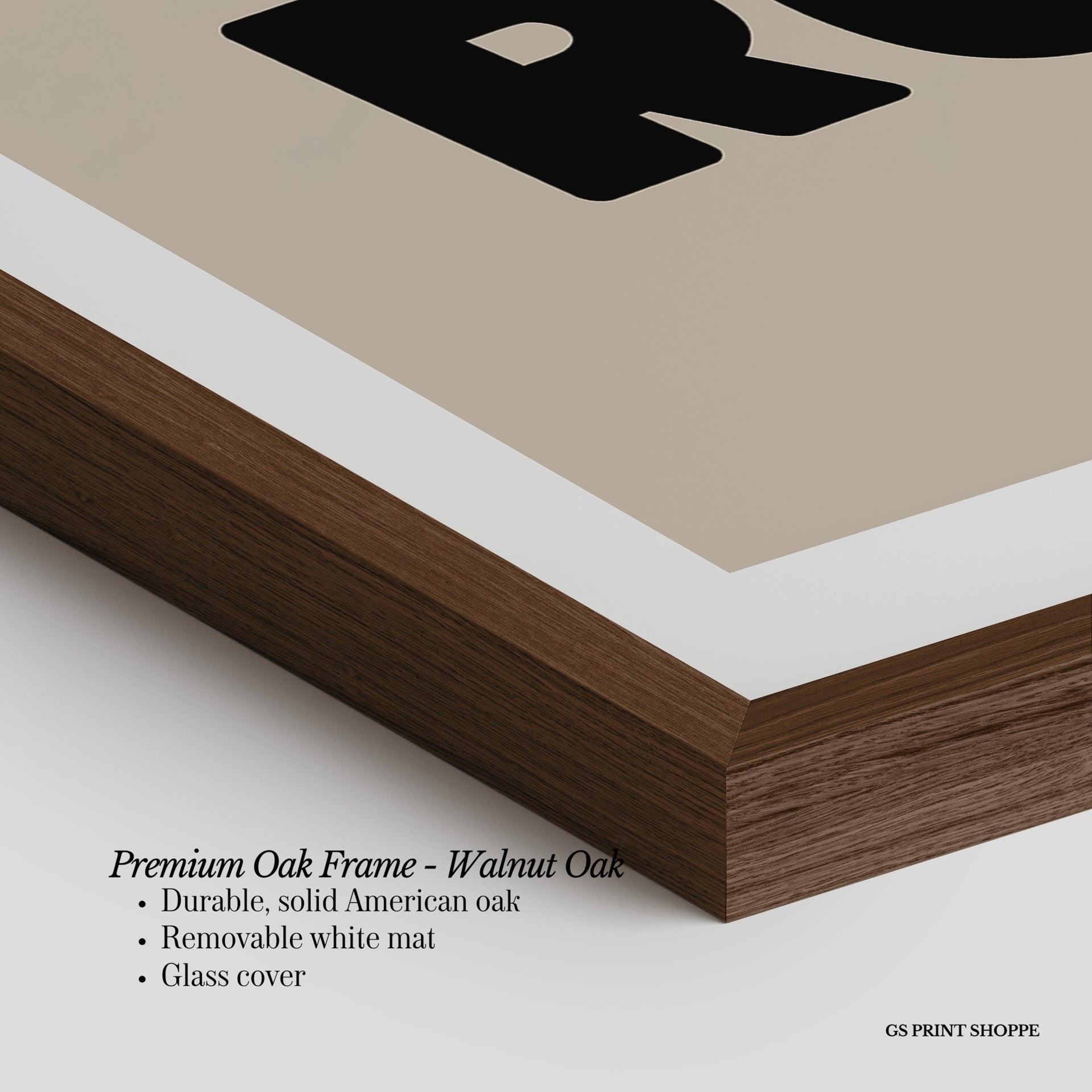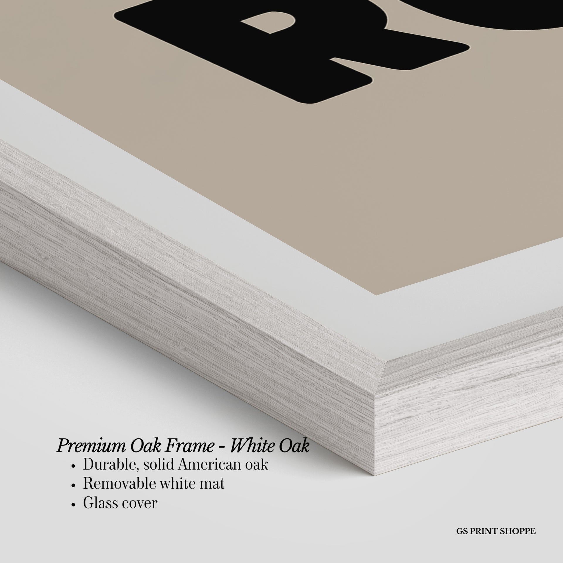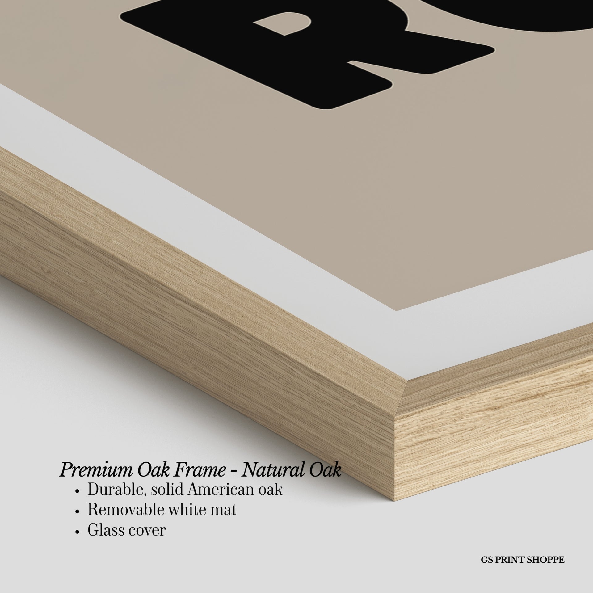 Premium Oak Frame: Our premium oak frame is crafted from solid American oak, offering a warm, natural feel with a high-end finish. We complete this elevated offering with a bright white removable mat and real glass for a versatile and polished look.