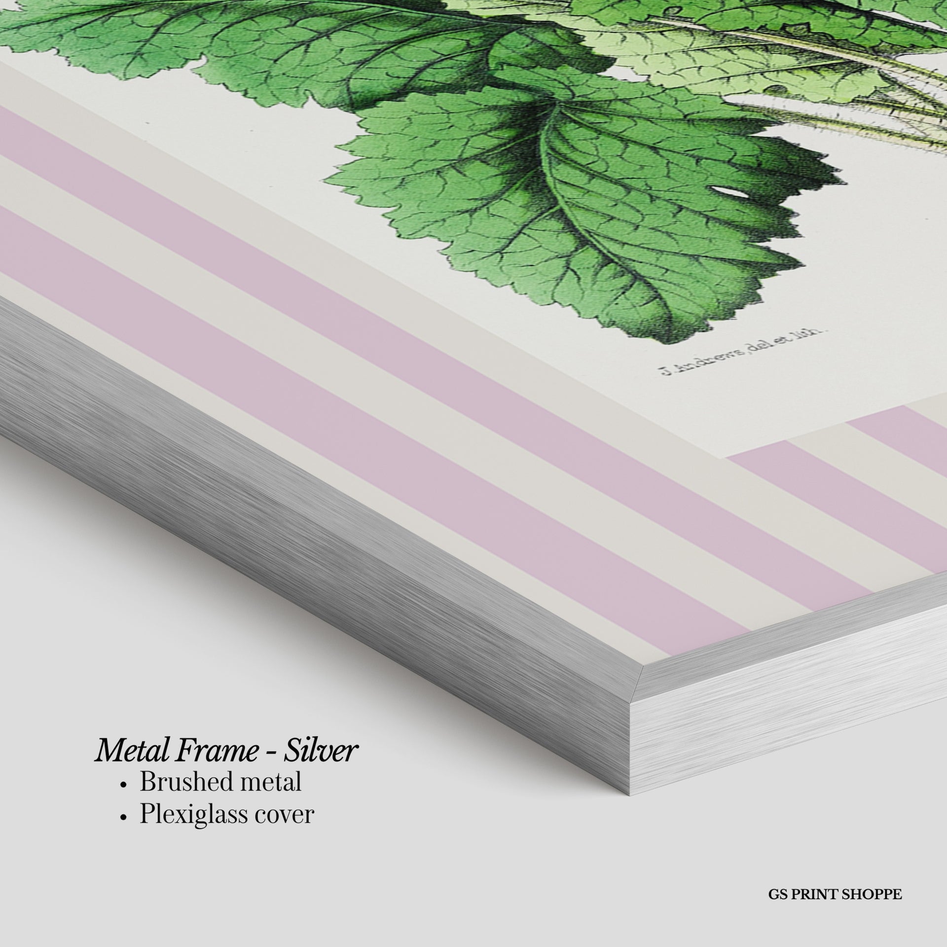 Metal Frame: Sleek and modern, our metal frame is crafted with brushed metal for a polished finish. It comes with durable plexiglass and sturdy metal hangers for horizontal or vertical display.
