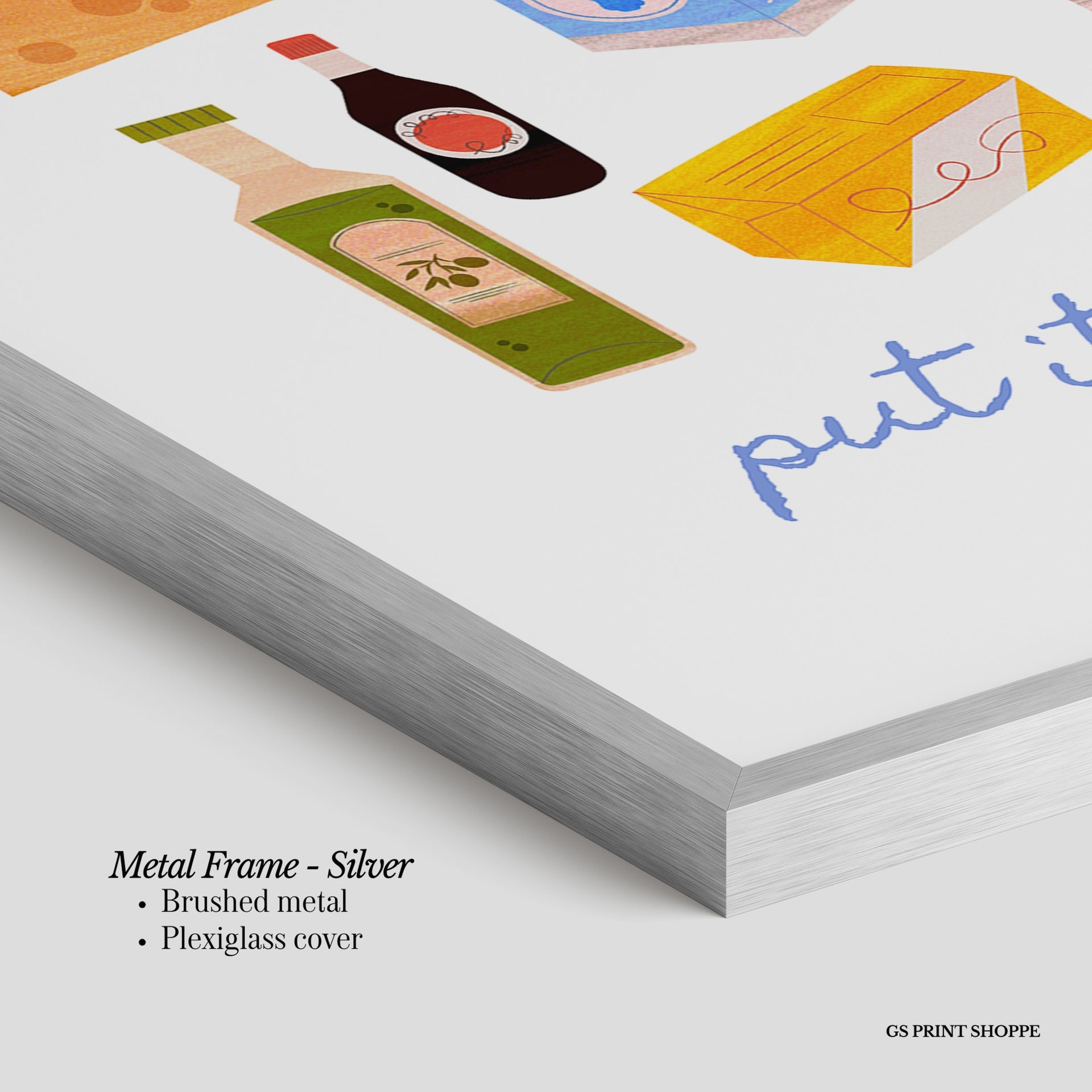 Metal Frame: Sleek and modern, our metal frame is crafted with brushed metal for a polished finish. It comes with durable plexiglass and sturdy metal hangers for horizontal or vertical display.