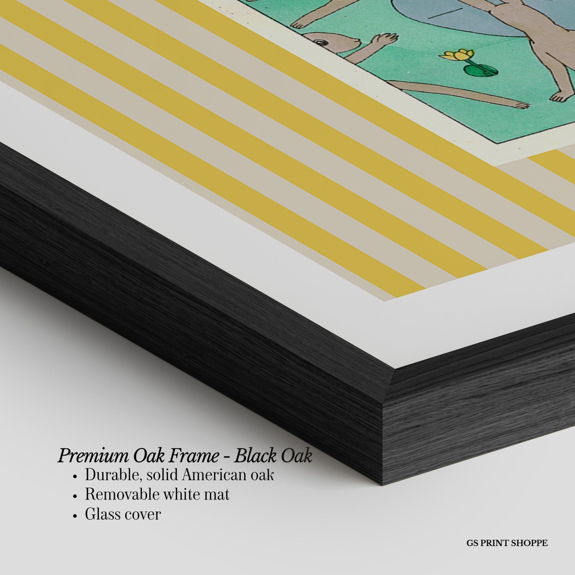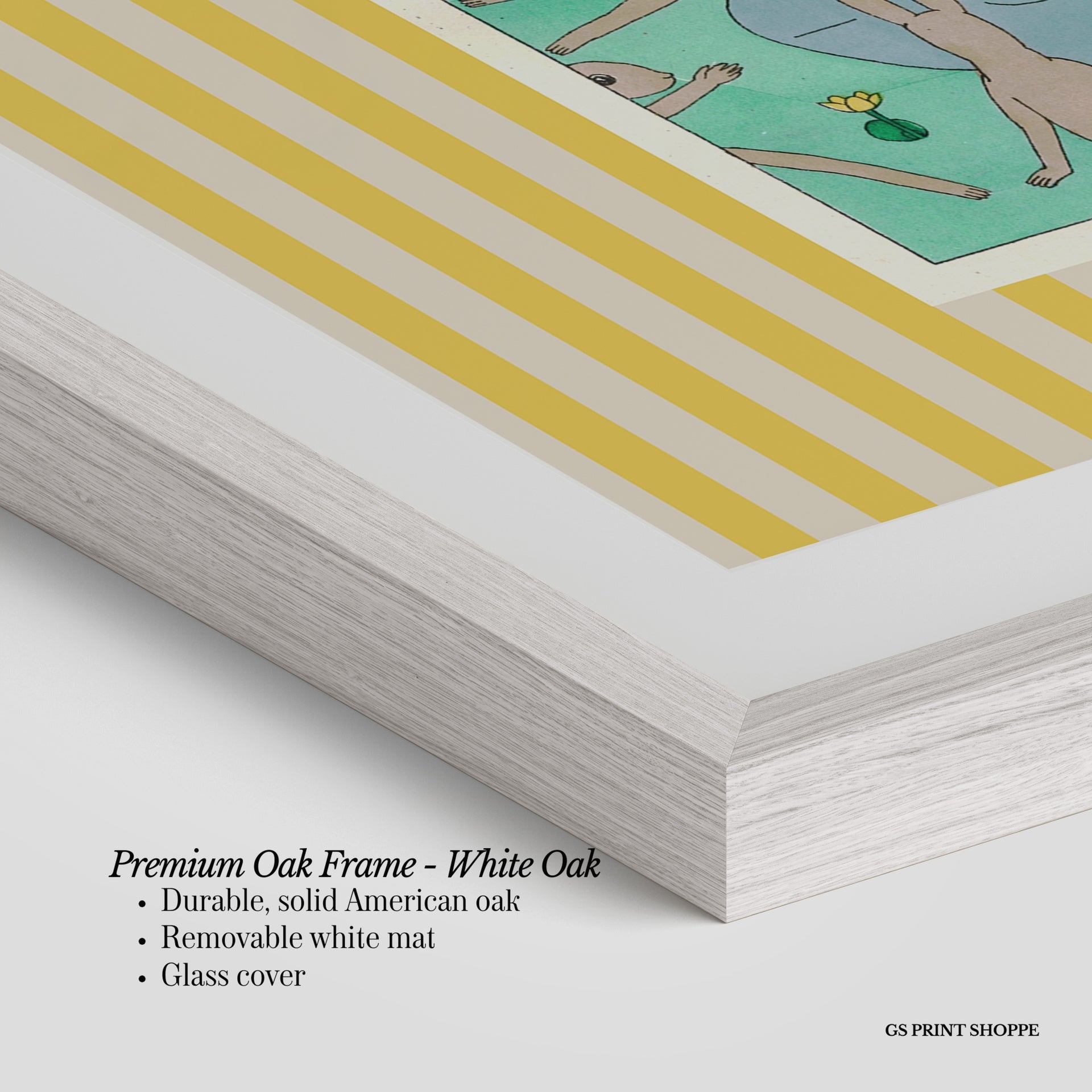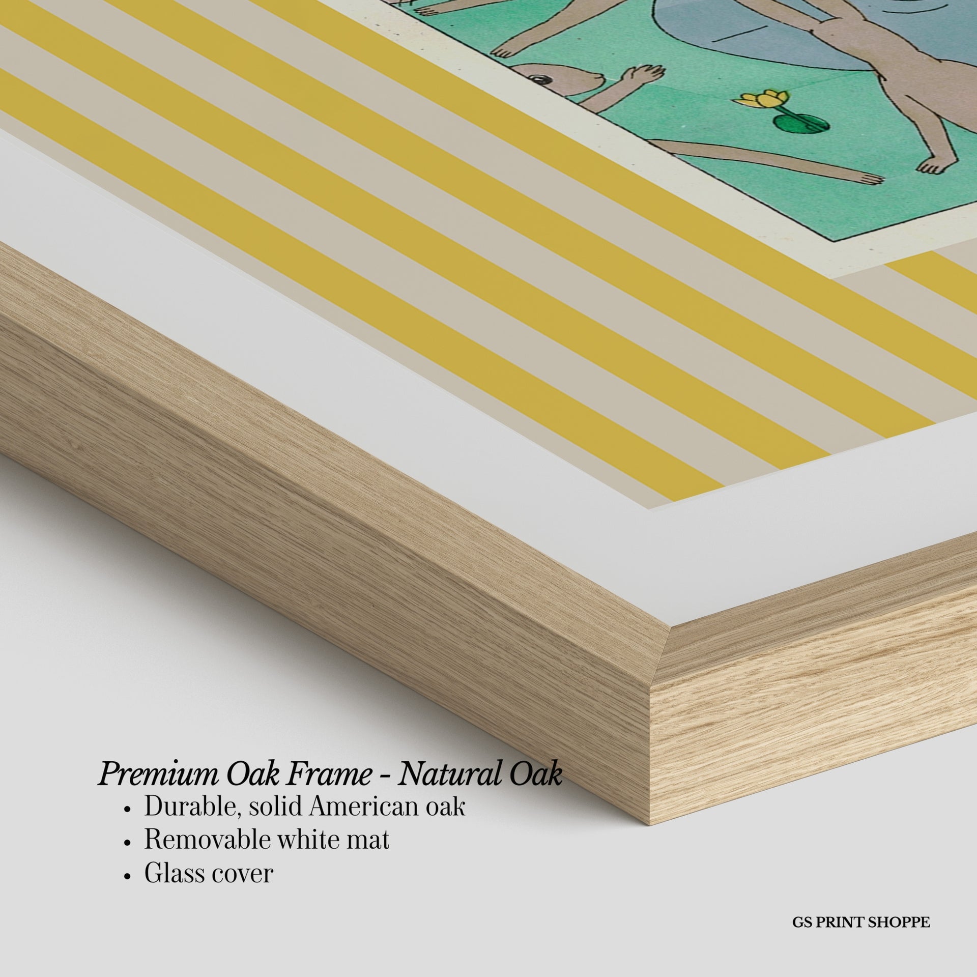 Premium Oak Frame: Our premium oak frame is crafted from solid American oak, offering a warm, natural feel with a high-end finish. We complete this elevated offering with a bright white removable mat and real glass for a versatile and polished look.