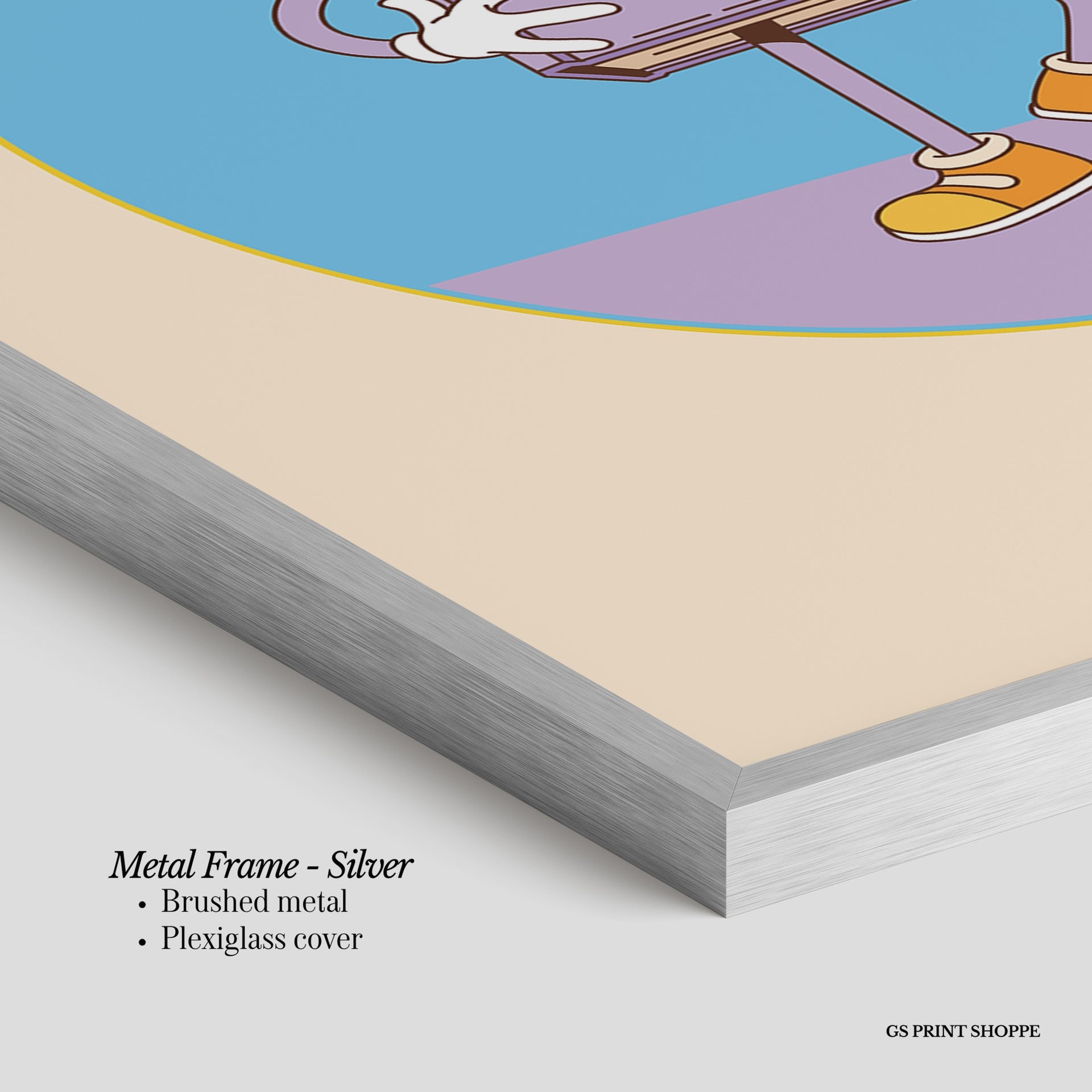 Metal Frame: Sleek and modern, our metal frame is crafted with brushed metal for a polished finish. It comes with durable plexiglass and sturdy metal hangers for horizontal or vertical display.