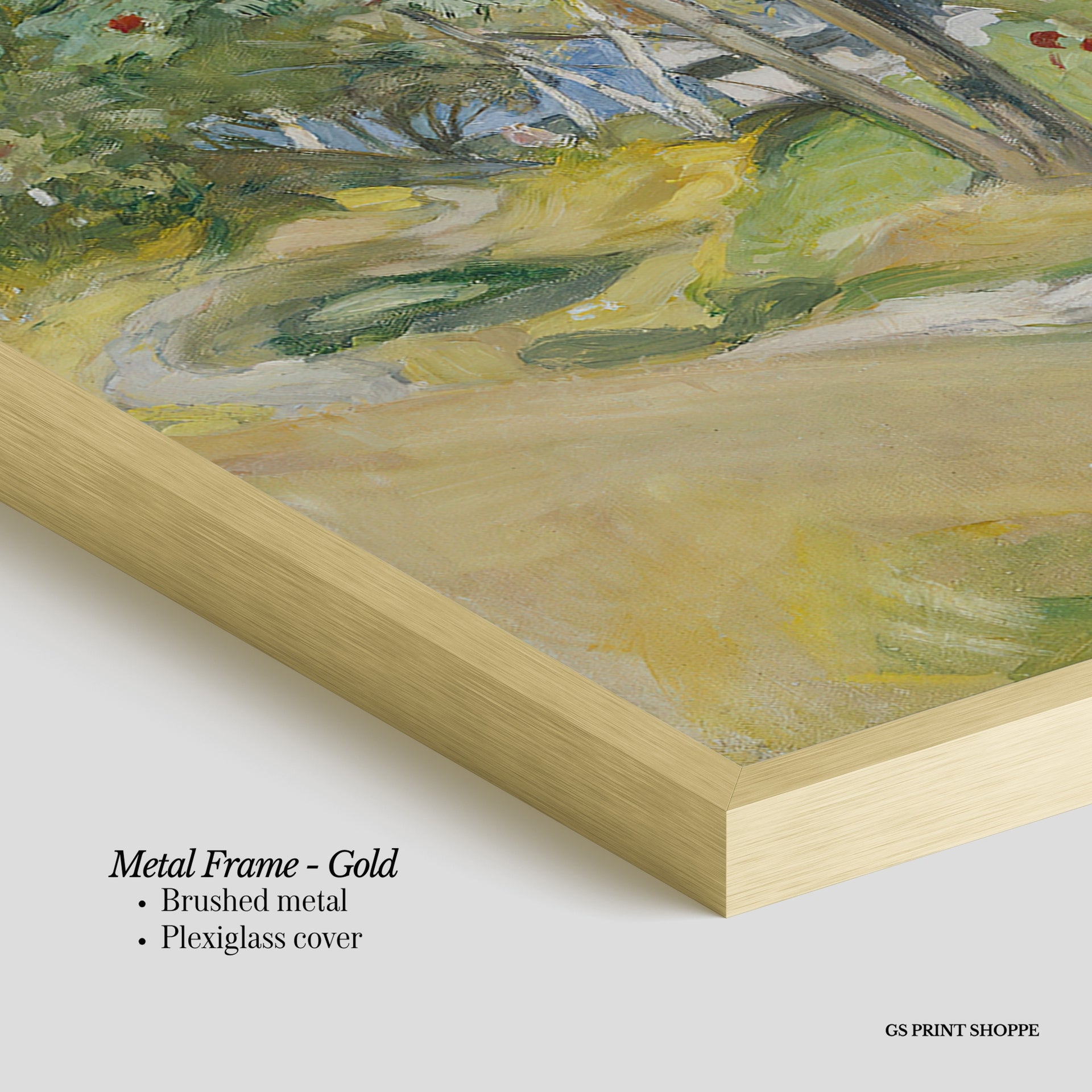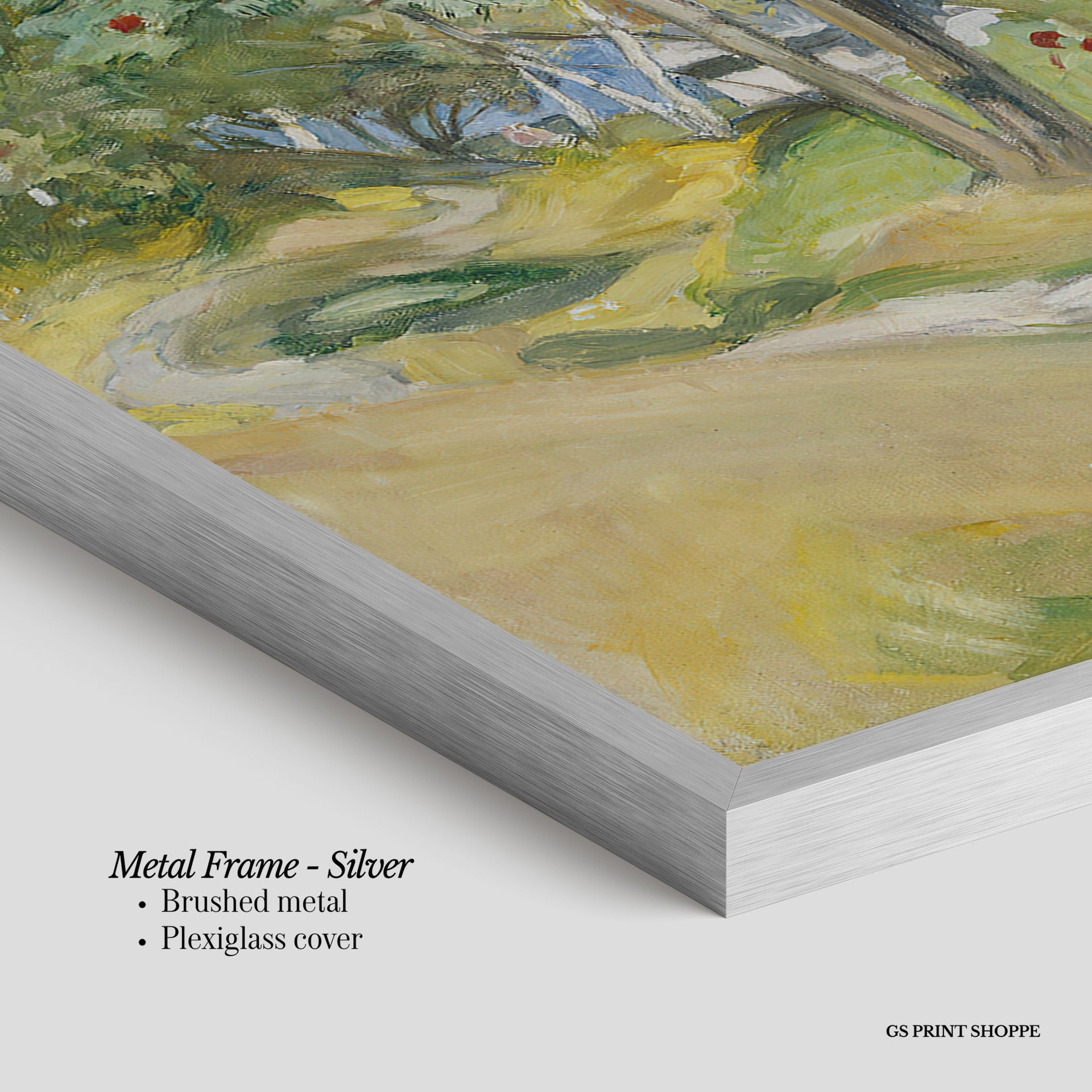 Metal Frame: Sleek and modern, our metal frame is crafted with brushed metal for a polished finish. It comes with durable plexiglass and sturdy metal hangers for horizontal or vertical display.