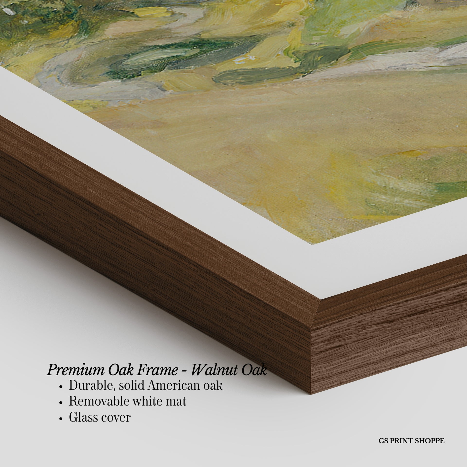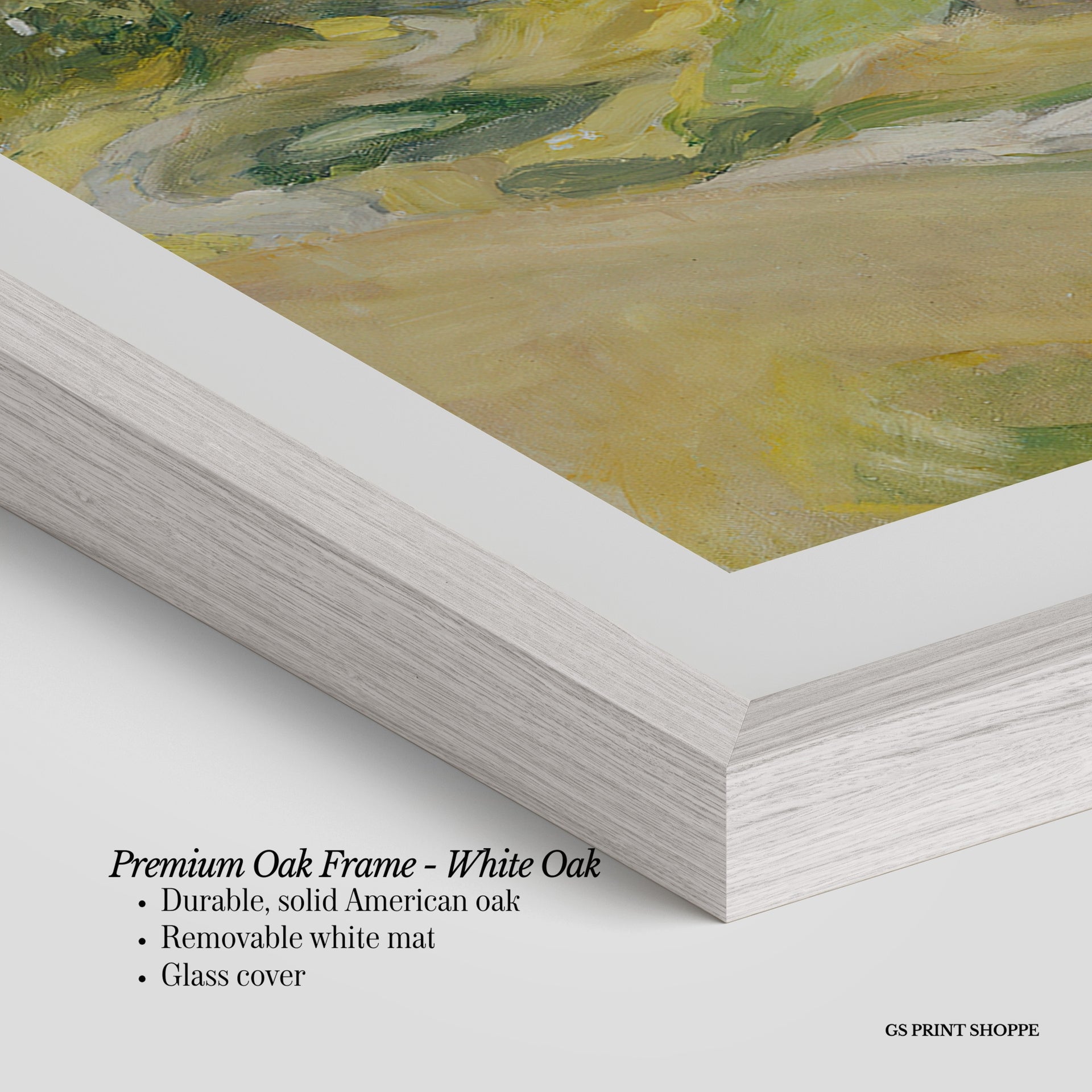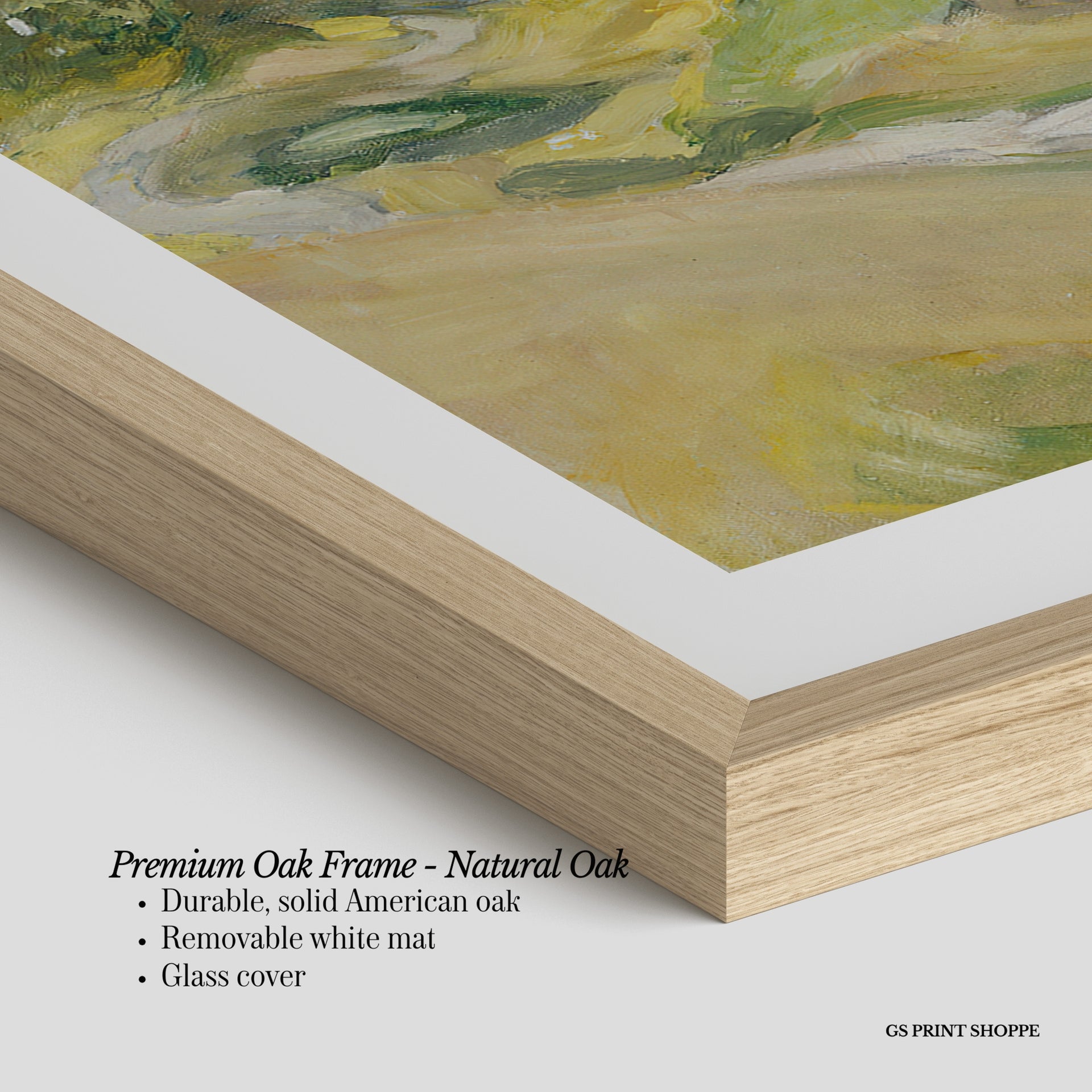 Premium Oak Frame: Our premium oak frame is crafted from solid American oak, offering a warm, natural feel with a high-end finish. We complete this elevated offering with a bright white removable mat and real glass for a versatile and polished look.