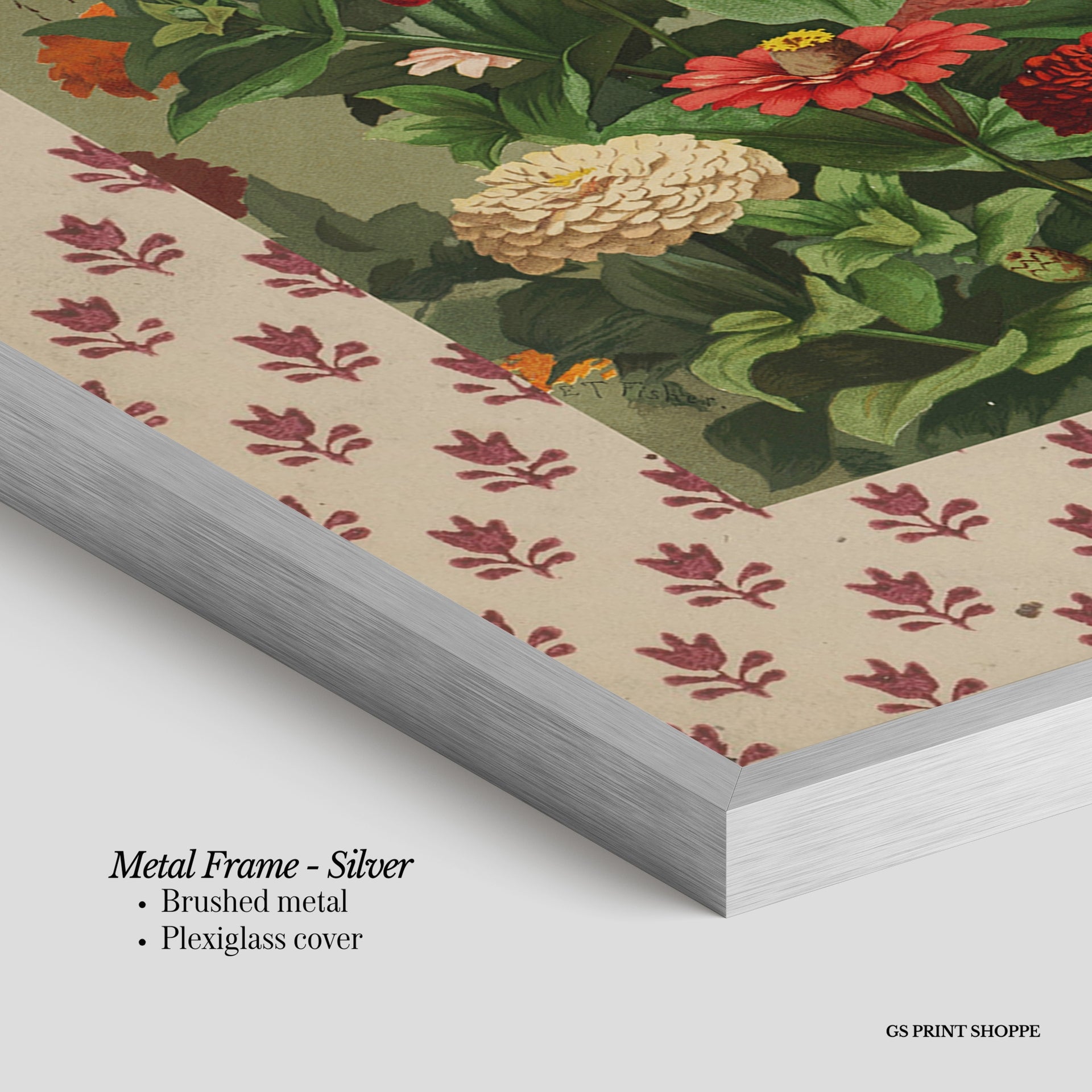 Metal Frame: Sleek and modern, our metal frame is crafted with brushed metal for a polished finish. It comes with durable plexiglass and sturdy metal hangers for horizontal or vertical display.