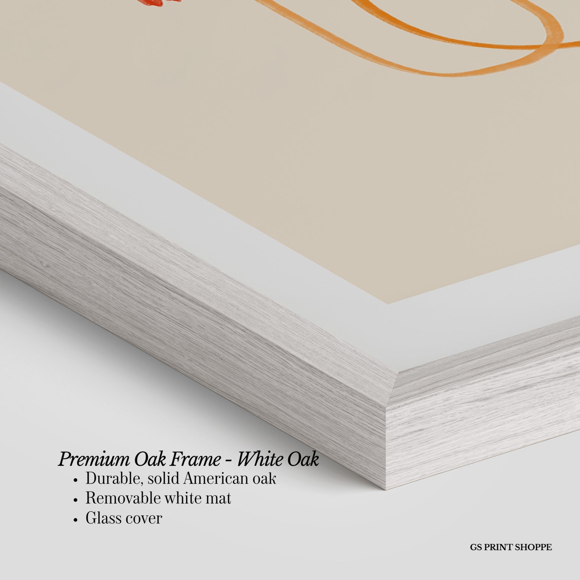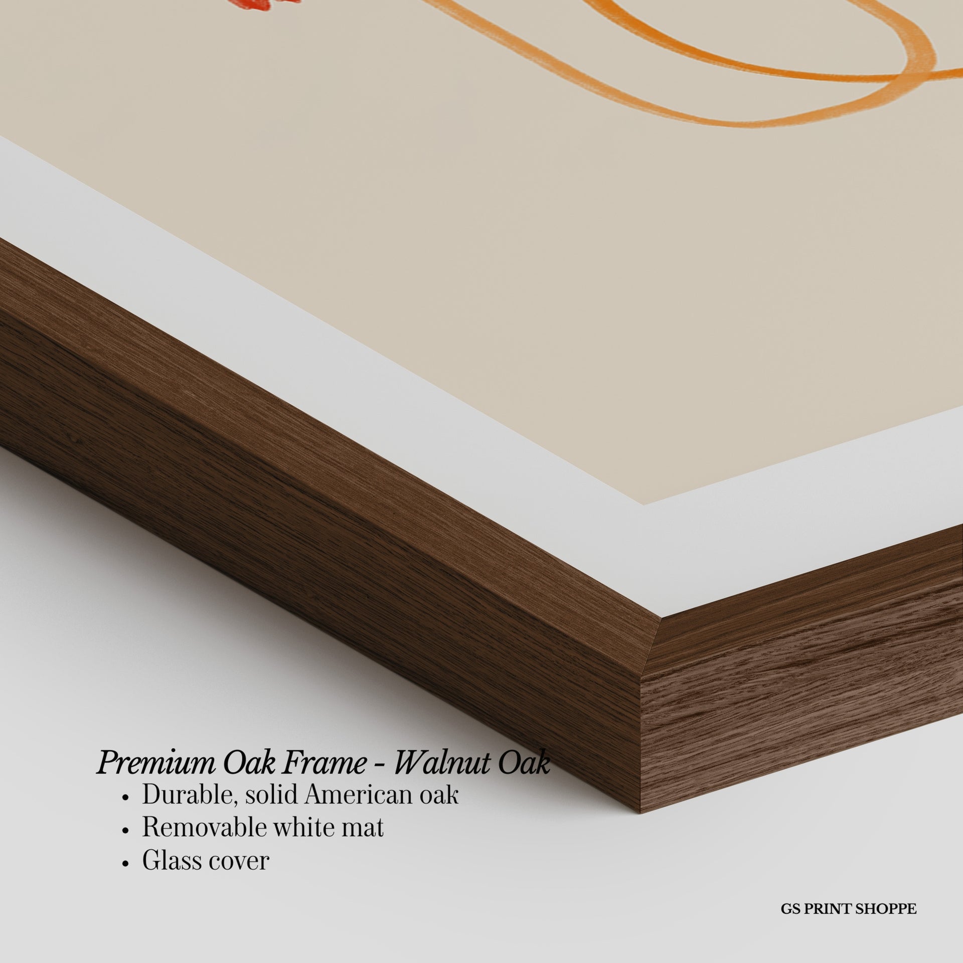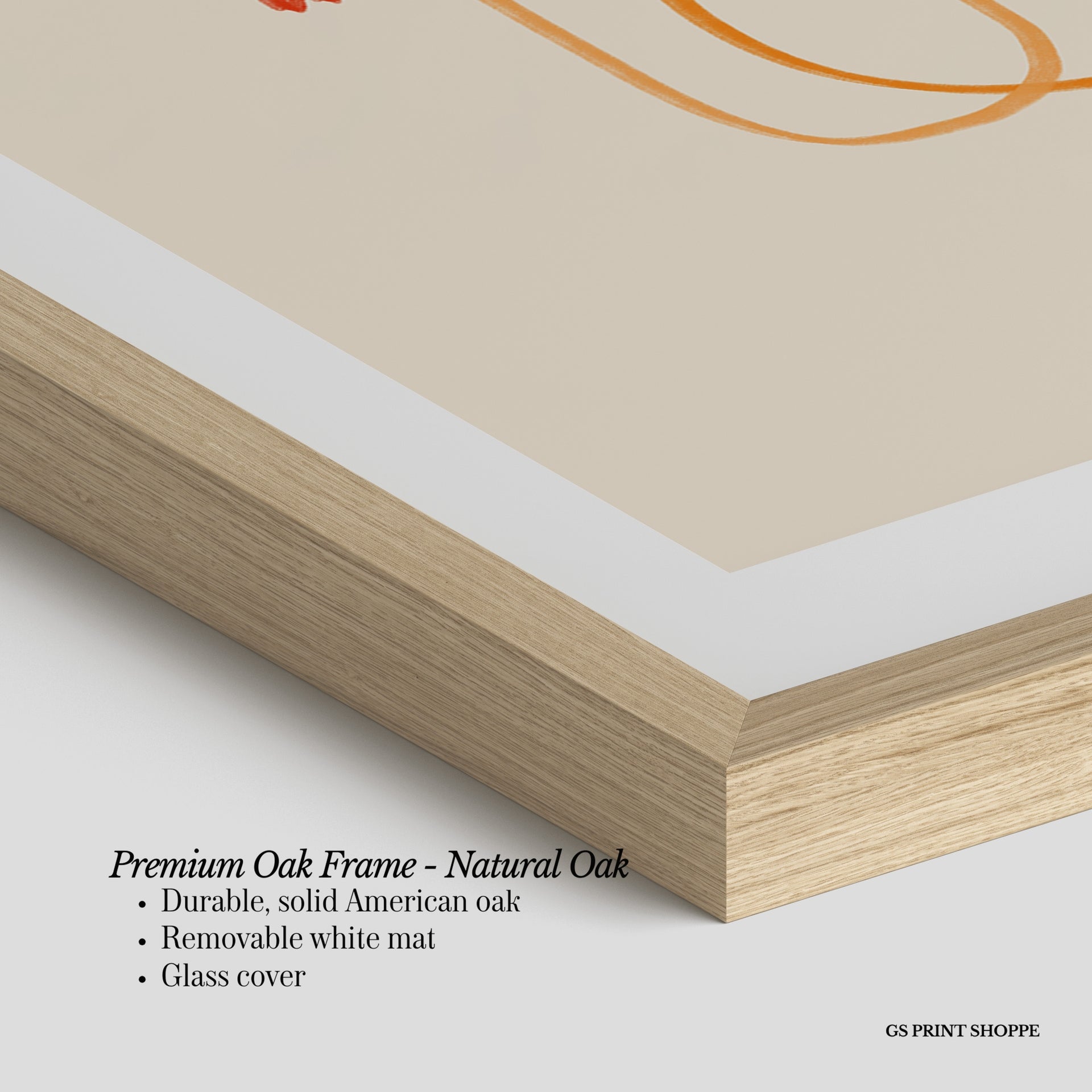 Premium Oak Frame: Our premium oak frame is crafted from solid American oak, offering a warm, natural feel with a high-end finish. We complete this elevated offering with a bright white removable mat and real glass for a versatile and polished look.