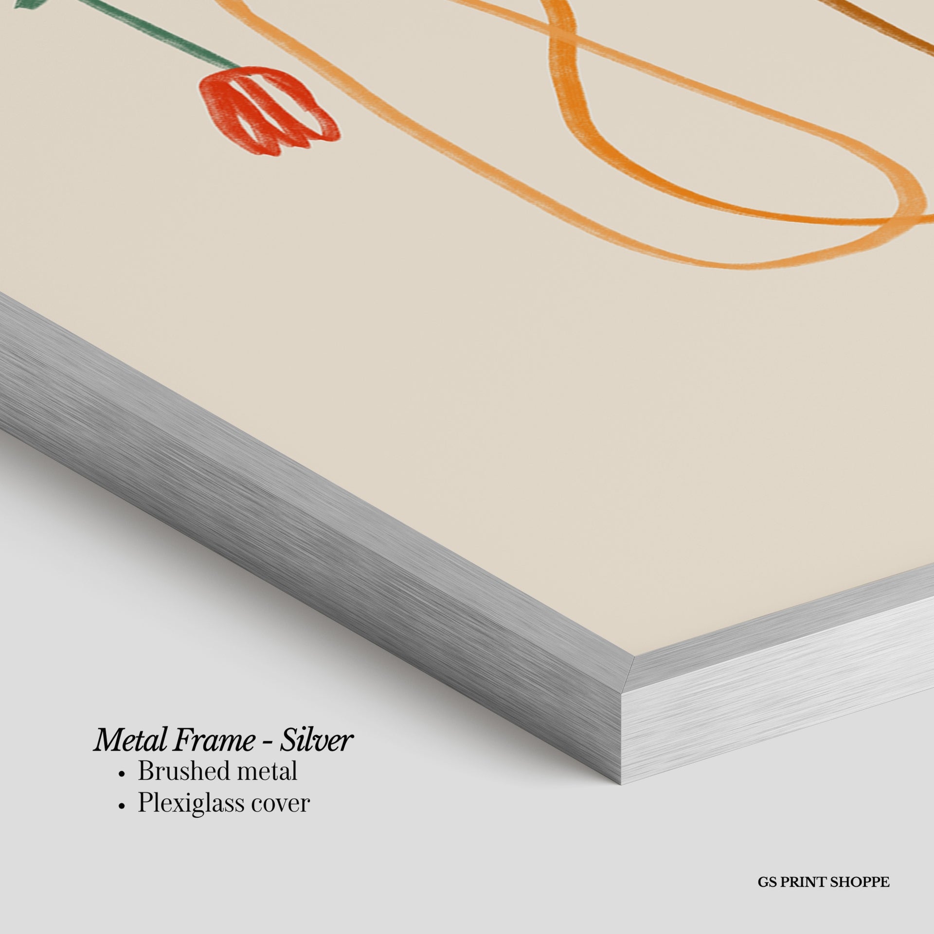 Metal Frame: Sleek and modern, our metal frame is crafted with brushed metal for a polished finish. It comes with durable plexiglass and sturdy metal hangers for horizontal or vertical display.