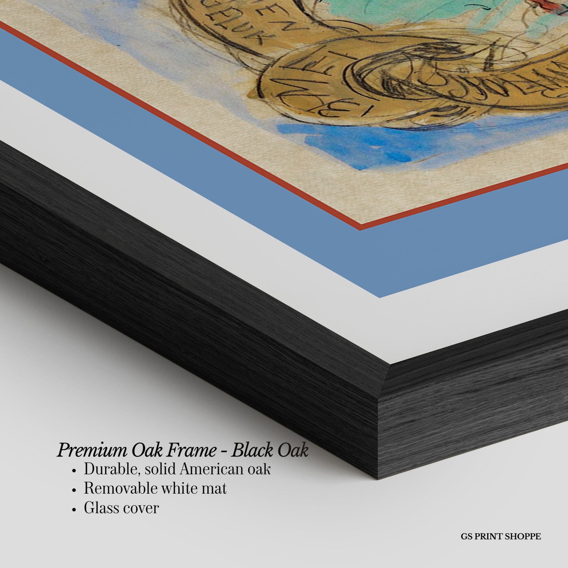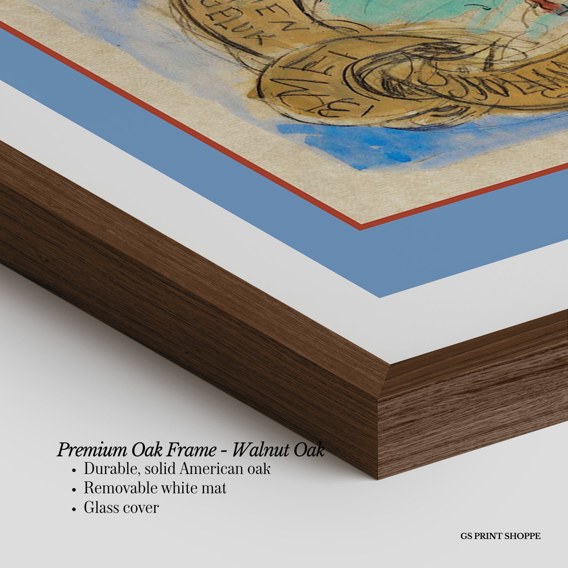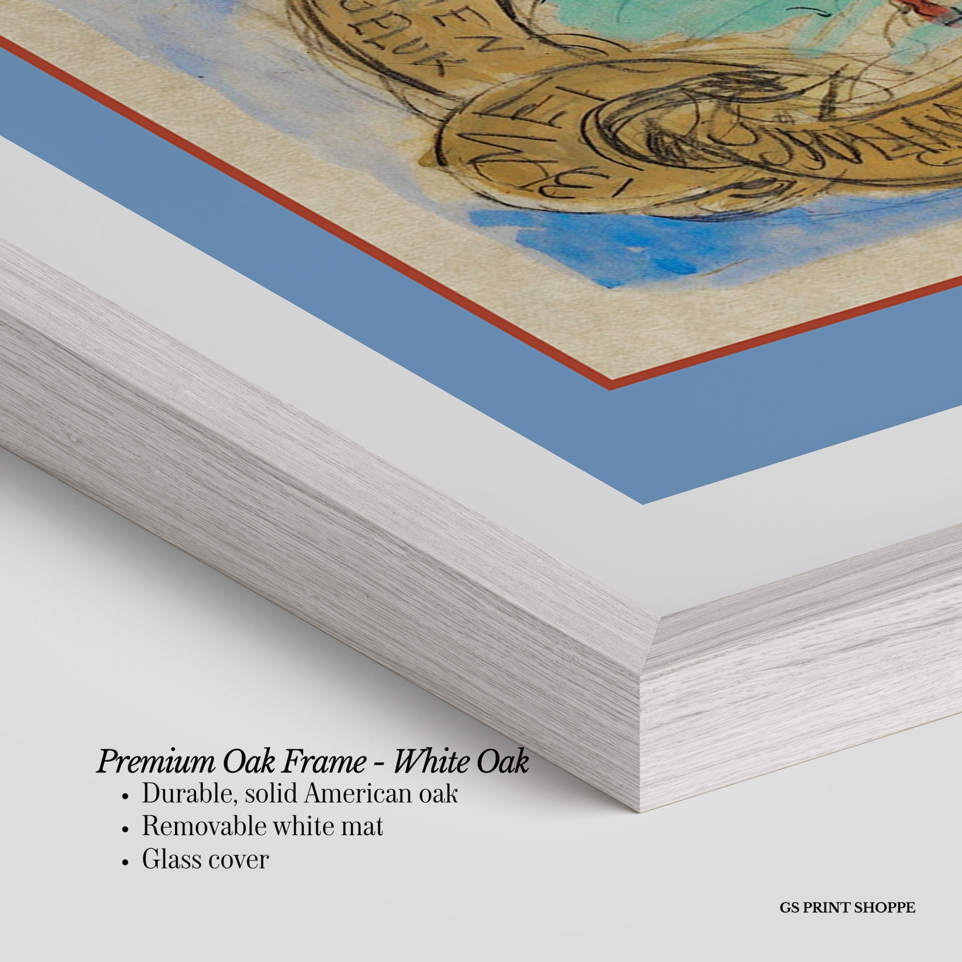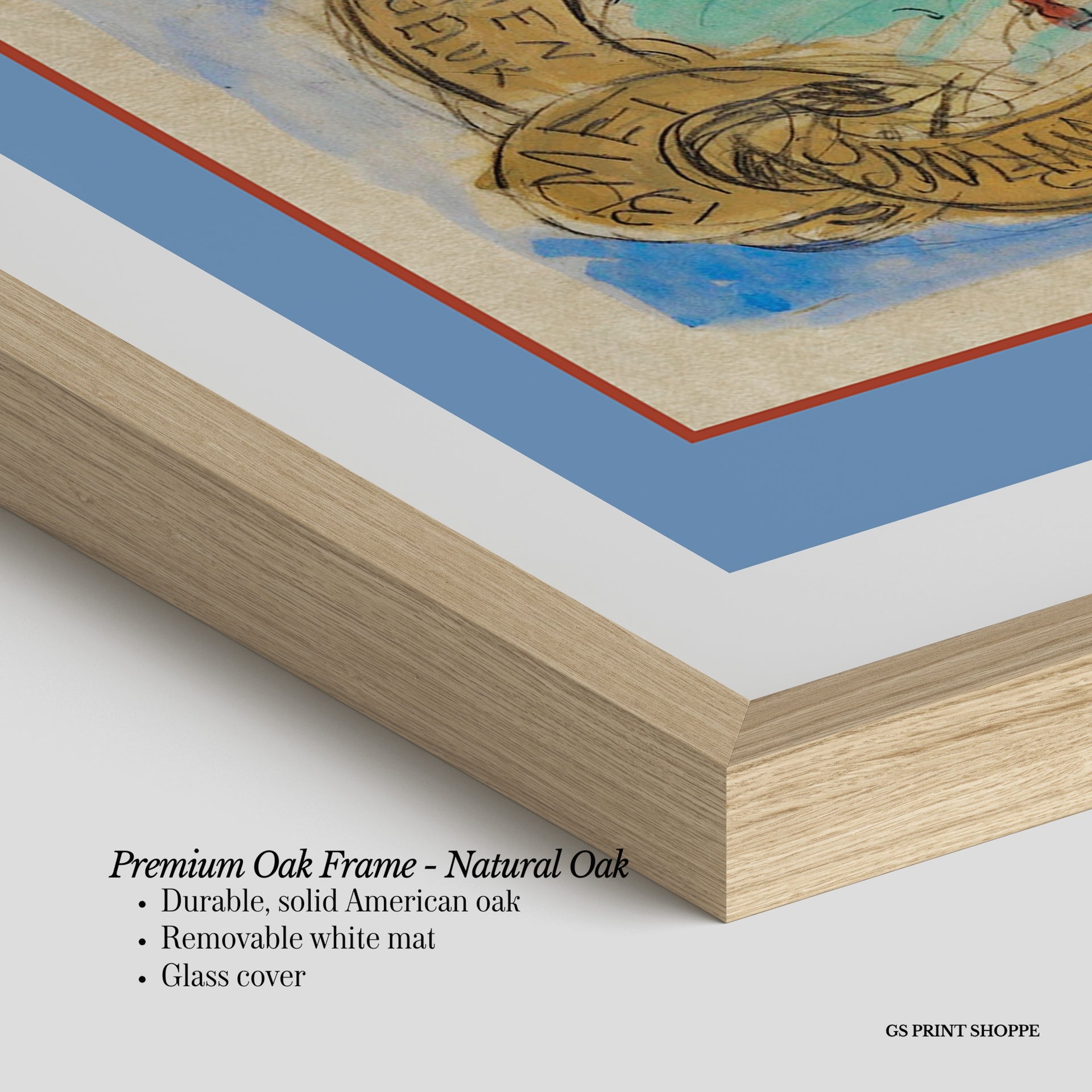 Premium Oak Frame: Our premium oak frame is crafted from solid American oak, offering a warm, natural feel with a high-end finish. We complete this elevated offering with a bright white removable mat and real glass for a versatile and polished look.