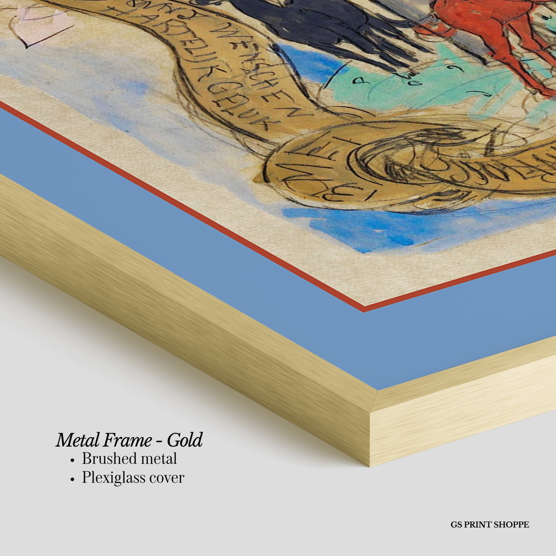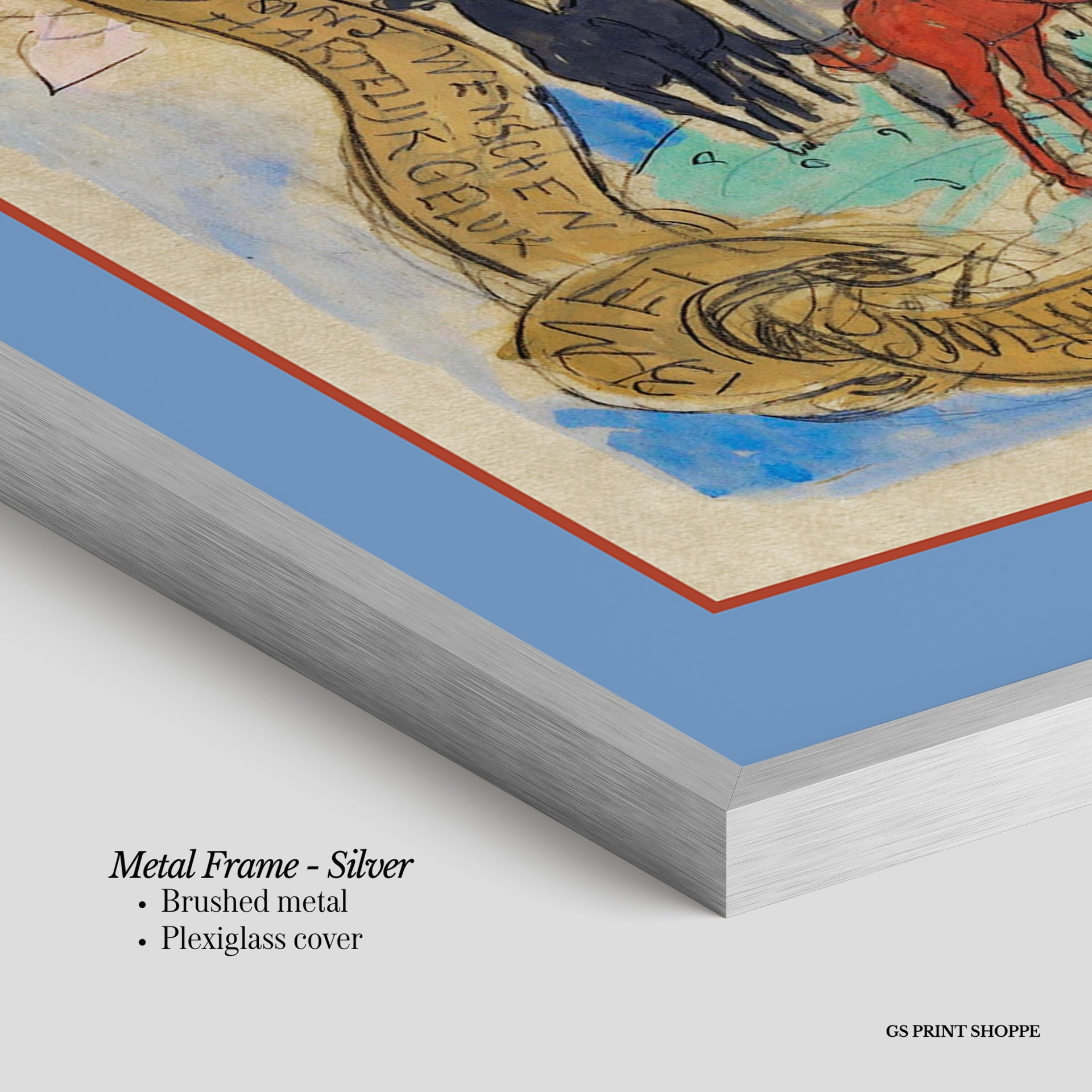 Metal Frame: Sleek and modern, our metal frame is crafted with brushed metal for a polished finish. It comes with durable plexiglass and sturdy metal hangers for horizontal or vertical display.