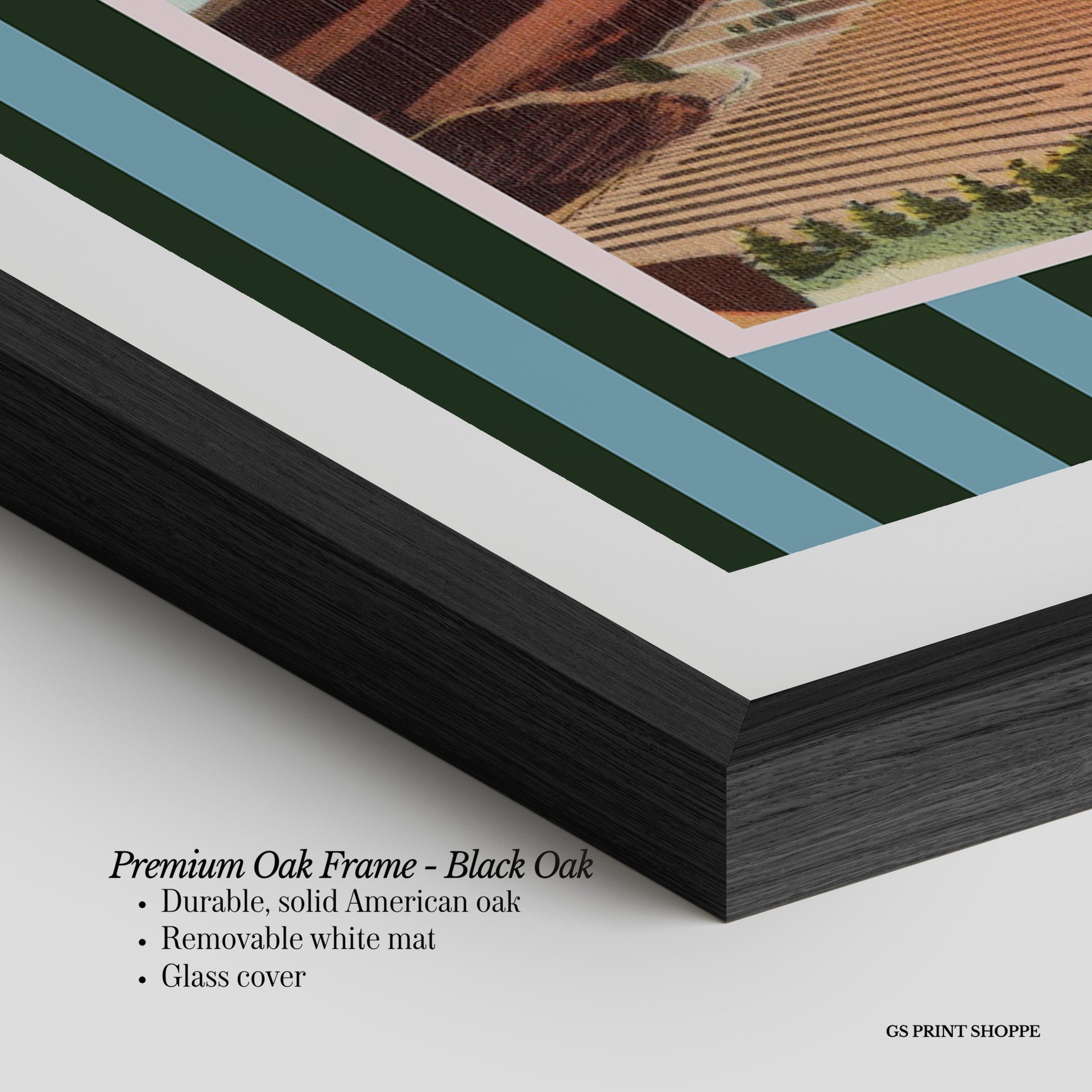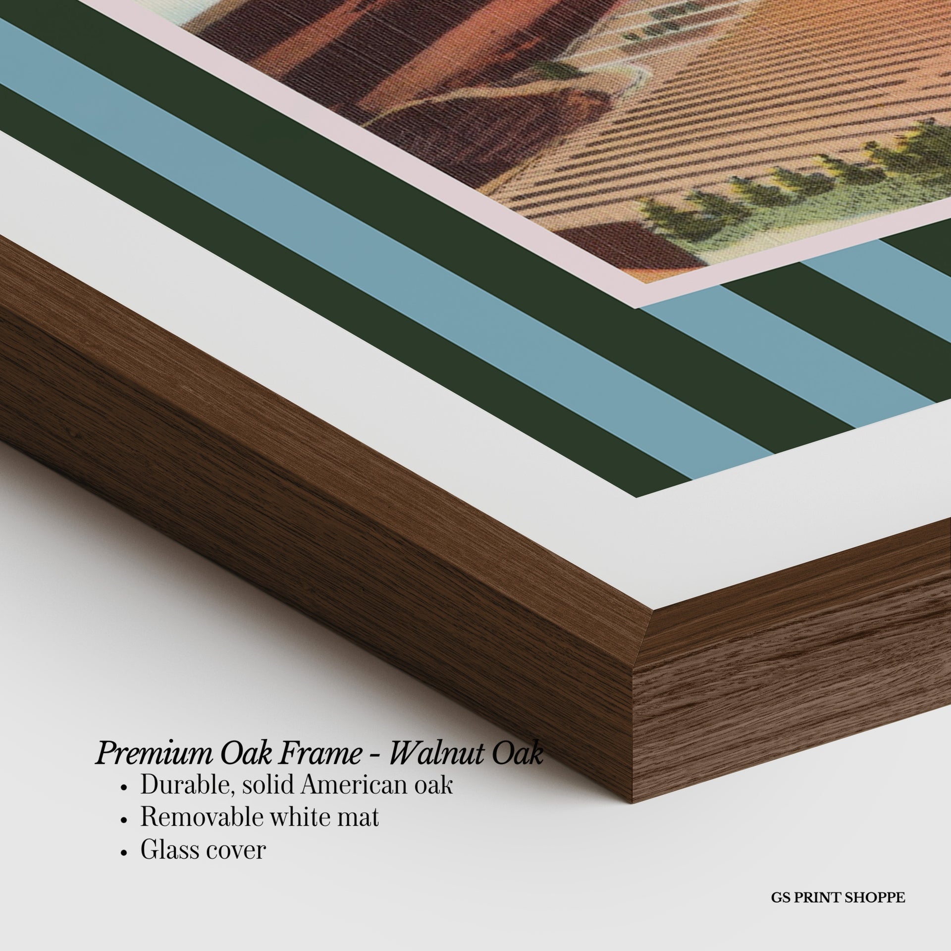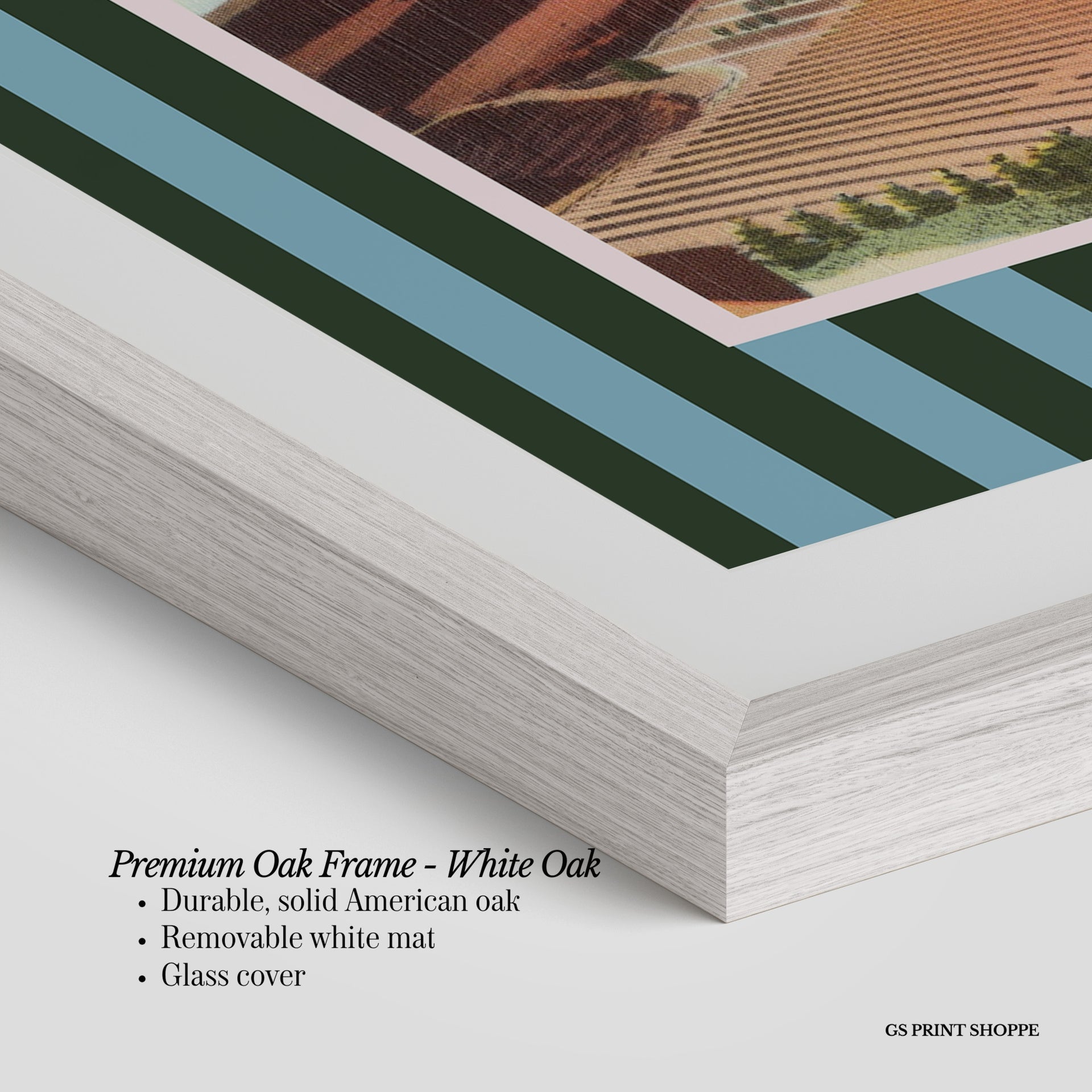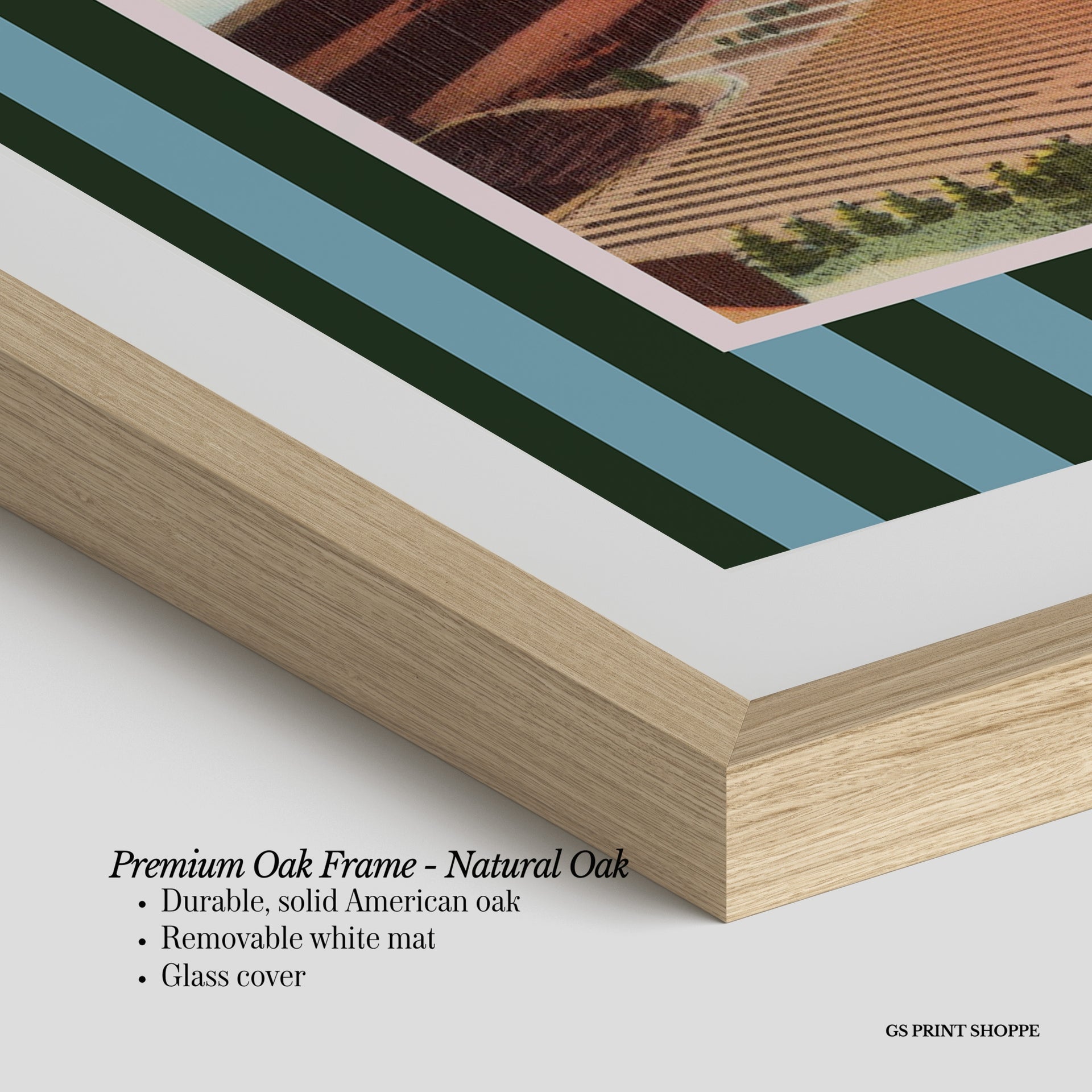 Premium Oak Frame: Our premium oak frame is crafted from solid American oak, offering a warm, natural feel with a high-end finish. We complete this elevated offering with a bright white removable mat and real glass for a versatile and polished look.
