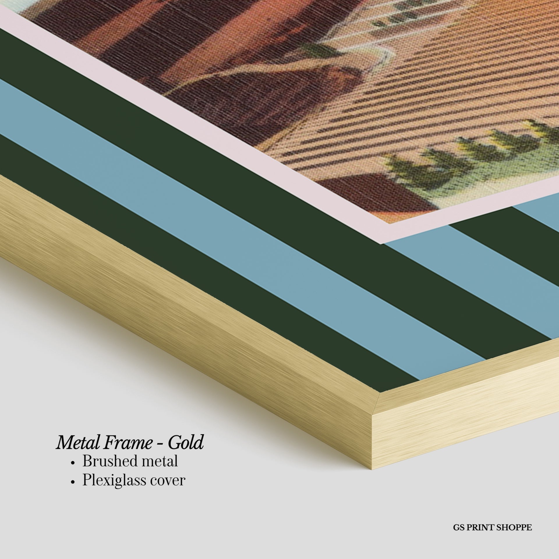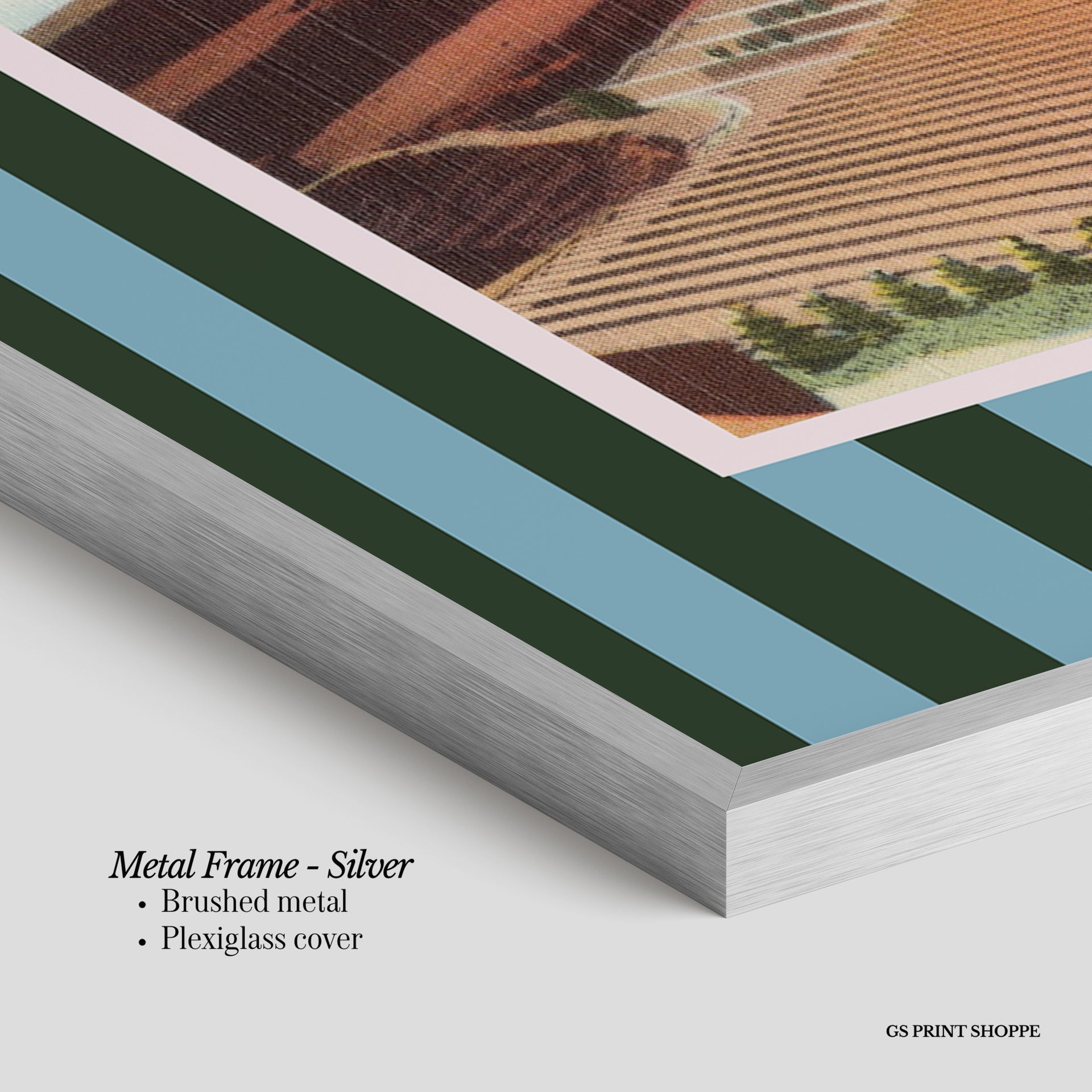 Metal Frame: Sleek and modern, our metal frame is crafted with brushed metal for a polished finish. It comes with durable plexiglass and sturdy metal hangers for horizontal or vertical display.