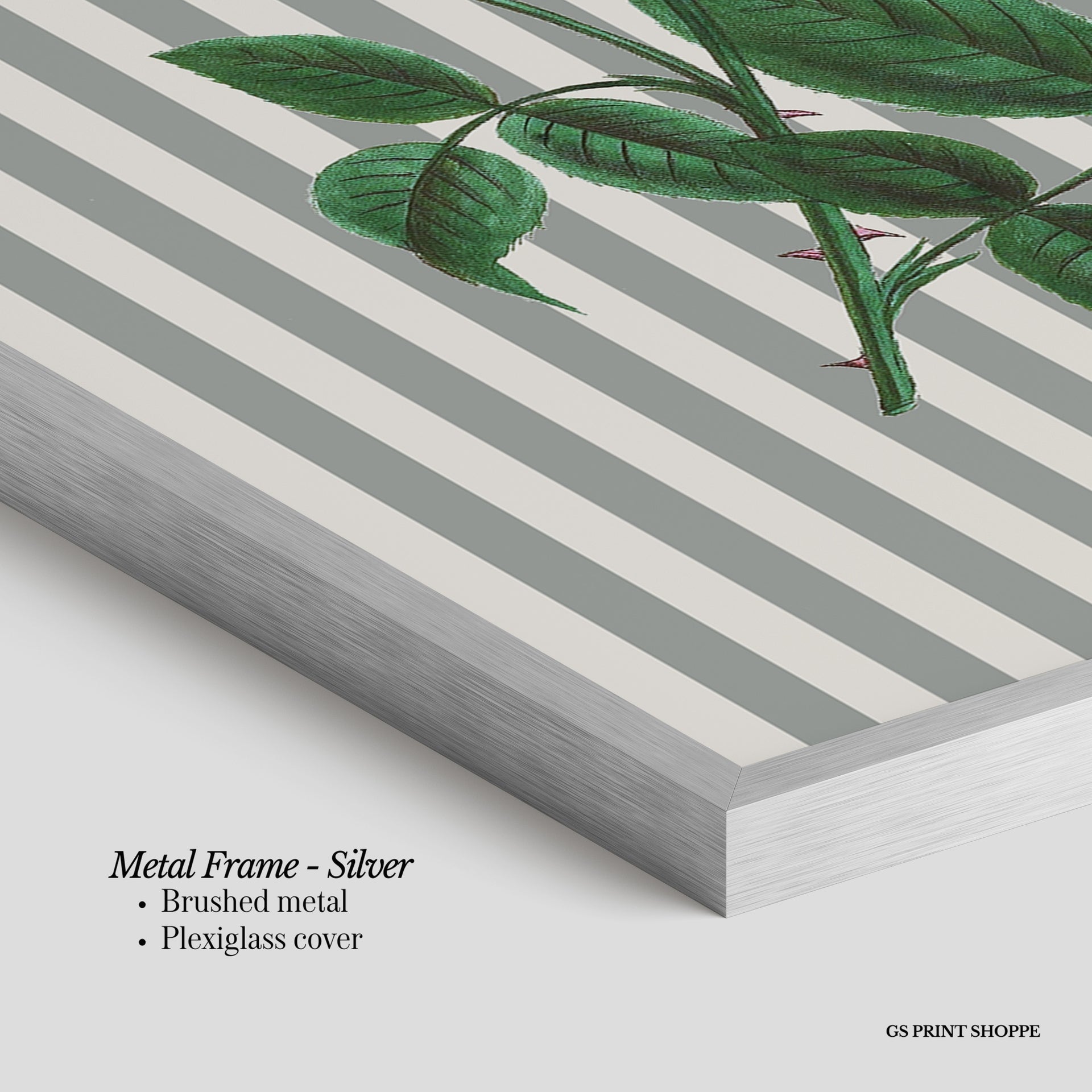 Metal Frame: Sleek and modern, our metal frame is crafted with brushed metal for a polished finish. It comes with durable plexiglass and sturdy metal hangers for horizontal or vertical display.